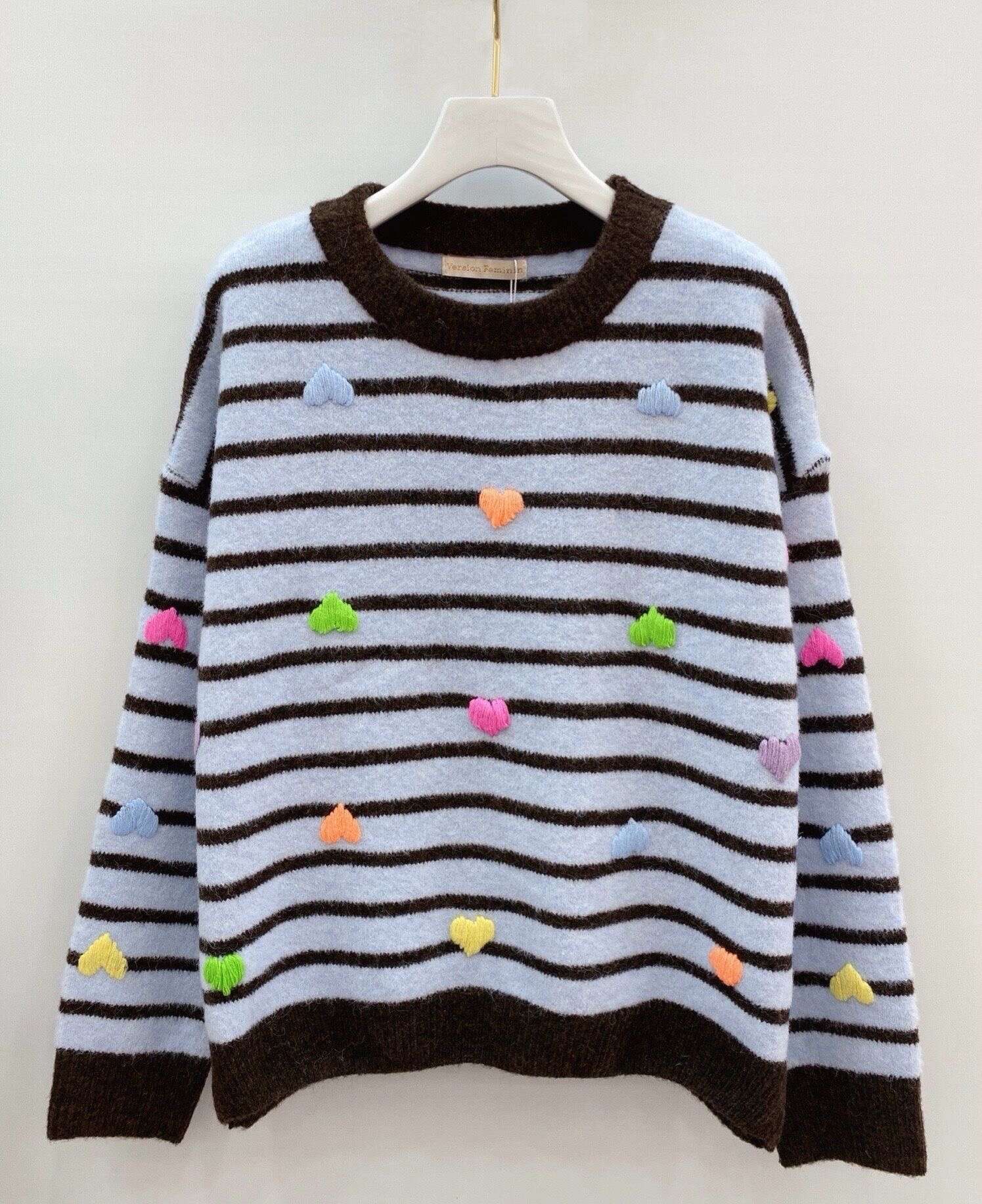 Sweter o luźnym kroju z miękkiej dzianiny, w modne pasy i kolorowe aplikacje w kształcie serduszek.