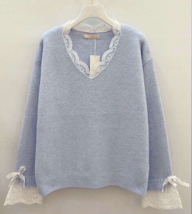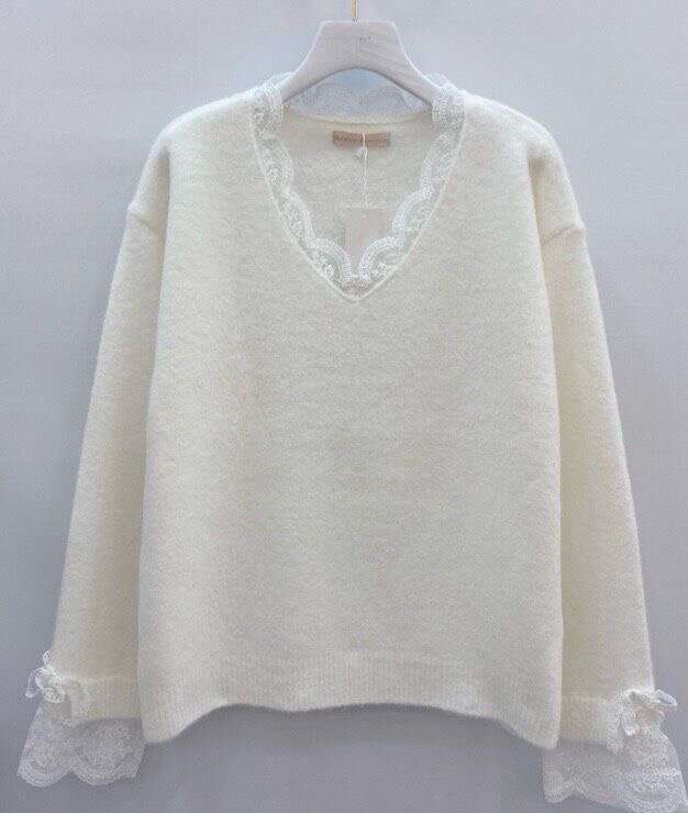 Sweter o luźnym kroju z koronką przy dekolcie i mankietach, który łączy miękkość materiału z kobiecym detalem.
