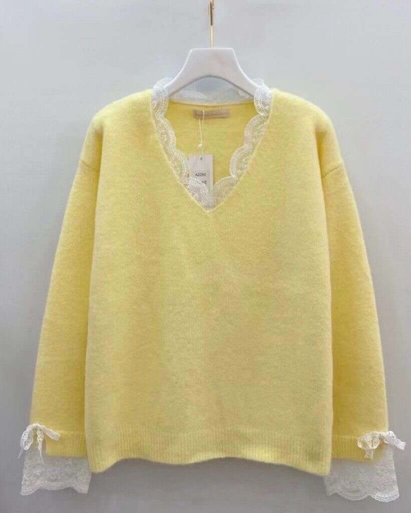 Sweter o luźnym kroju z koronką przy dekolcie i mankietach, który łączy miękkość materiału z kobiecym detalem.