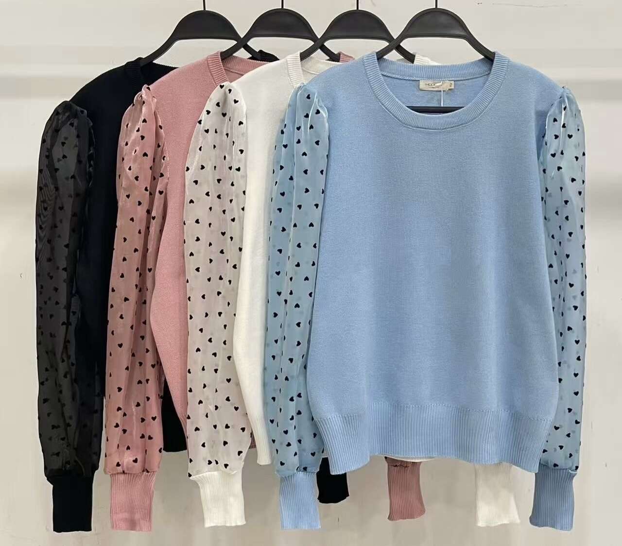 Oferujemy wyjątkową bluzkę damską, która zachwyca detalami oraz wygodą noszenia. Dostępna w czterech modnych kolorach: różowym, czarnym, błękitnym i białym. Transparentne rękawy z uroczym wzorem serduszek dodają lekkości i dziewczęcego wdzięku, a miękki materiał zapewnia komfort przez cały dzień. Bluzka doskonale sprawdzi się zarówno w codziennych, jak i bardziej eleganckich stylizacjach, pasuje do spódnic, jeansów i spodni materiałowych. Idealna propozycja do sprzedaży hurtowej – to bestsellerowy model, który przyciągnie uwagę każdej klientki poszukującej modnych nowości w asortymencie.