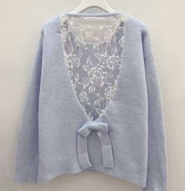 Stylowy sweter z głębokim dekoltem ozdobionym koronkową wstawką oraz subtelną kokardą. Miękki materiał, kobiecy charakter, komfortowy krój.