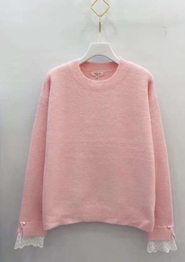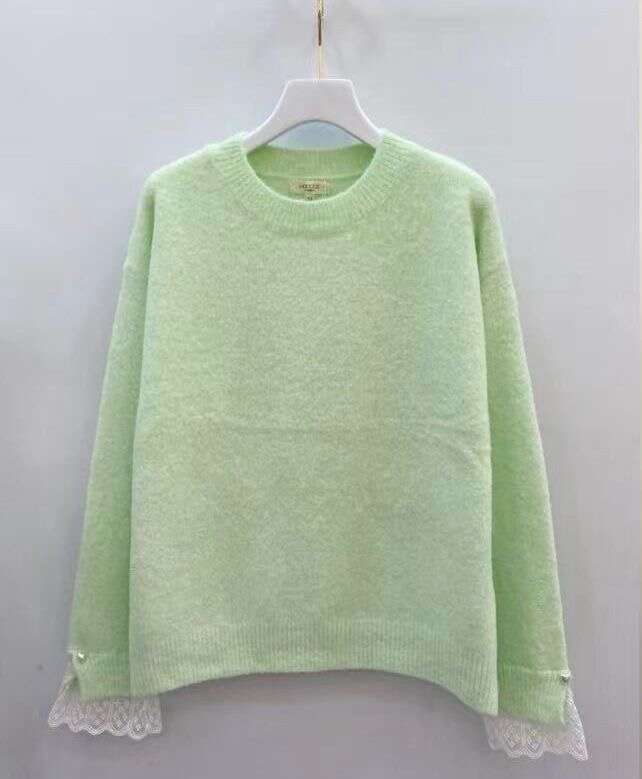 Miękki sweter o prostym kroju z delikatną koronką przy mankietach, zapewniający komfort i subtelną elegancję na co dzień.