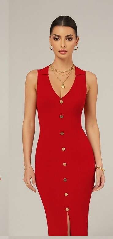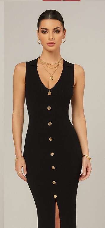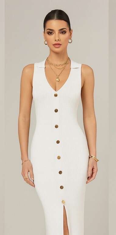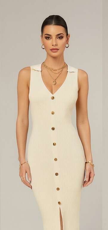 Dopasowana sukienka na szerokich ramiączkach, z eleganckim rzędem guzików i kobiecym dekoltem V. Idealnie podkreśla sylwetkę, zapewniając wygodę przez cały dzień.