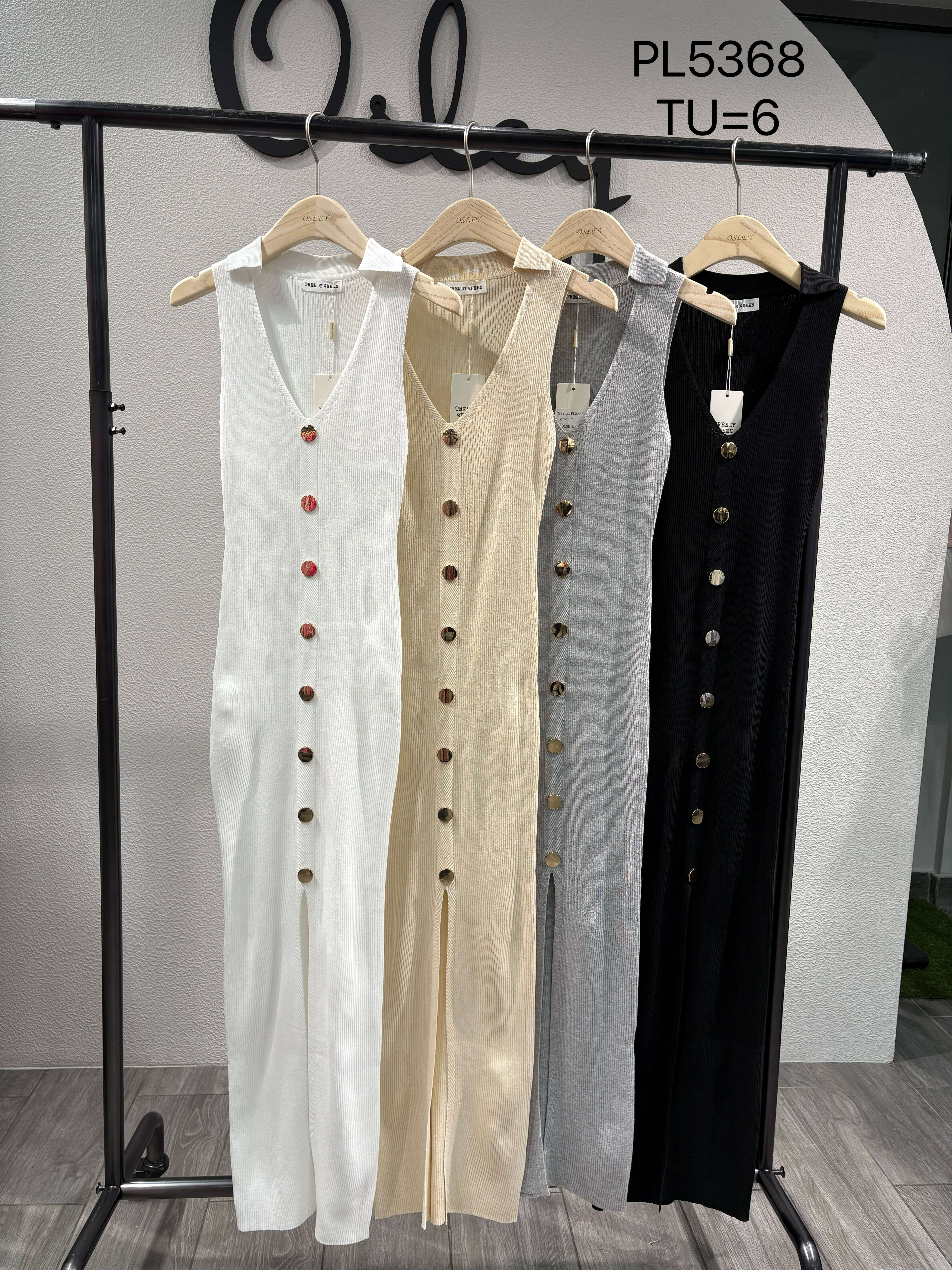 Dopasowana sukienka na szerokich ramiączkach, z eleganckim rzędem guzików i kobiecym dekoltem V. Idealnie podkreśla sylwetkę, zapewniając wygodę przez cały dzień.
