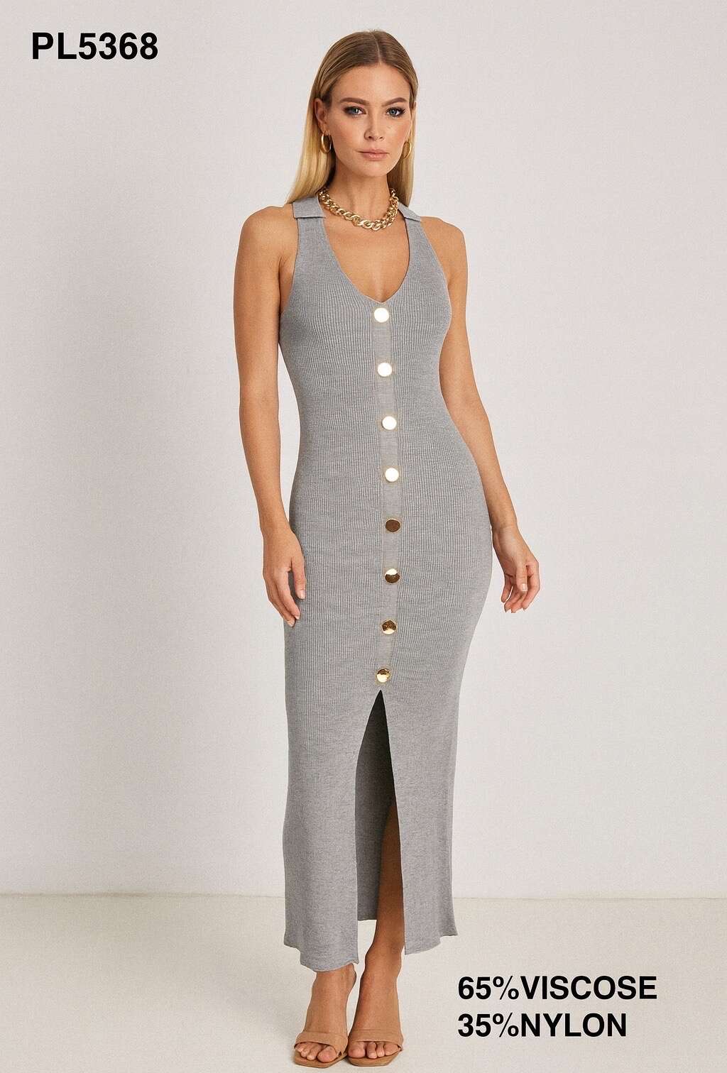 Dopasowana sukienka na szerokich ramiączkach, z eleganckim rzędem guzików i kobiecym dekoltem V. Idealnie podkreśla sylwetkę, zapewniając wygodę przez cały dzień.