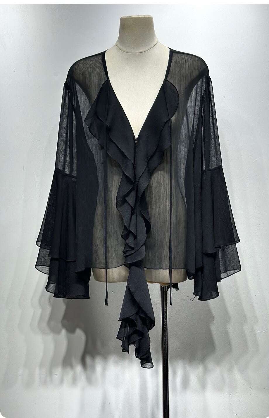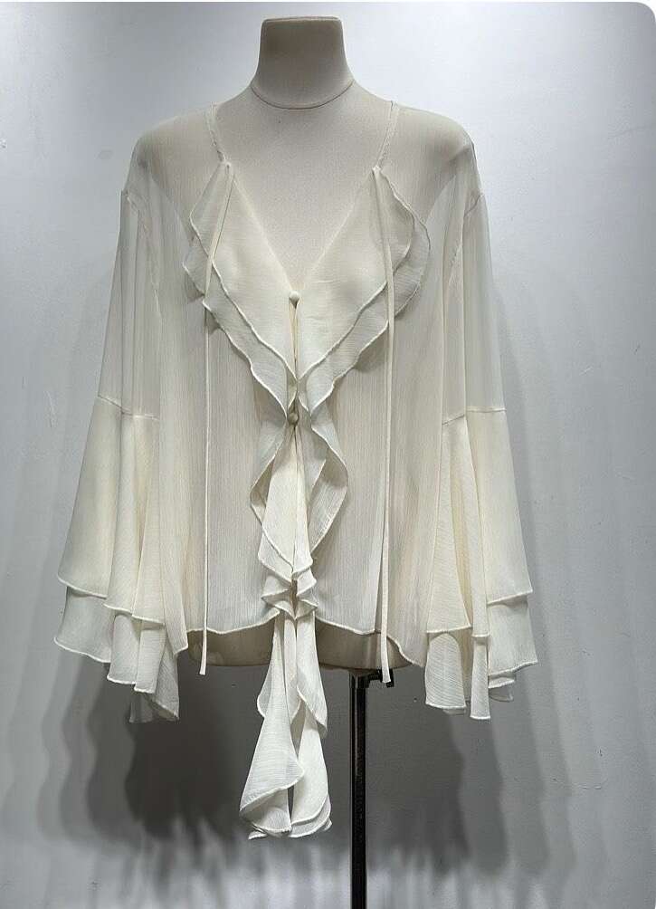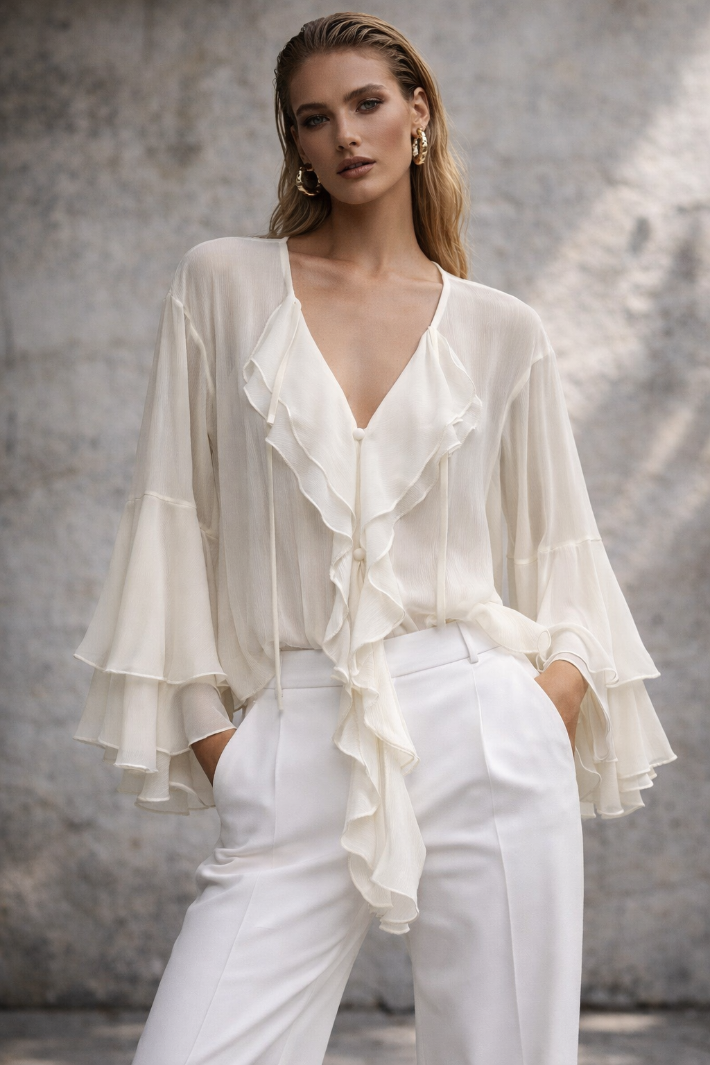 Zwiewna bluzka z falbanami, luźny krój, lekki materiał, dostępna w modnych kolorach.