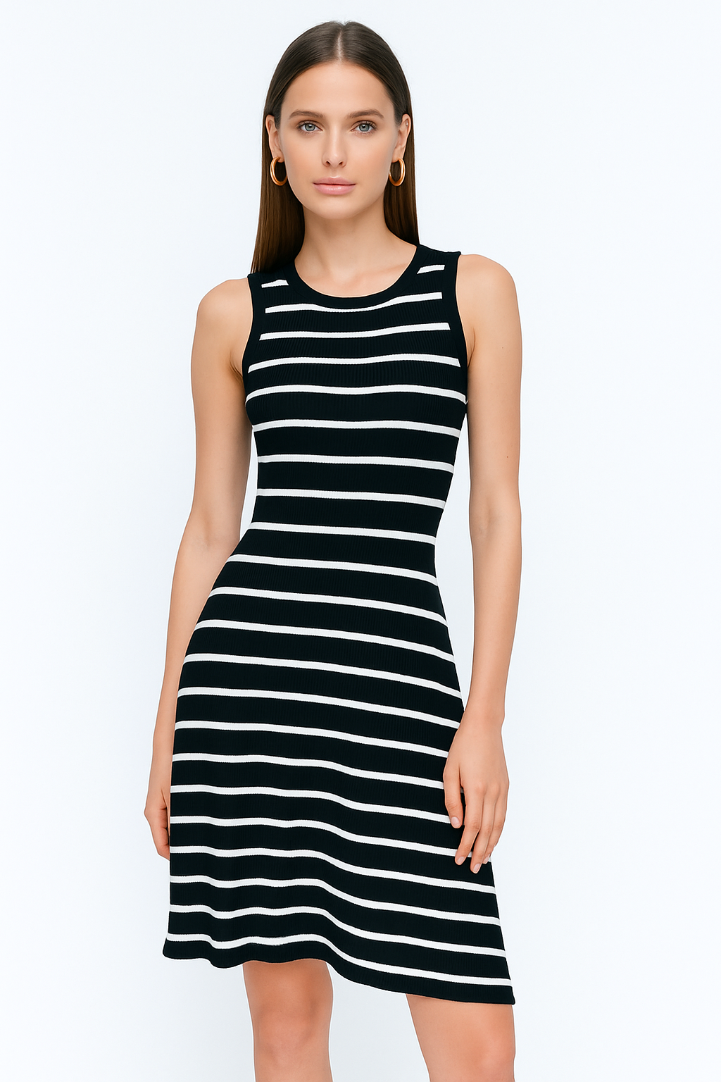 Ponadczasowa sukienka w paski dostępna w dwóch stylowych wariantach kolorystycznych: czarny/biały oraz beż/czarny. Model bez rękawów z okrągłym dekoltem pięknie podkreśla sylwetkę, a elastyczna dzianina gwarantuje maksymalny komfort noszenia. Doskonała propozycja do casualowych stylizacji na co dzień, do pracy czy na letnie spotkania. Dostępna w pełnej rozmiarówce, co ułatwia hurtowy zakup i umożliwia spełnienie oczekiwań nawet najbardziej wymagających klientek. Postaw na modną klasykę, która nigdy nie wychodzi z trendów!