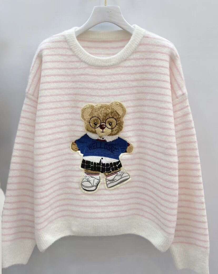 Miękki sweter o luźnym kroju, w pastelowe paski, z uroczą aplikacją misia, idealny na chłodne dni.