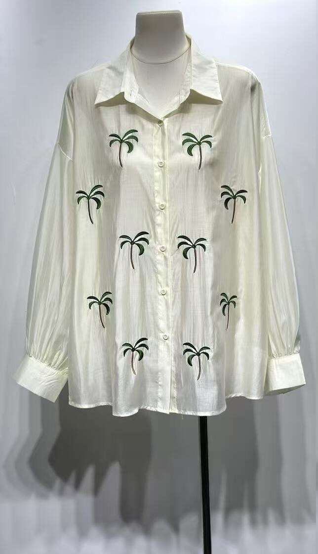 Letni komplet z przewiewnej tkaniny, z luźną koszulą ozdobioną palmami i szerokimi spodniami – idealny na ciepłe dni i wakacyjne stylizacje.
