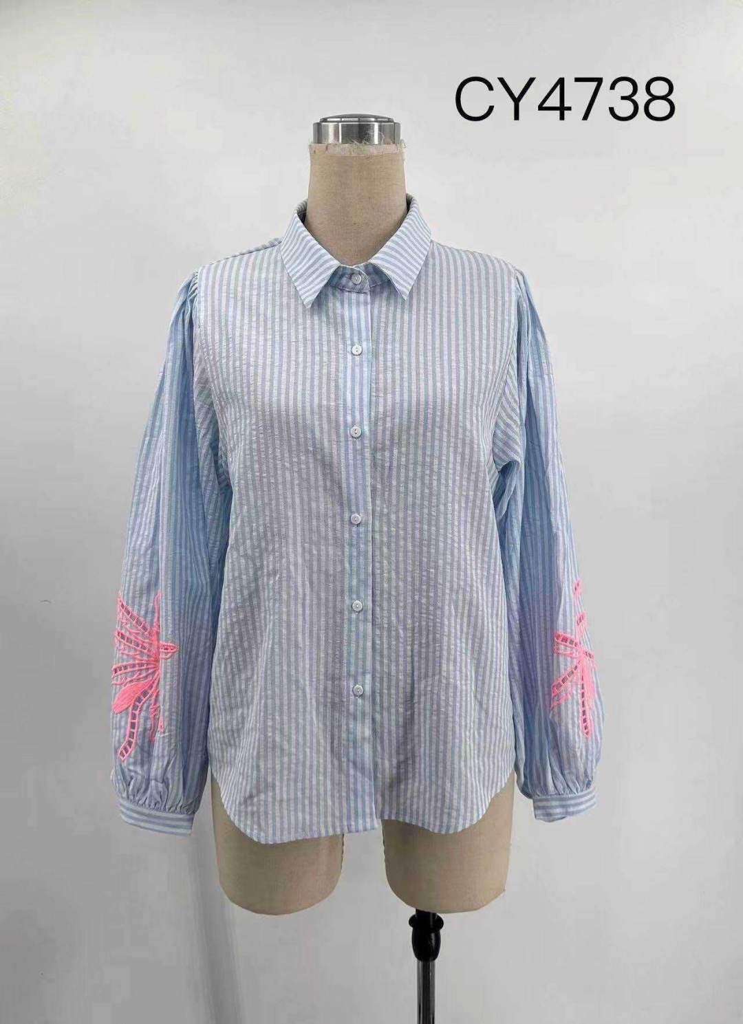 Zwiewna koszula o luźnym kroju z subtelnym wzorem w paski i efektownymi, haftowanymi aplikacjami na rękawach. Idealna na wiosnę i lato.