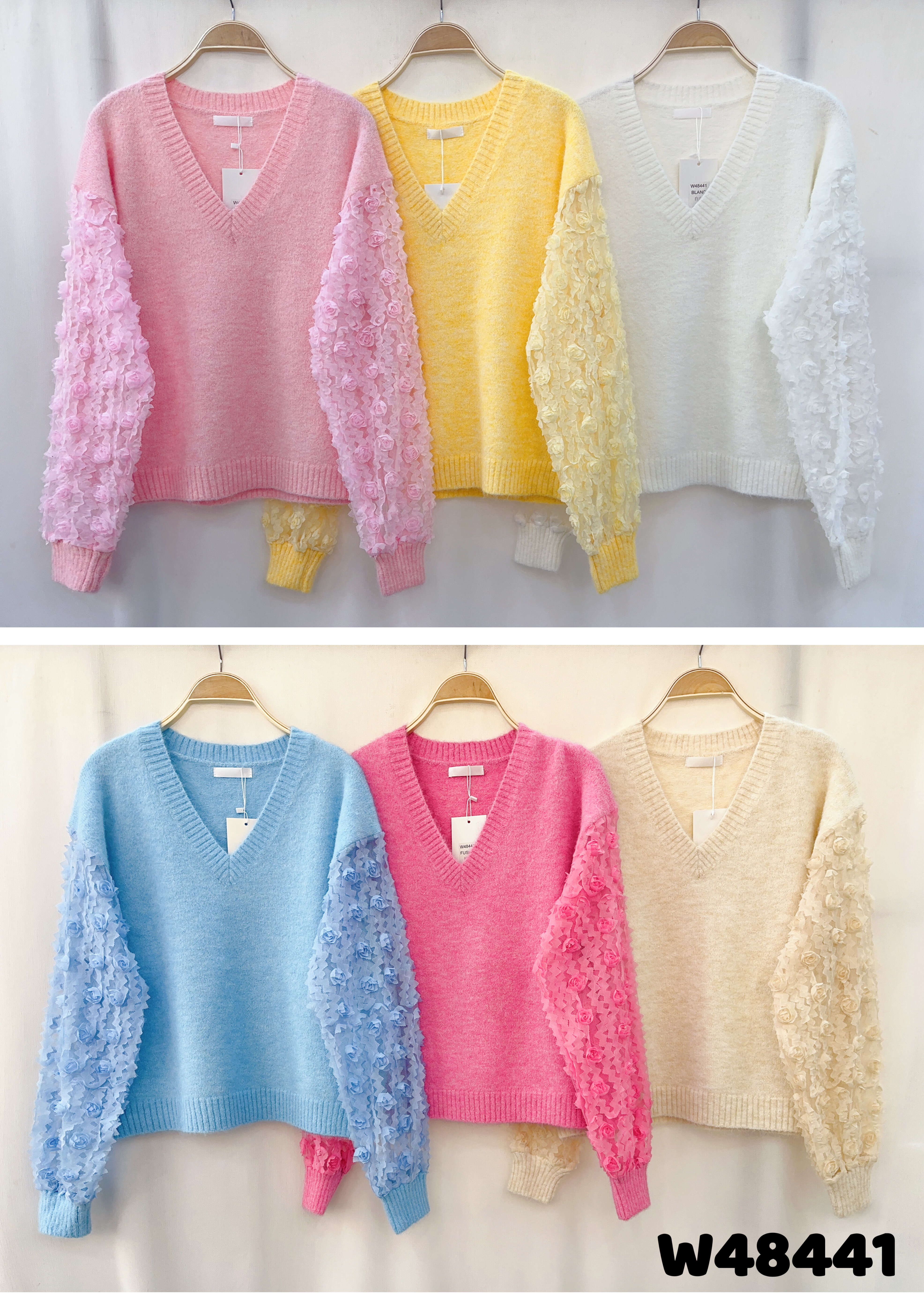 Sweter IGLOO to prawdziwy hit w Twojej hurtowni! Dostępny w sześciu modnych kolorach: żółtym, błękitnym, różowym, fuksji, białym i beżowym, ten model przyciąga uwagę nie tylko intensywnymi barwami, ale przede wszystkim wyjątkowym designem. Gładki korpus osadzony na rękawach z przestrzenną aplikacją kwiatową tworzy oryginalny, kobiecy efekt. Sweter posiada wygodny fason z dekoltem w serek, który świetnie podkreśla sylwetkę, zachowując jednocześnie komfort noszenia na co dzień. Wysokiej jakości, miękki materiał gwarantuje trwałość oraz przyjemność użytkowania. To model uniwersalny – sprawdzi się zarówno do jeansów, jak i eleganckich spódnic. Polecamy do asortymentu na co dzień, do pracy, czy spotkania ze znajomymi. Dostępne różne rozmiary, aby każda klientka znalazła coś dla siebie!