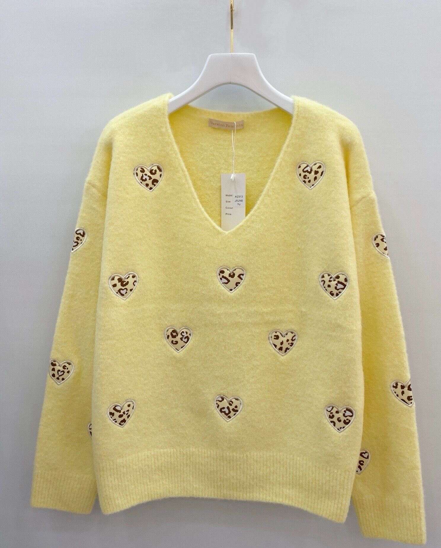 Swetry SOFITEL to propozycja, która na pewno przyciągnie wzrok Twoich klientek! Model dostępny w czterech modnych kolorach: żółtym, różowym, błękitnym oraz białym. Każdy sweter zachwyca niepowtarzalnymi naszywkami w formie serc z nadrukiem panterki, co nadaje mu wyjątkowego charakteru. Luźny krój oraz głęboki dekolt V zapewniają wygodę przez cały dzień i pasują do wielu stylizacji – zarówno na co dzień, jak i w casualowym wydaniu do pracy czy na spotkania z przyjaciółmi. Wysokiej jakości, miękki materiał gwarantuje trwałość oraz komfort użytkowania. Idealny wybór na sezon jesień-zima dla butików i sklepów internetowych, którym zależy na modnych i nietuzinkowych propozycjach w ofercie hurtowej.