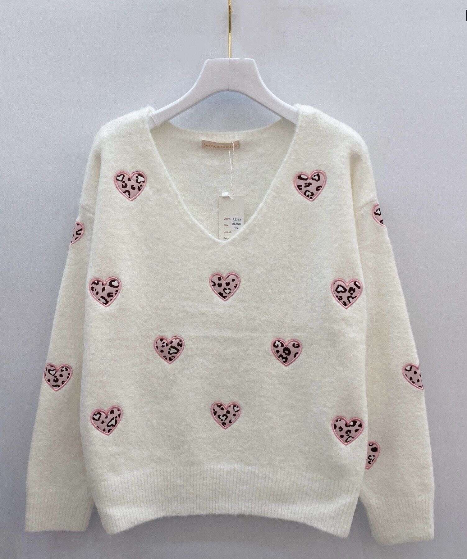 Miękki sweter o luźnym kroju z głębokim dekoltem V i uroczymi naszywkami w kształcie serc.