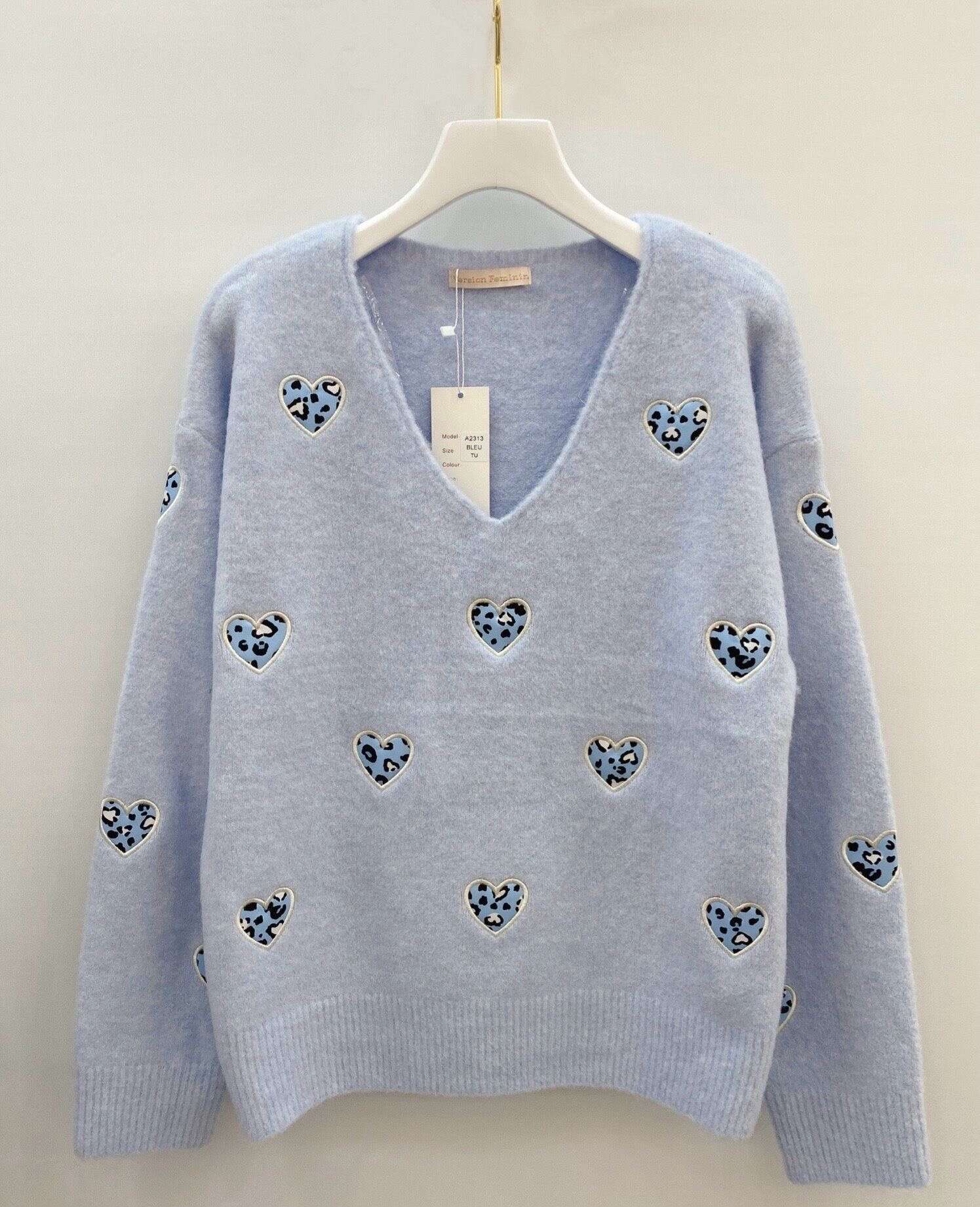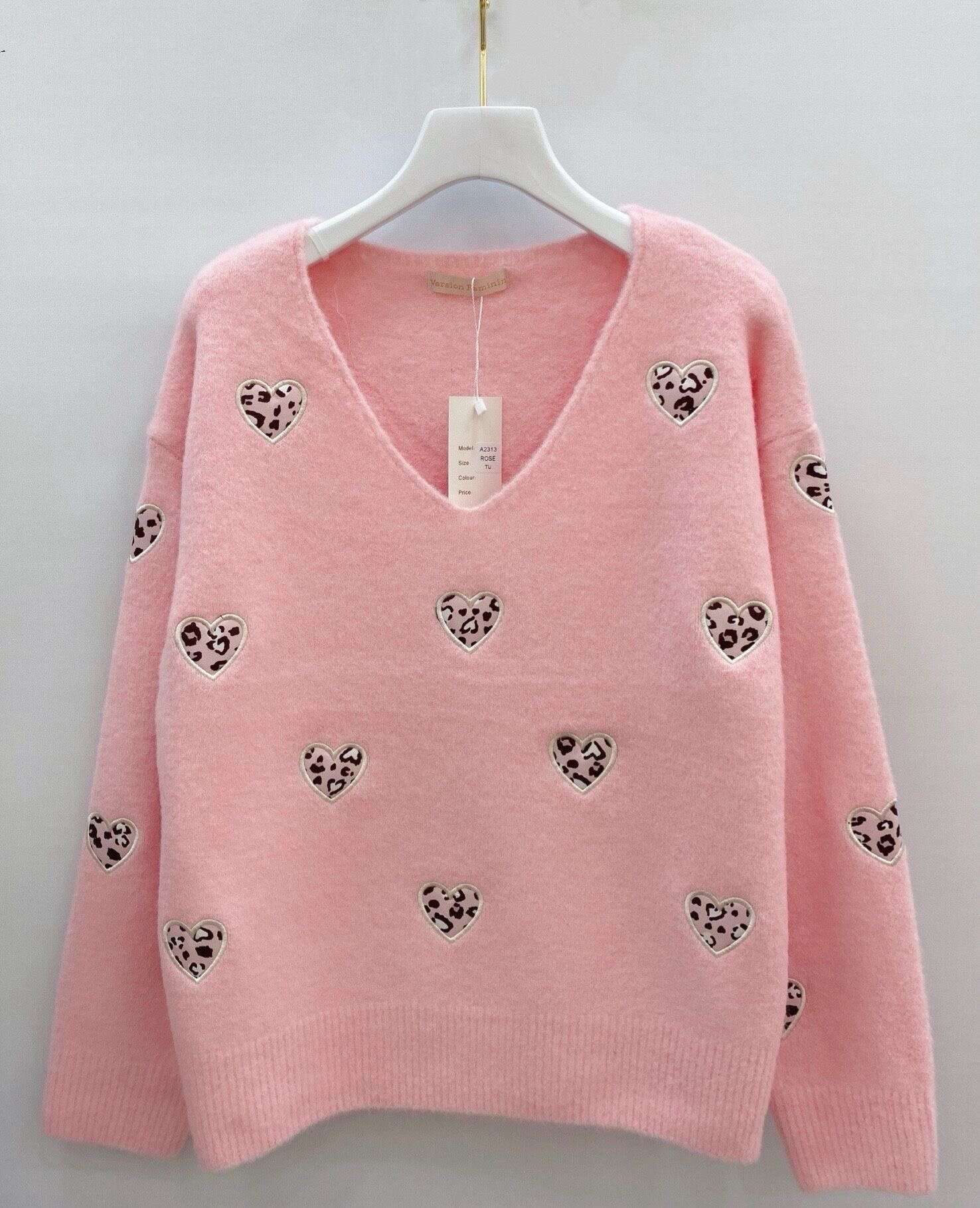 Miękki sweter o luźnym kroju z głębokim dekoltem V i uroczymi naszywkami w kształcie serc.
