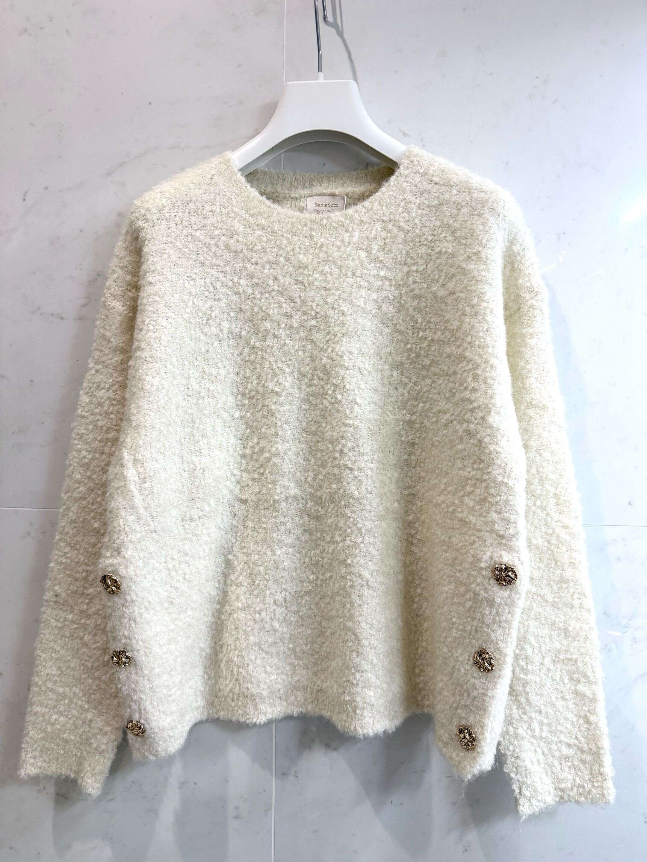 Miękki, puszysty sweter o luźnym kroju, ozdobiony dekoracyjnymi guzikami po bokach – gwarancja wygody i stylu każdego dnia.