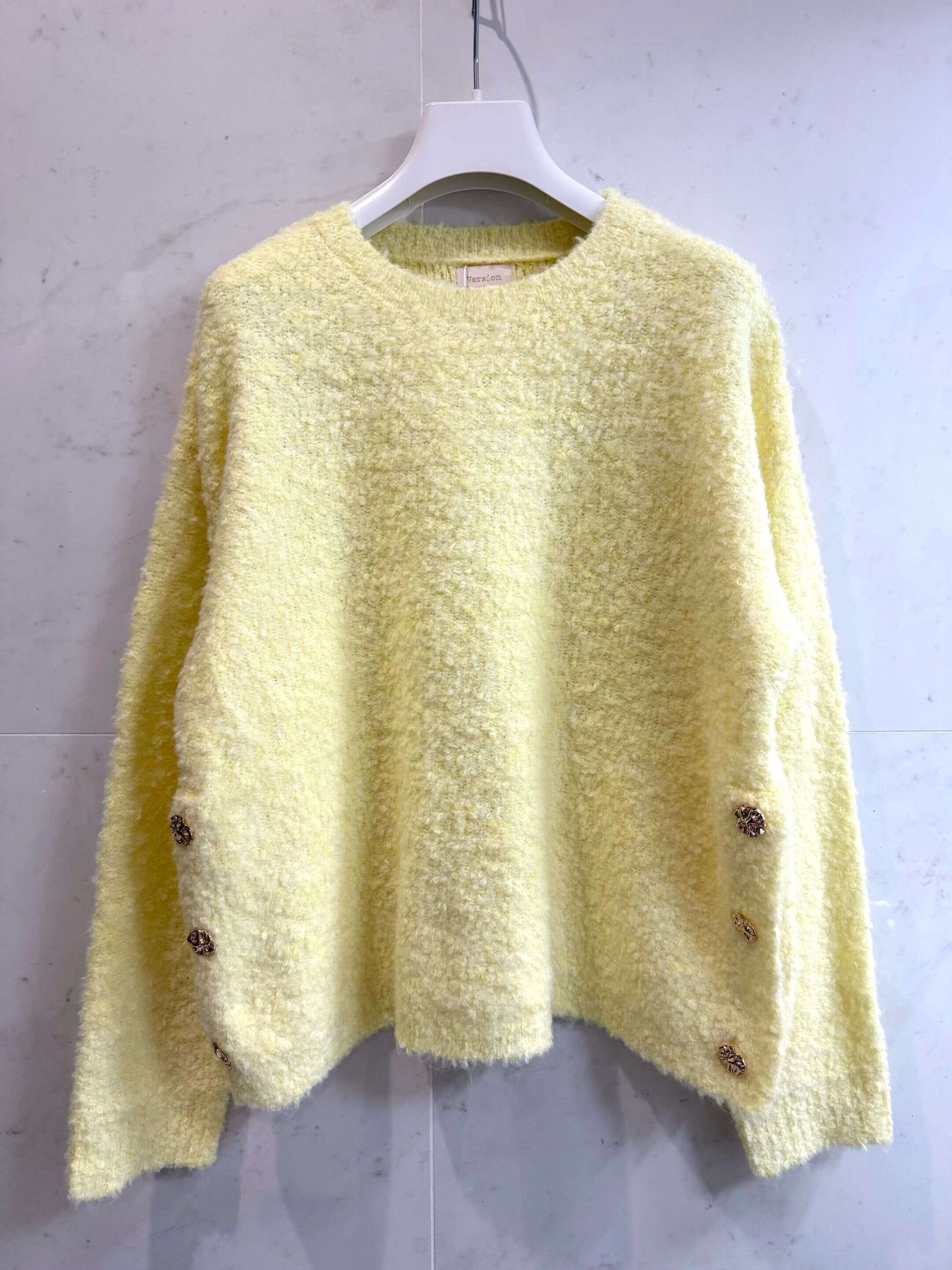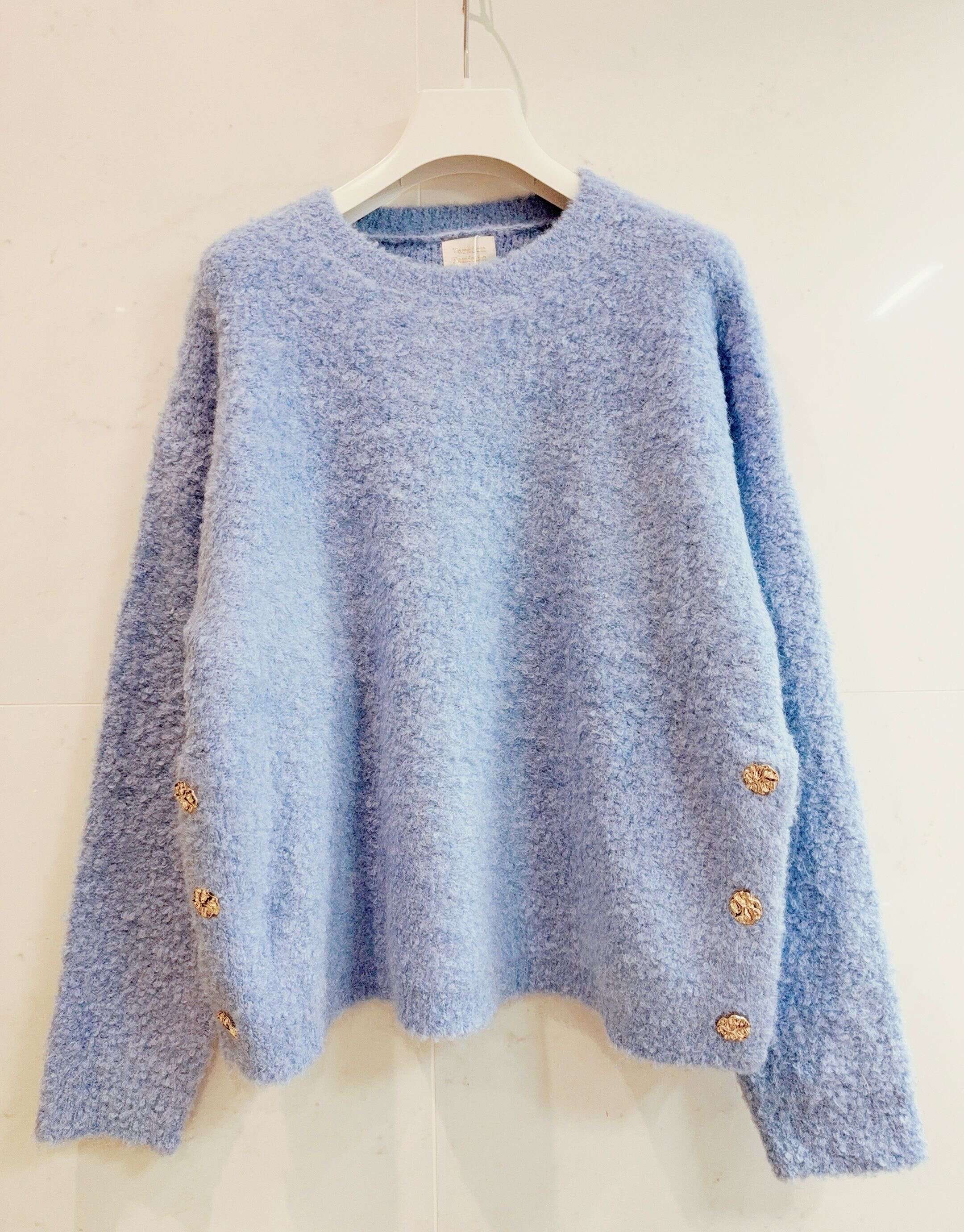 Miękki, puszysty sweter o luźnym kroju, ozdobiony dekoracyjnymi guzikami po bokach – gwarancja wygody i stylu każdego dnia.