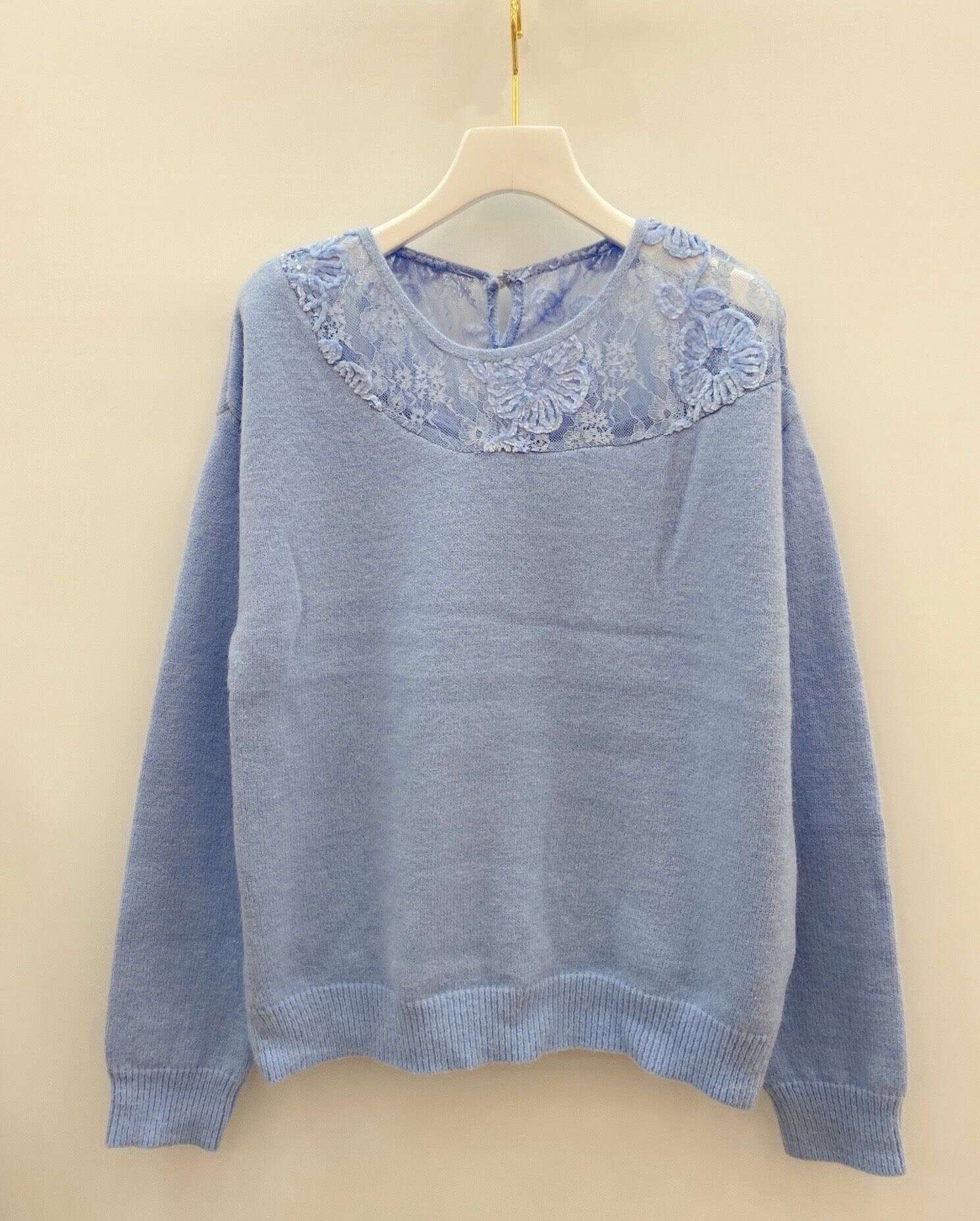 Delikatny sweter z koronkowym panelem przy dekolcie, zapewniający komfort i subtelną elegancję na co dzień.