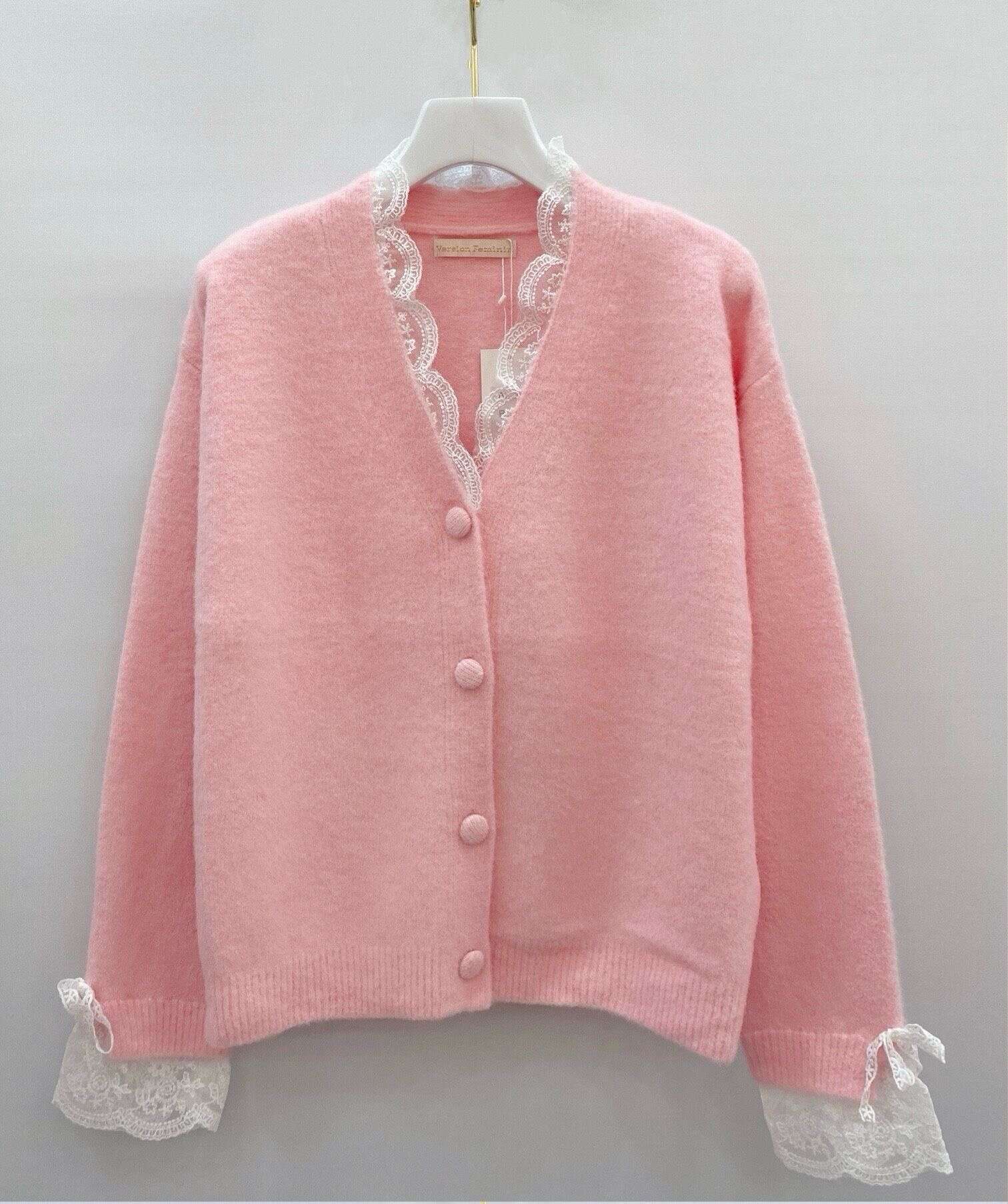 Kardigan o swobodnym kroju z delikatną koronką przy dekolcie i mankietach, niezwykle miękki, kobiecy i wygodny na co dzień.