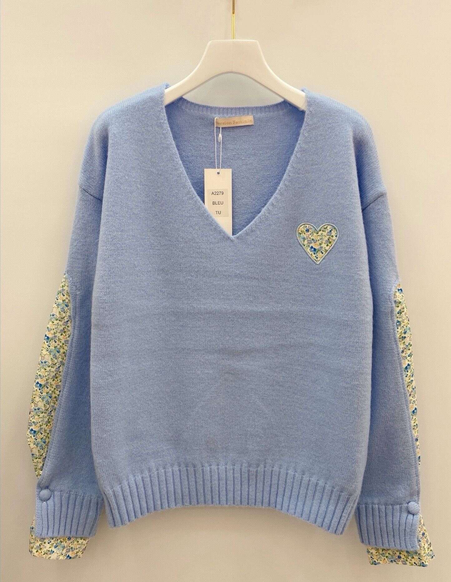 Modny sweter z miękkiej dzianiny ze stylowym dekoltem V, zdobiony uroczym sercem i kwiatowymi wstawkami na rękawach.