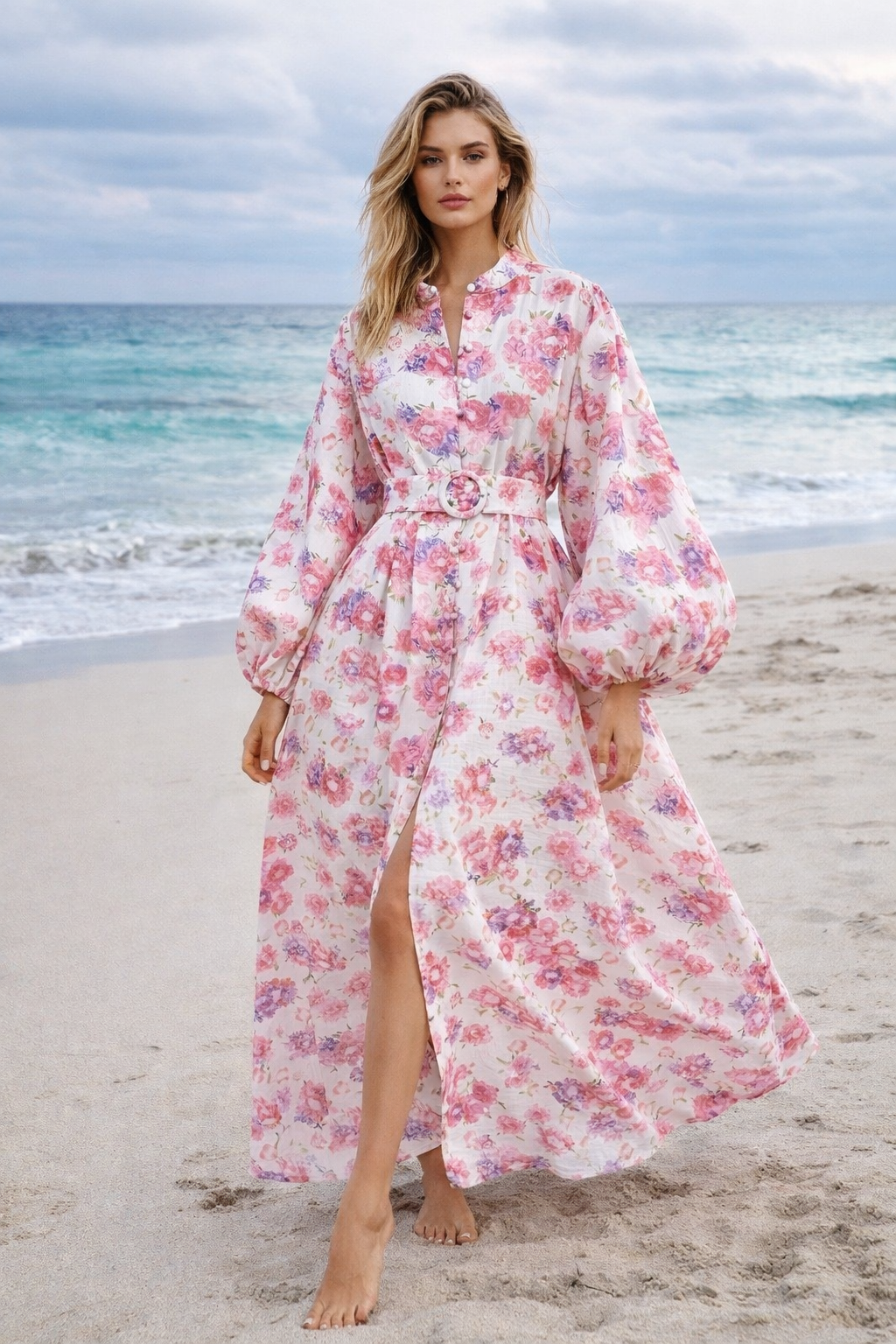 Zwiewna sukienka maxi z paskiem, w modny kwiatowy print, z bufiastymi rękawami – idealna na wiosnę i lato. Wykonana z przyjemnej mieszanki bawełny i lnu.