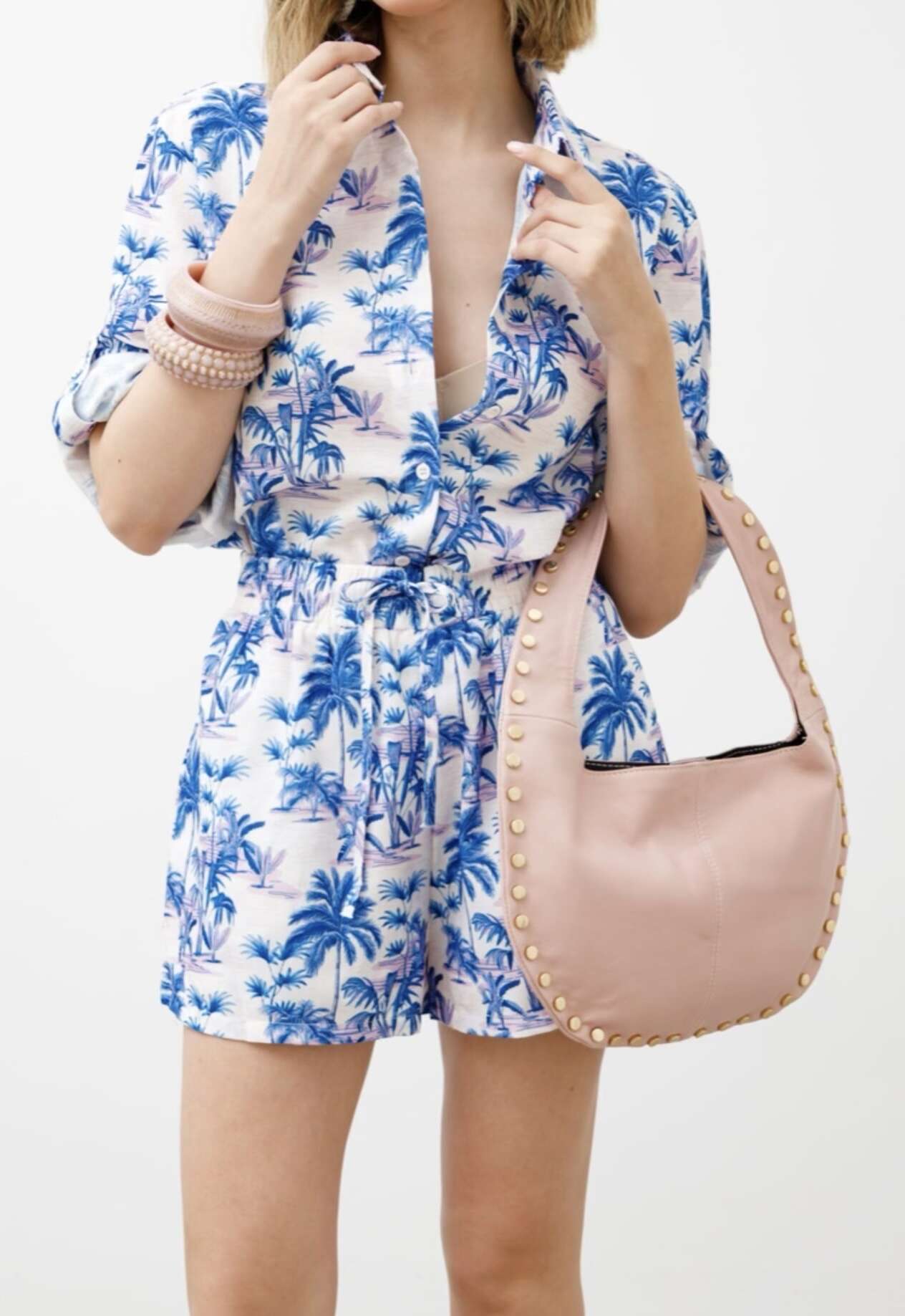 Komplet TROPICANA to idealna propozycja na sezon wiosna-lato dla klientek ceniących styl i komfort. Wykonany w 100% z wysokogatunkowego lnu, oferuje przewiewność, lekkość i naturalną ochronę przed upałem. Wzór z egzotycznymi palmami nadaje wyjątkowego uroku i przyciąga wzrok, a uniwersalny fason sprawdzi się zarówno na plaży, w miejskiej stylizacji, jak i podczas wakacyjnych wyjazdów. Komplet składa się z koszuli z podwijanymi rękawami oraz spódnicy na gumce, dostępny w intensywnie pomarańczowym oraz świeżym niebieskim kolorze. Rozmiary S/M i M/L w wygodnych pakietach. Doskonały wybór dla hurtowni, która chce wyróżnić się na rynku letniają modą z najwyższej jakości materiałów.