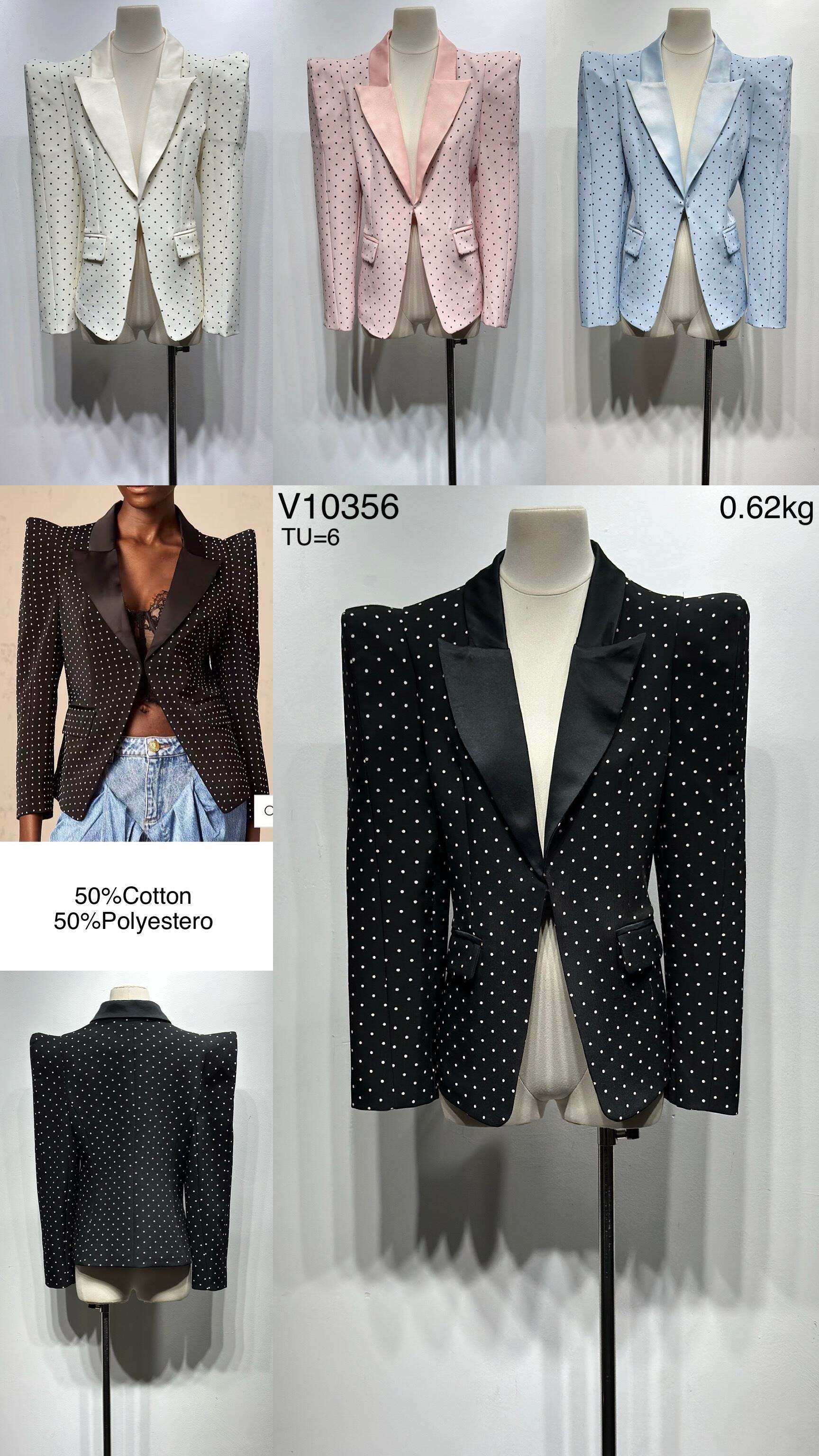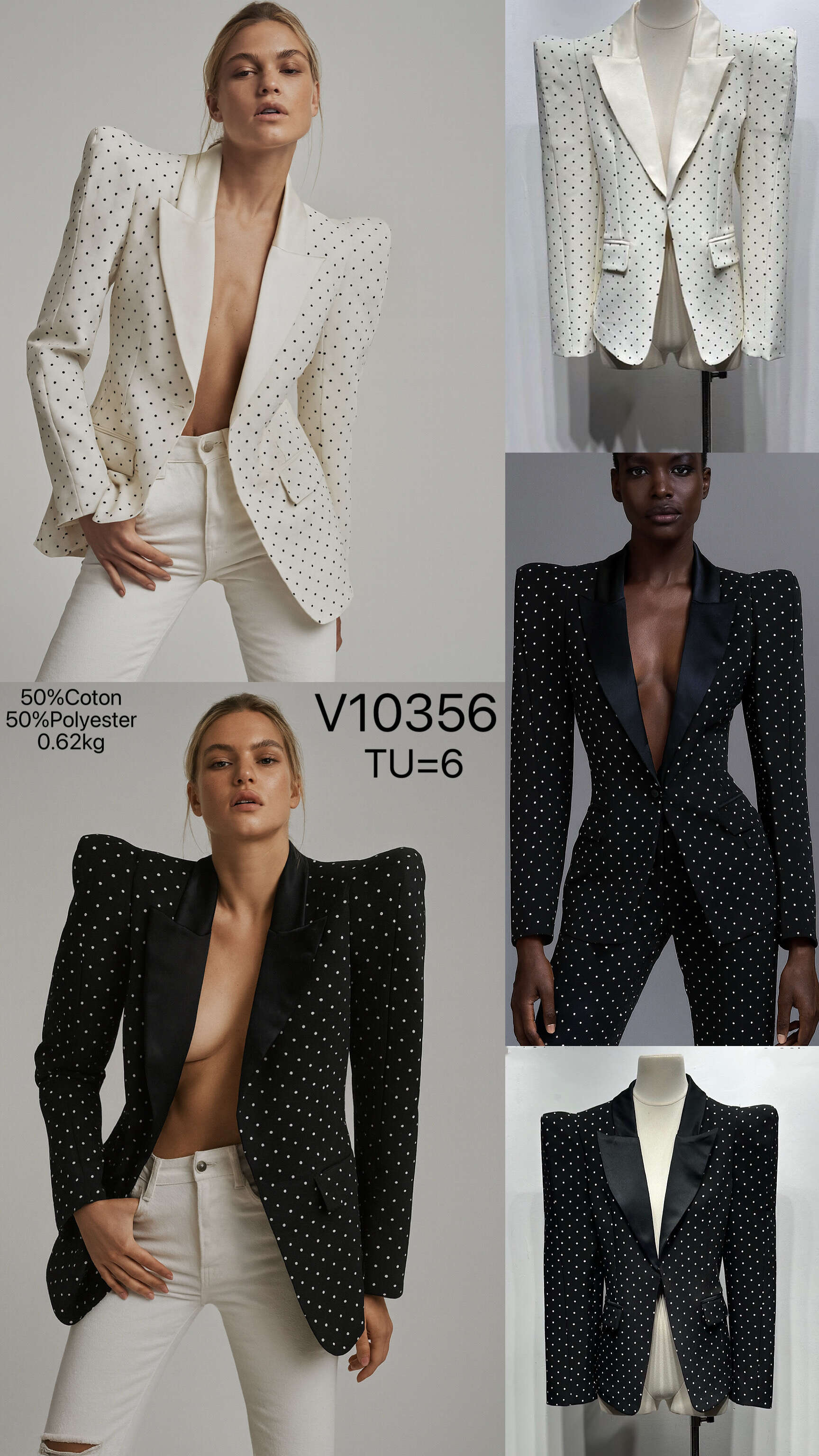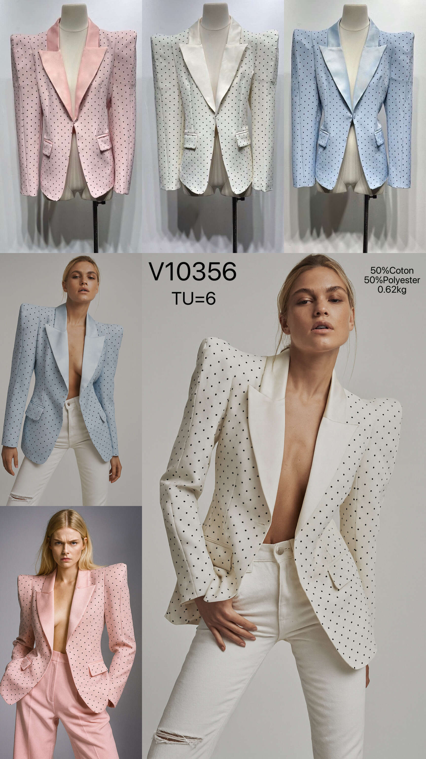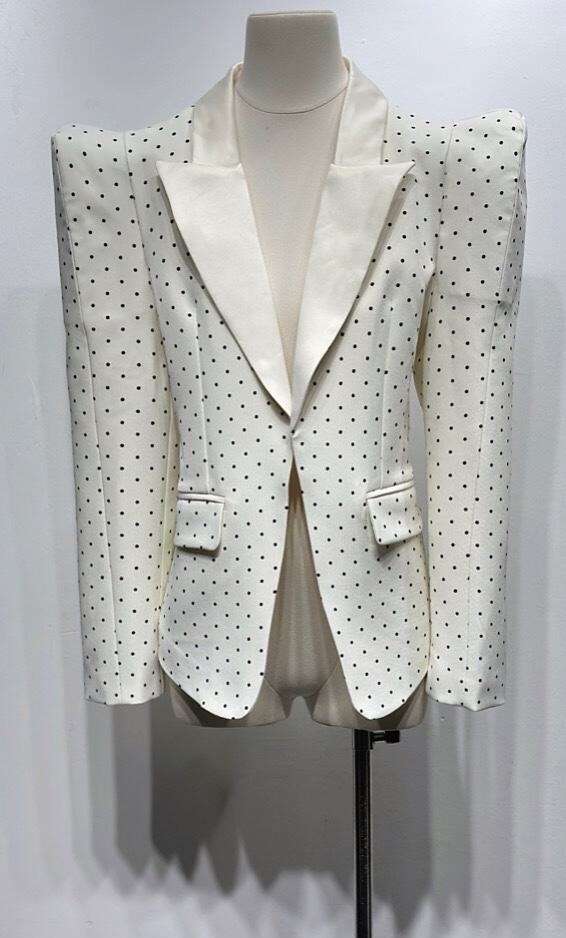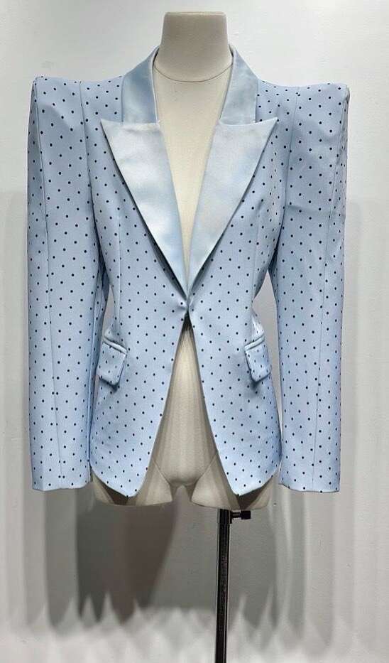 Elegancki żakiet z podkreślonymi ramionami i modnym wzorem w drobne groszki. Wykonany z wysokiej jakości materiału, idealny na wyjątkowe okazje i do codziennych stylizacji.