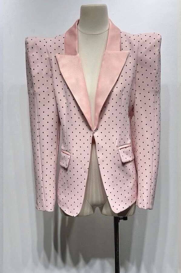Elegancki żakiet z podkreślonymi ramionami i modnym wzorem w drobne groszki. Wykonany z wysokiej jakości materiału, idealny na wyjątkowe okazje i do codziennych stylizacji.