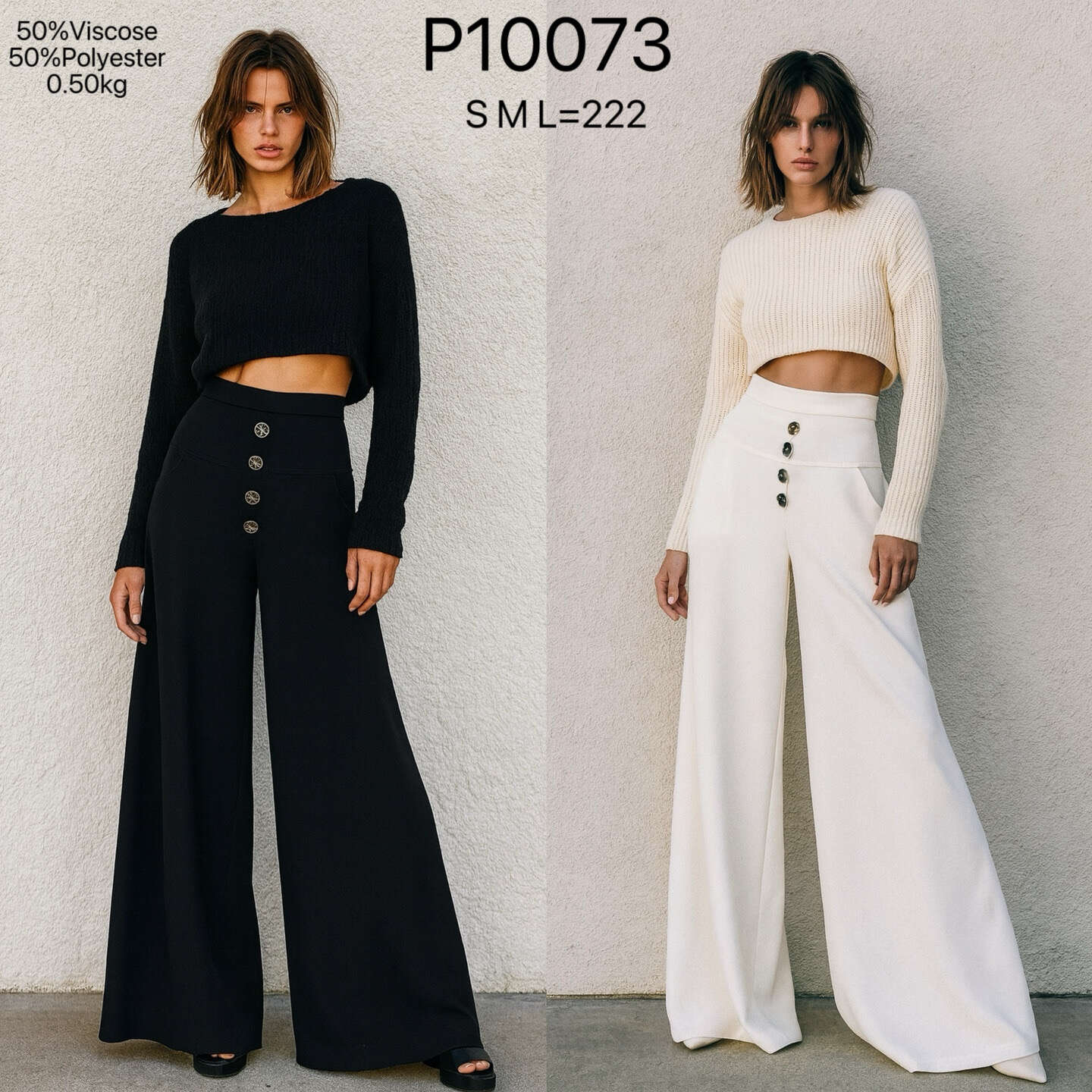 Szerokie, eleganckie spodnie z wysokim stanem to propozycja, która podbiła serca klientek w całej Polsce. Model z przyciągającymi wzrok ozdobnymi guzikami doskonale wysmukla sylwetkę i gwarantuje nie tylko stylowy wygląd, ale również wygodę przez cały dzień. Spodnie wykonane są z wysokiej jakości materiału zapewniającego komfort noszenia i trwałość, idealnie sprawdzą się zarówno na spotkania biznesowe, jak i na codzienne wyjścia. W naszej hurtowni dostępne w trzech modnych kolorach: różowym, błękitnym i białym, w szerokiej gamie rozmiarów – dopasuj ofertę do oczekiwań swoich klientów i postaw na bestseller tego sezonu!