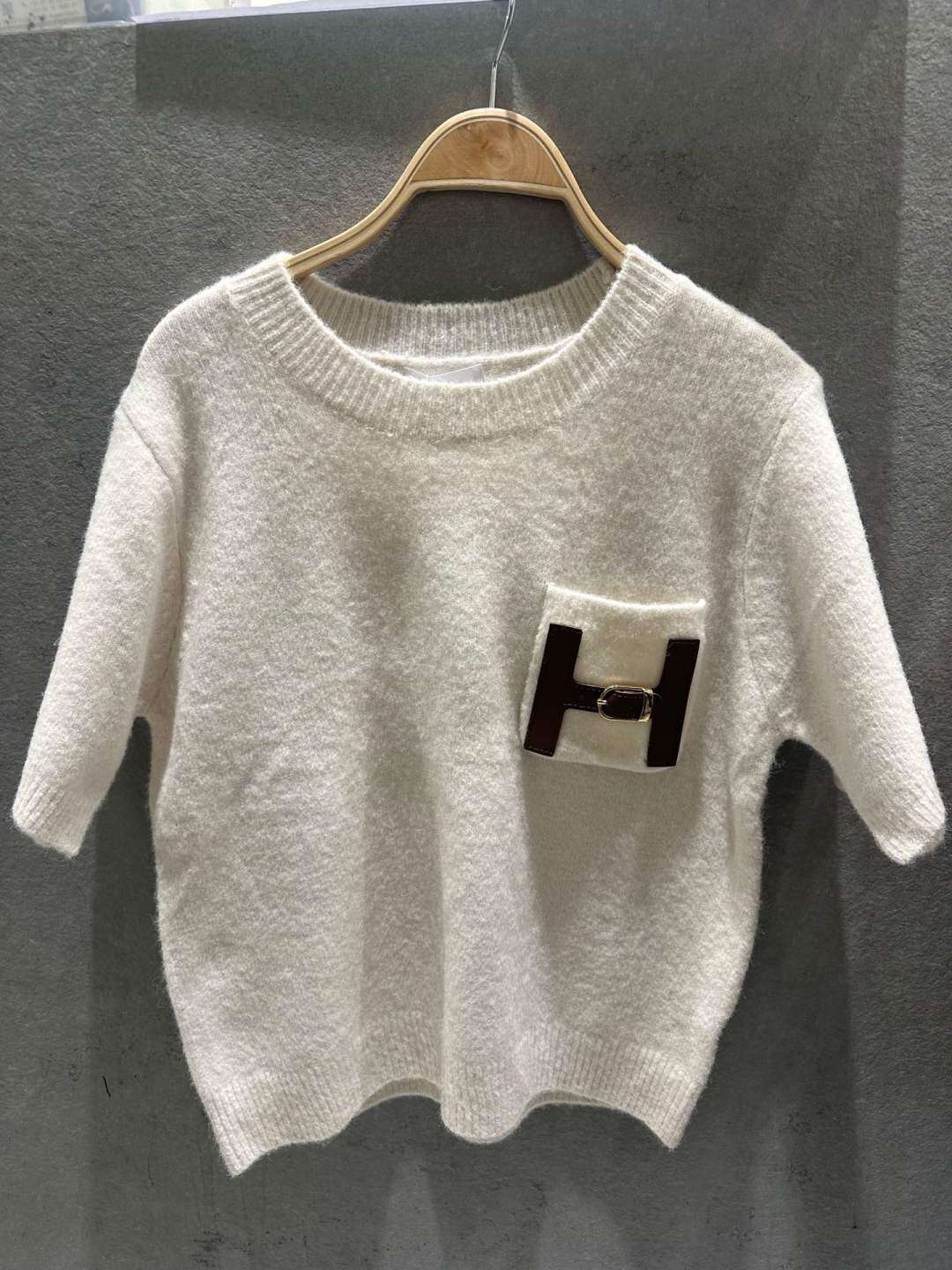 Modny sweter o prostym kroju z krótkim rękawem, wykonany z miękkiej dzianiny, ozdobiony kieszonką z efektowną aplikacją.