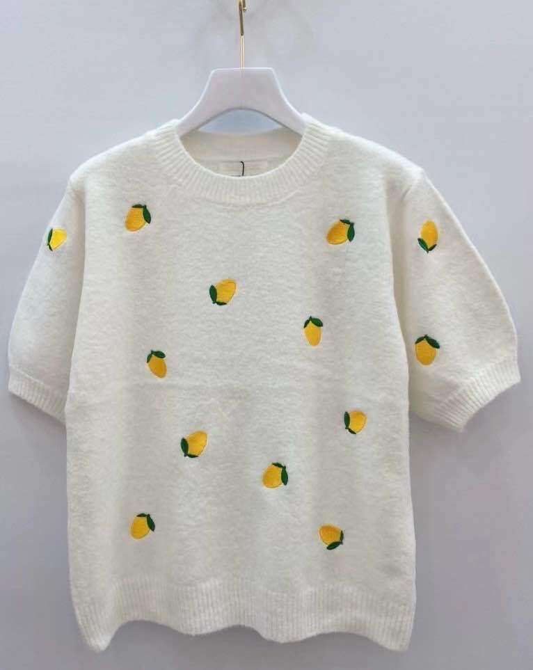 Uroczy sweter o luźnym kroju z krótkim rękawem i cytrynowymi haftami – komfort i styl w jednym.