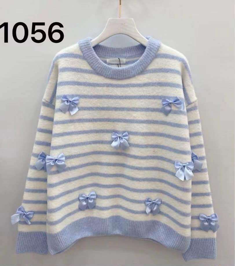 Uroczy sweter w pastelowe paski, ozdobiony delikatnymi kokardkami – idealny wybór na sezon wiosna-lato dla miłośniczek romantycznego stylu.