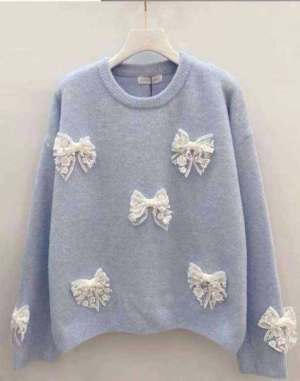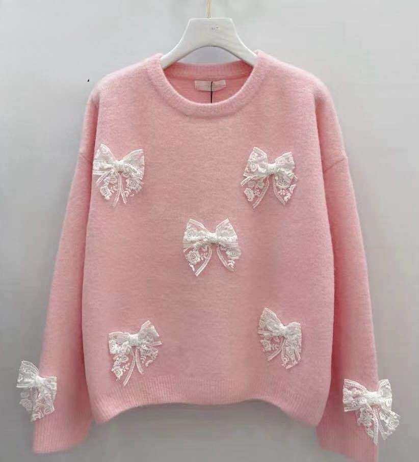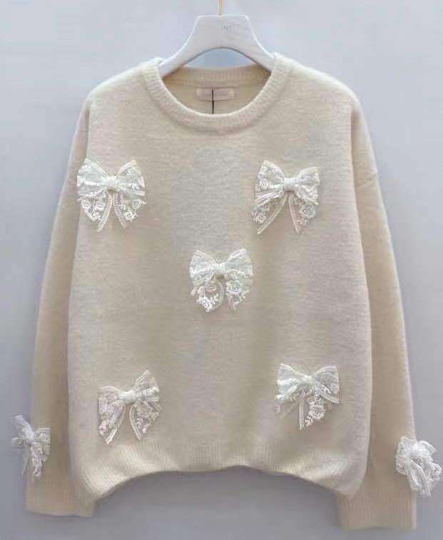 Dziewczęcy sweter z miękkiej dzianiny, ozdobiony efektownymi koronkowymi kokardkami. Komfortowy krój i wyjątkowe detale przyciągają uwagę.