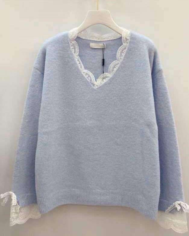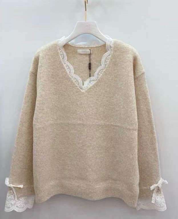 Sweter z delikatną koronką przy dekolcie V i mankietach, miękki materiał, kobiecy krój, uniwersalny styl.