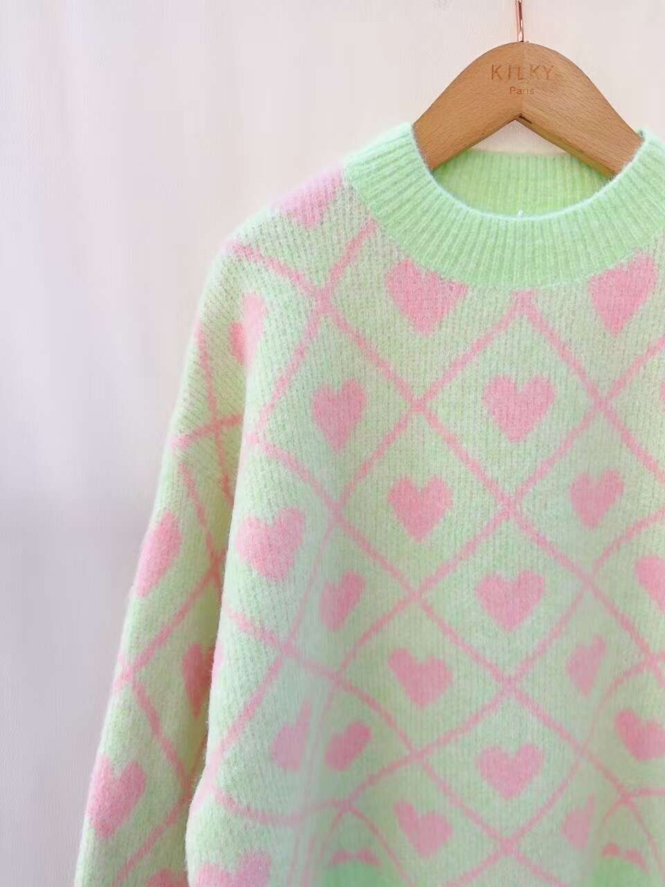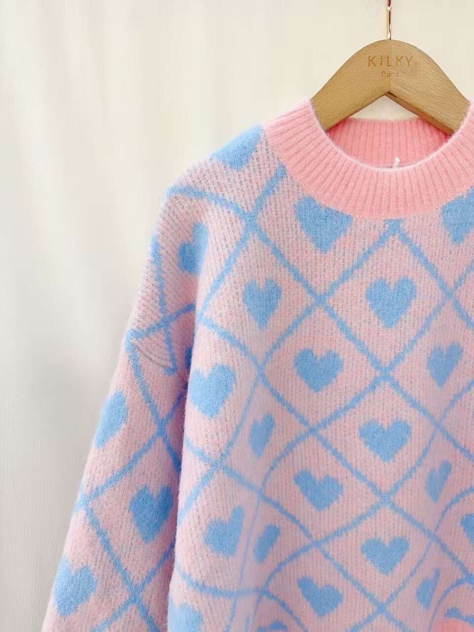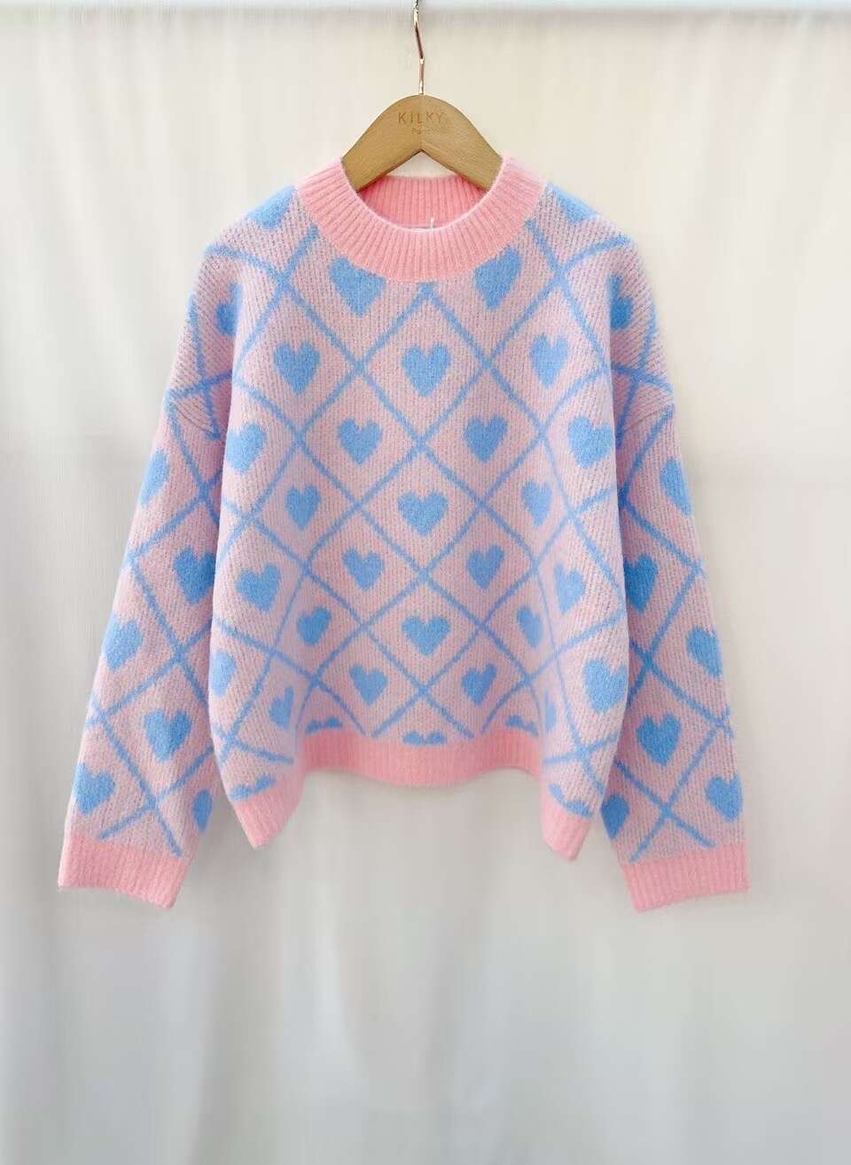 Uroczy sweter o luźnym kroju z miękkiej dzianiny, wyróżniający się pastelowymi kolorami i modnym wzorem w serca.