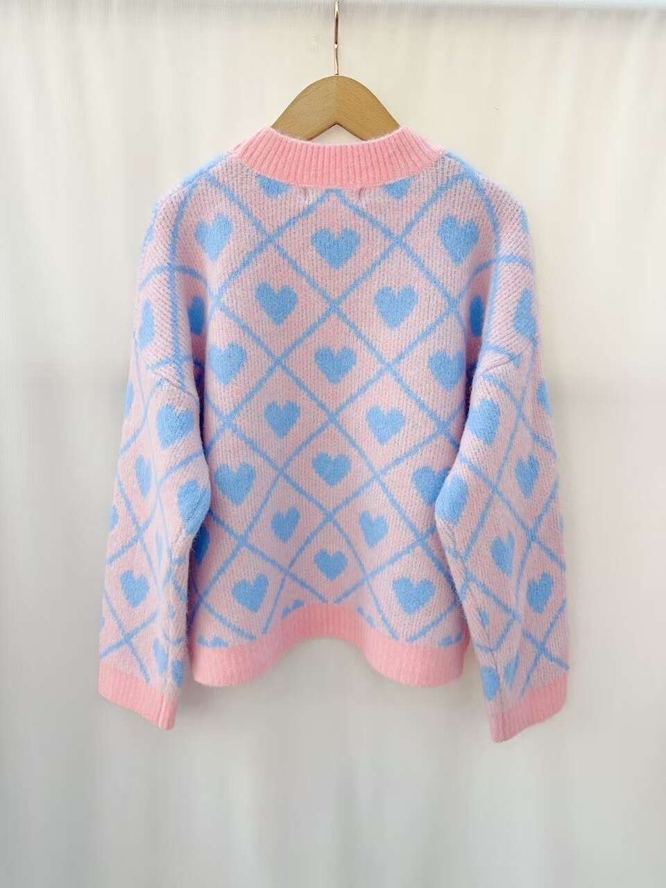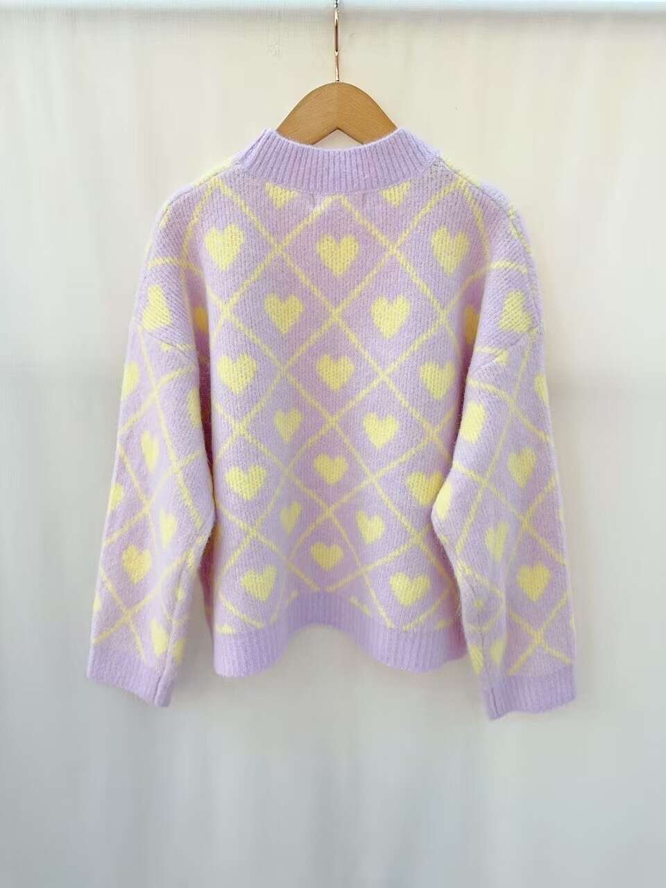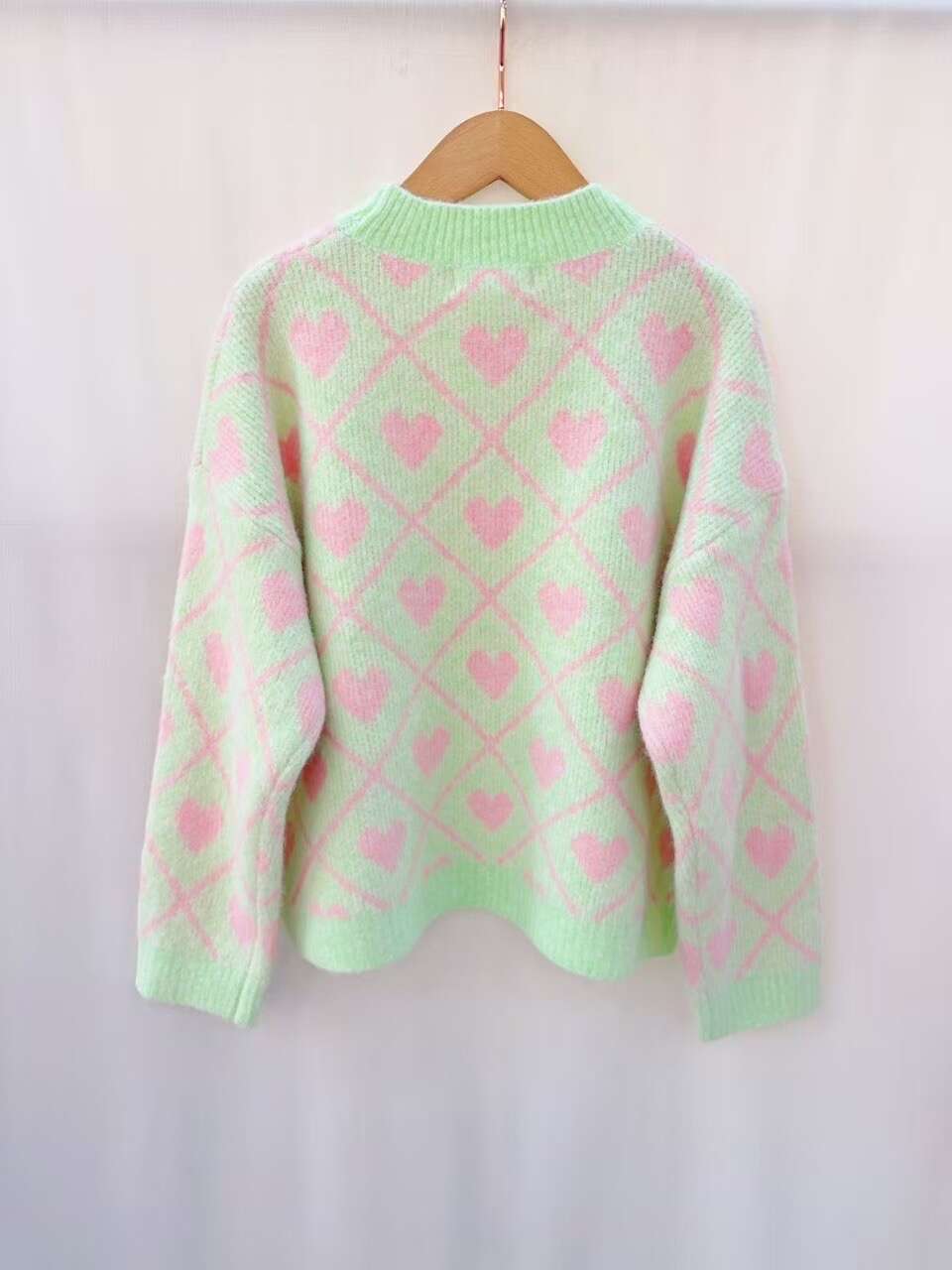 Uroczy sweter o luźnym kroju z miękkiej dzianiny, wyróżniający się pastelowymi kolorami i modnym wzorem w serca.