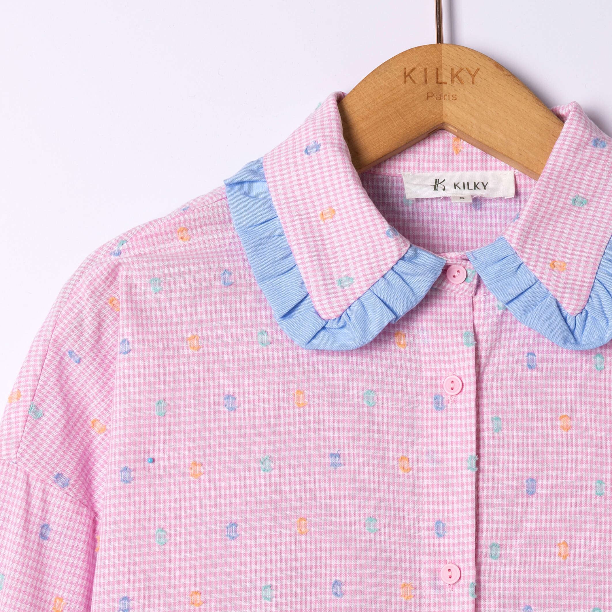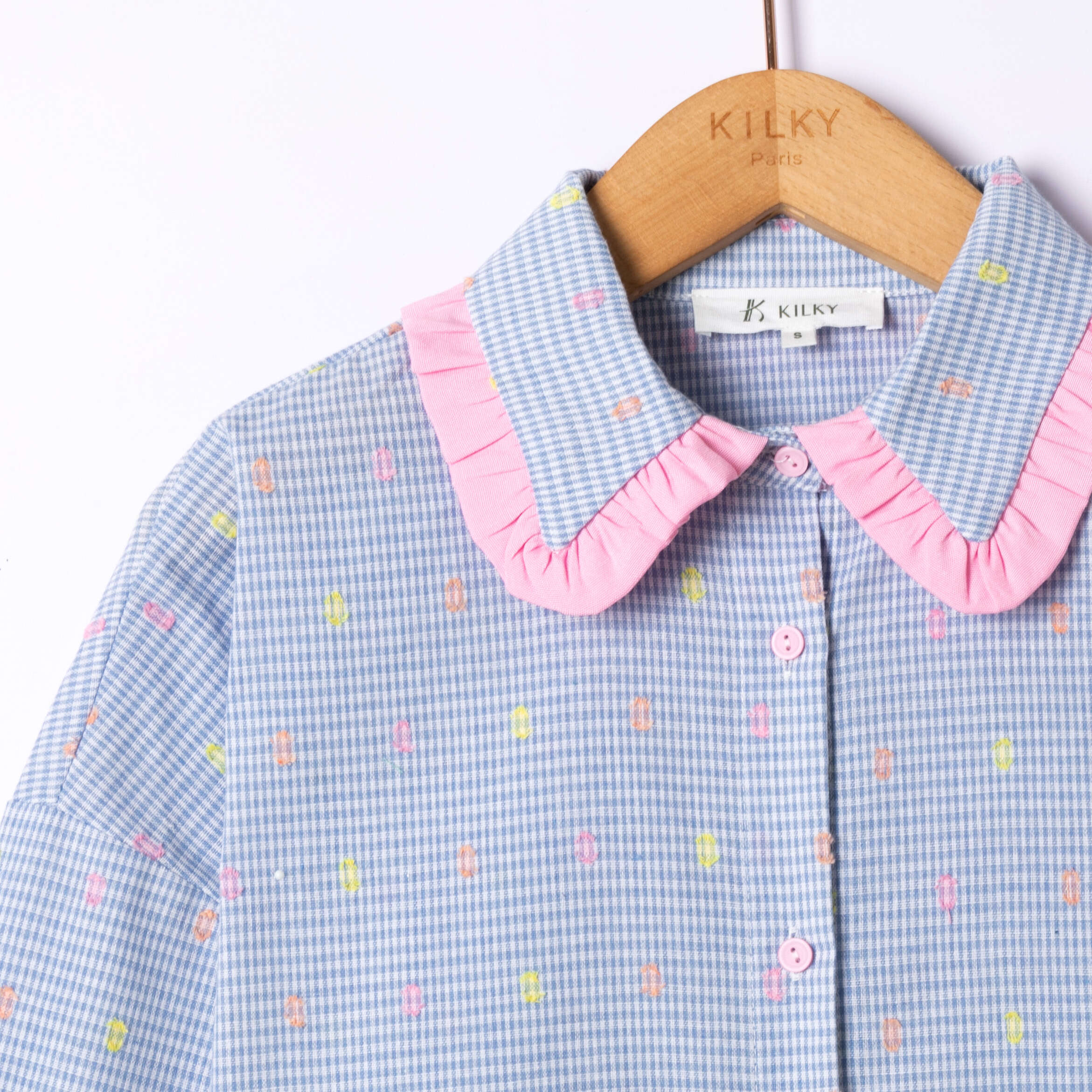 Koszula o lekko oversize’owym kroju, z delikatnym wzorem i uroczymi falbankami – wygoda oraz dziewczęcy styl w jednym.