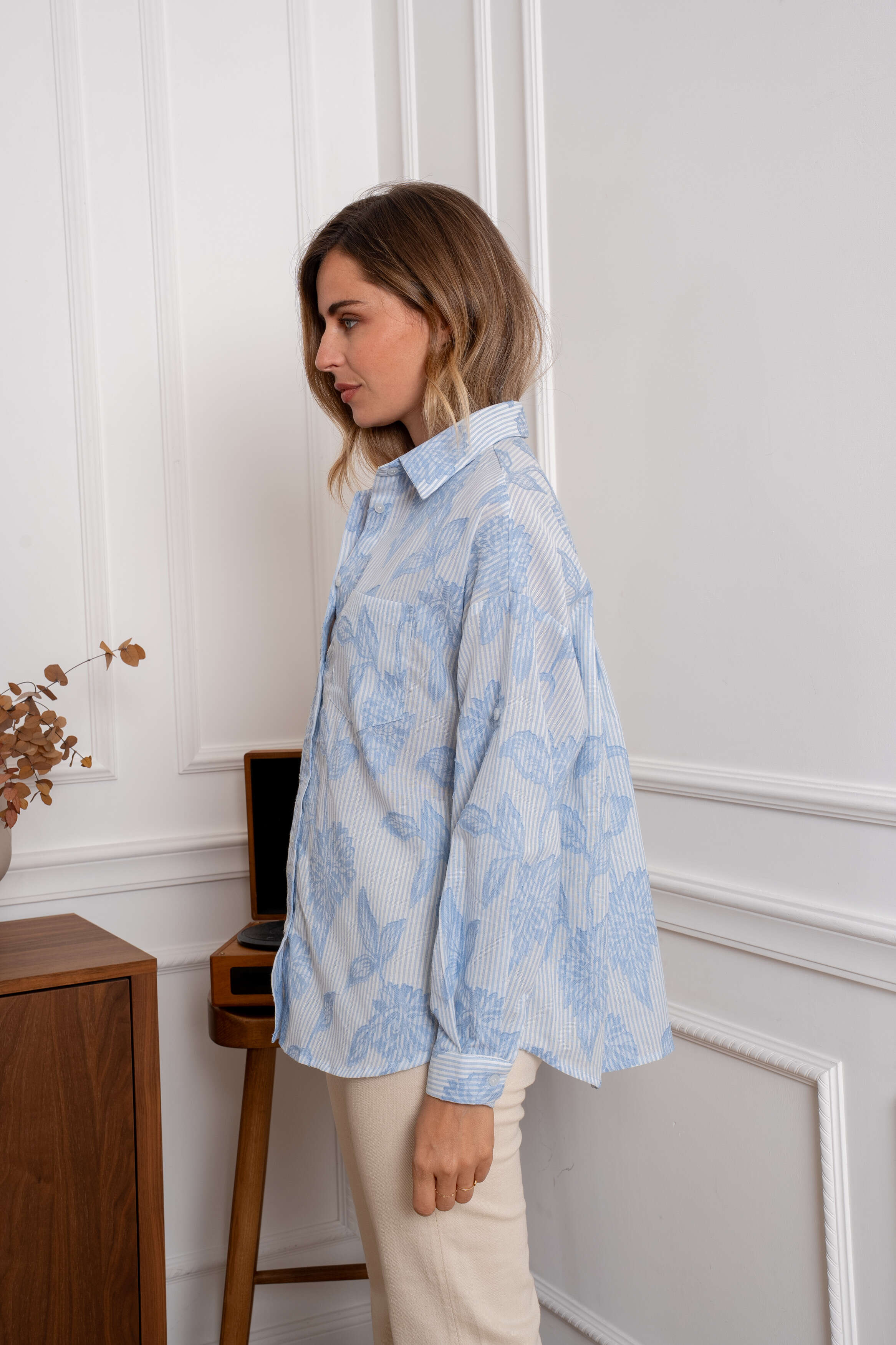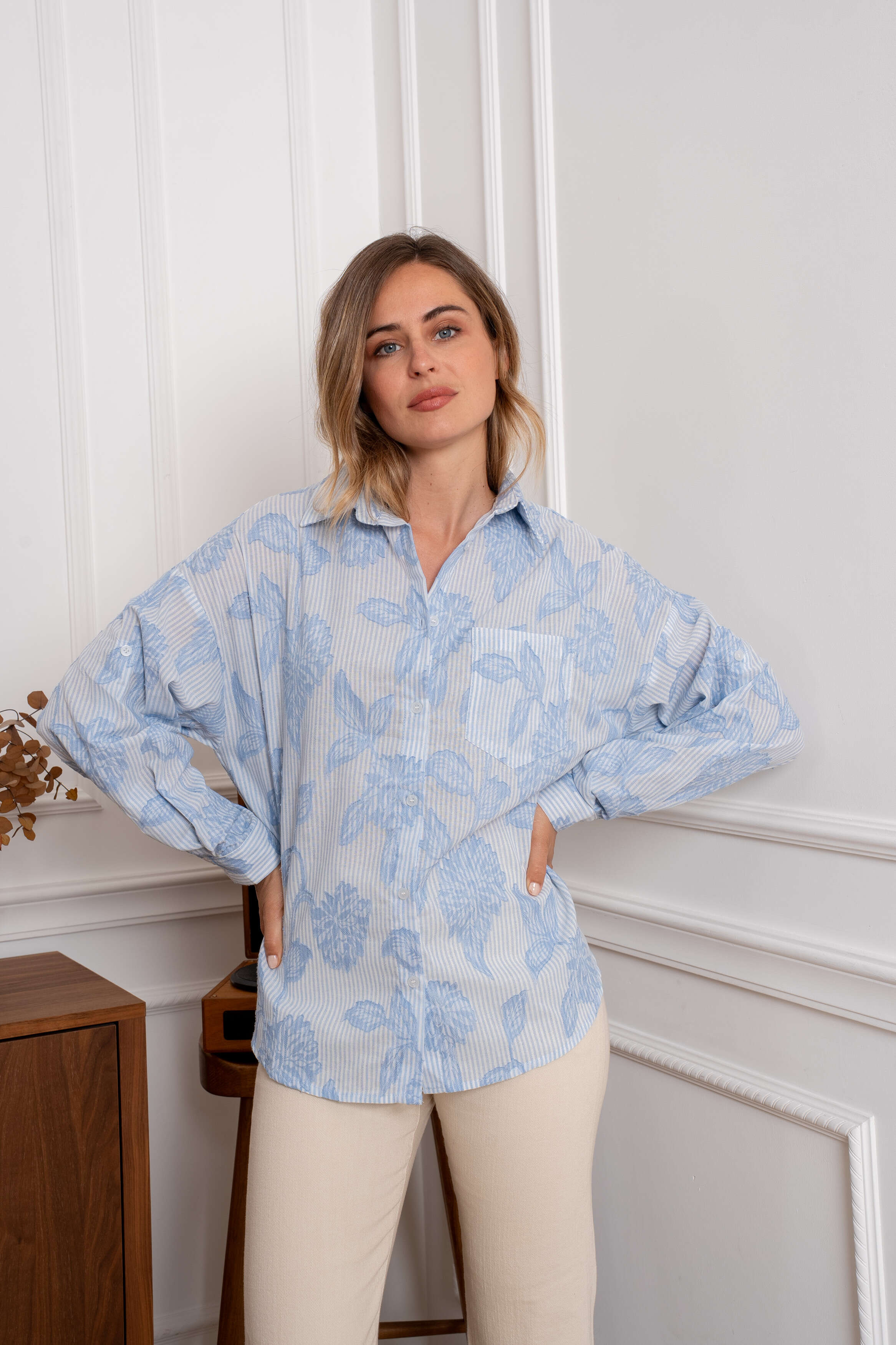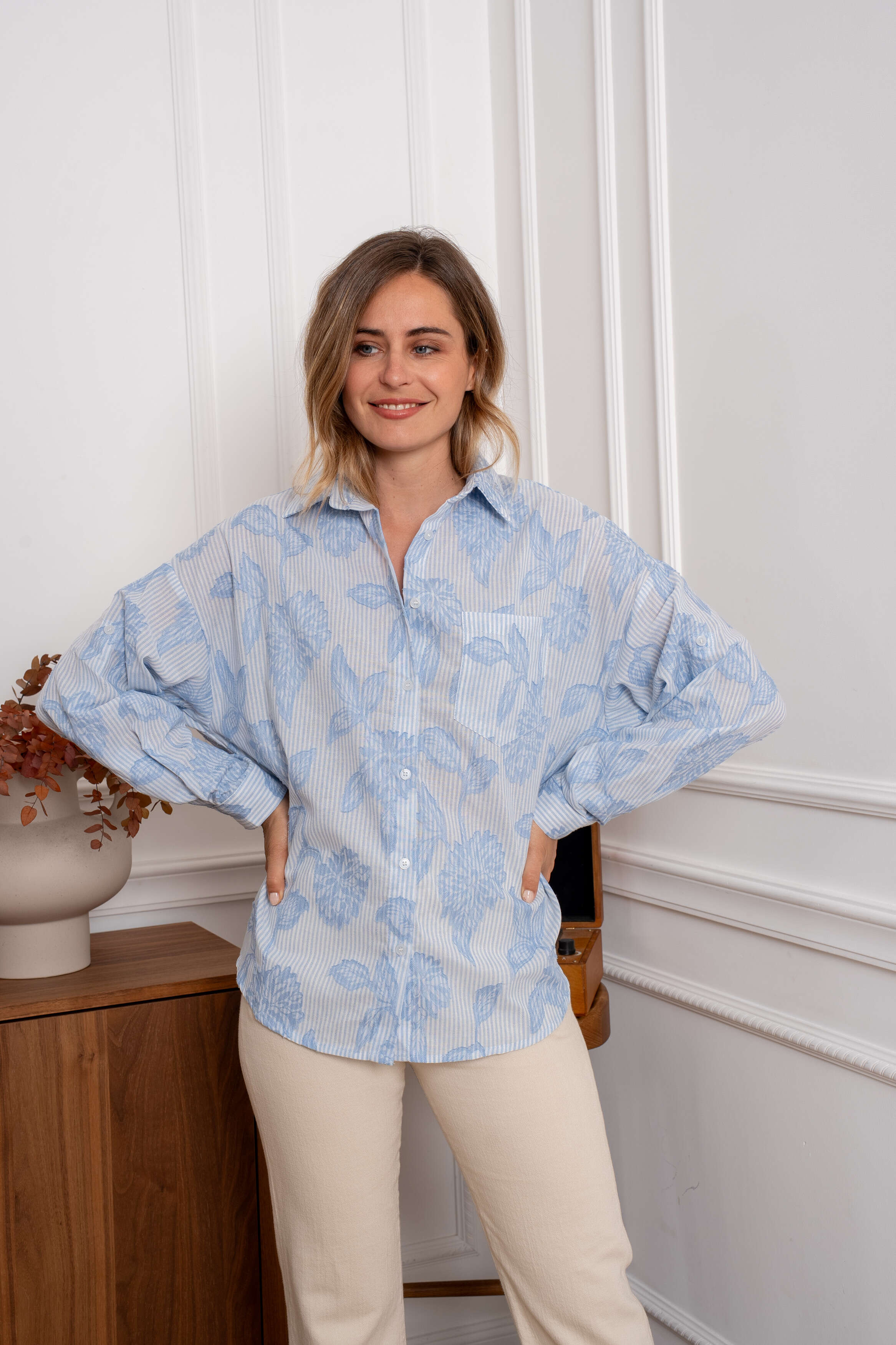 Zwiewna koszula o luźnym kroju z delikatnym kwiatowym wzorem, wykonana z lekkiego materiału, który zapewnia komfort i styl na co dzień.