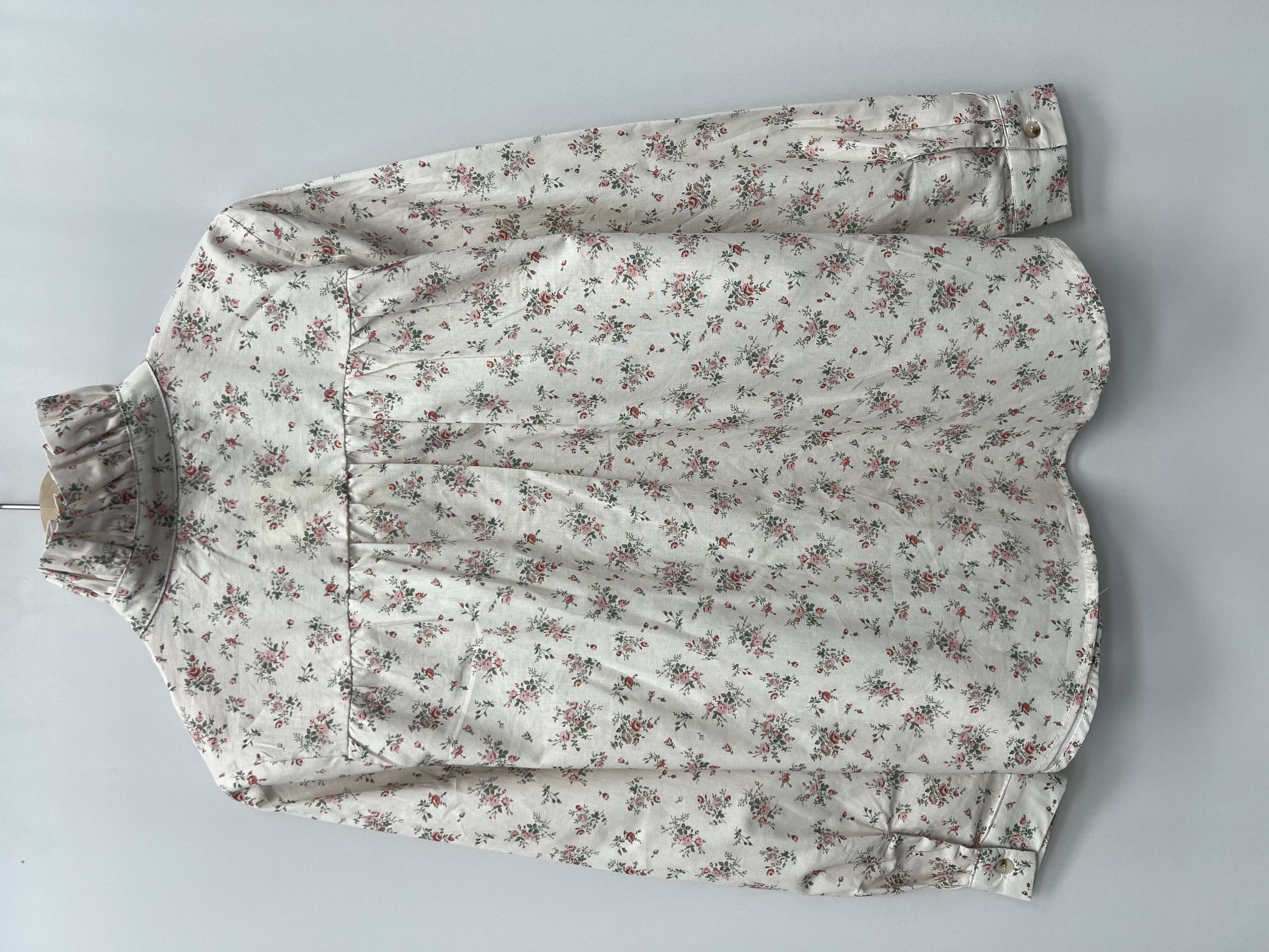 Delikatna koszula w beżowym kolorze z romantycznym kwiatowym wzorem, z efektowną stójką i eleganckimi guzikami.
