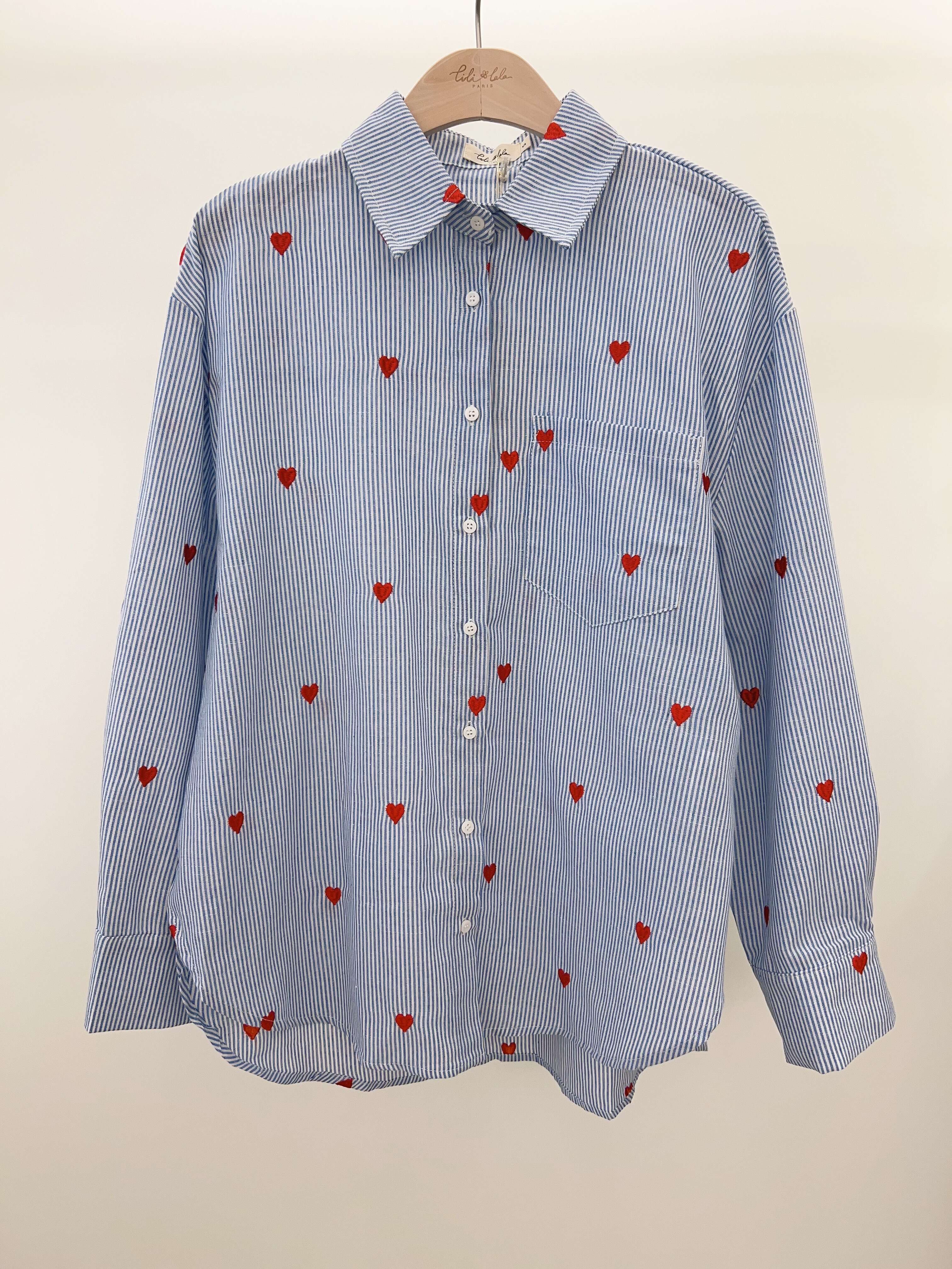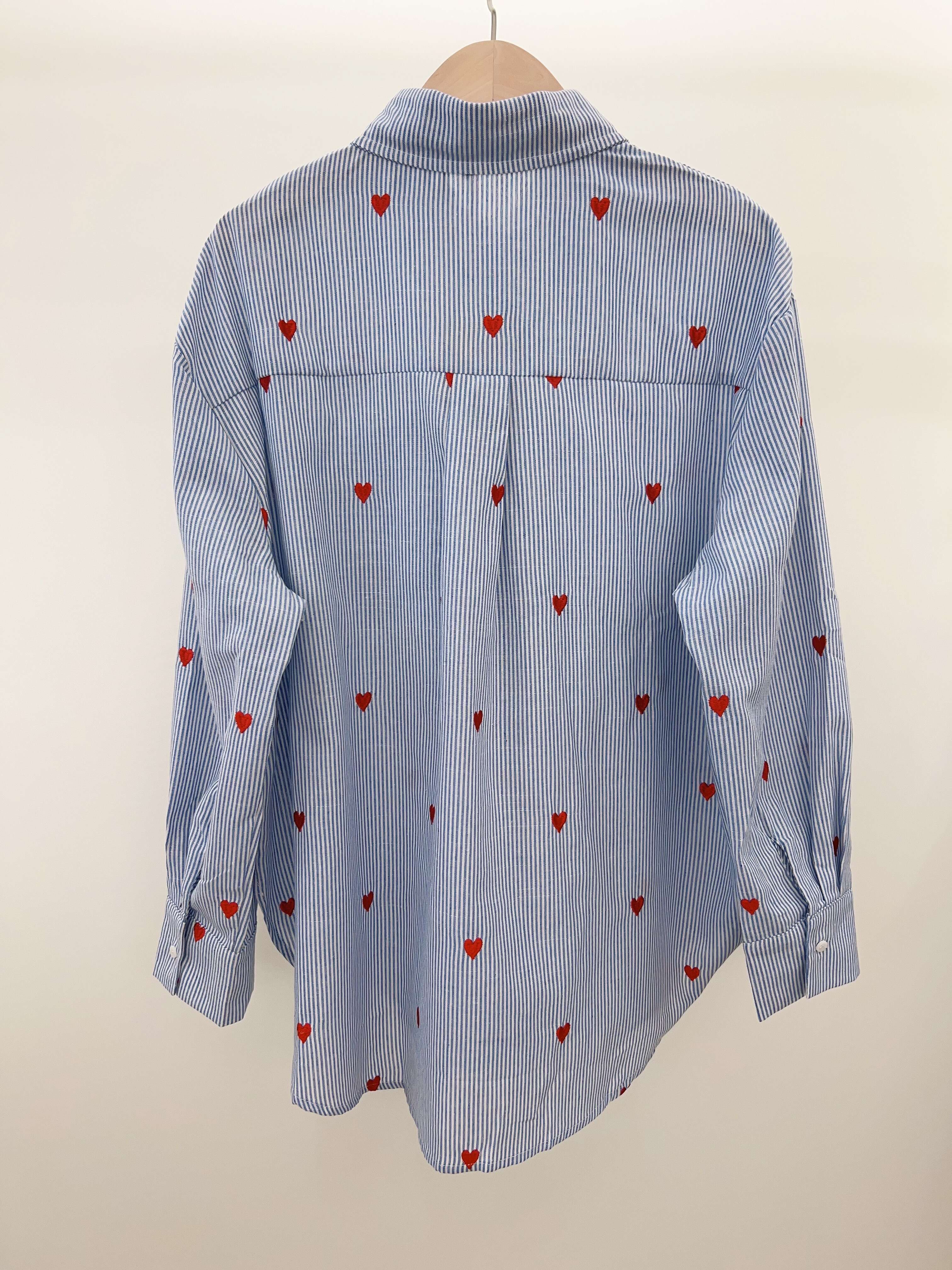 Nowoczesna koszula w niebiesko-białe paski ozdobiona romantycznymi haftami czerwonych serc, wykonana z lekkiej, wygodnej tkaniny.