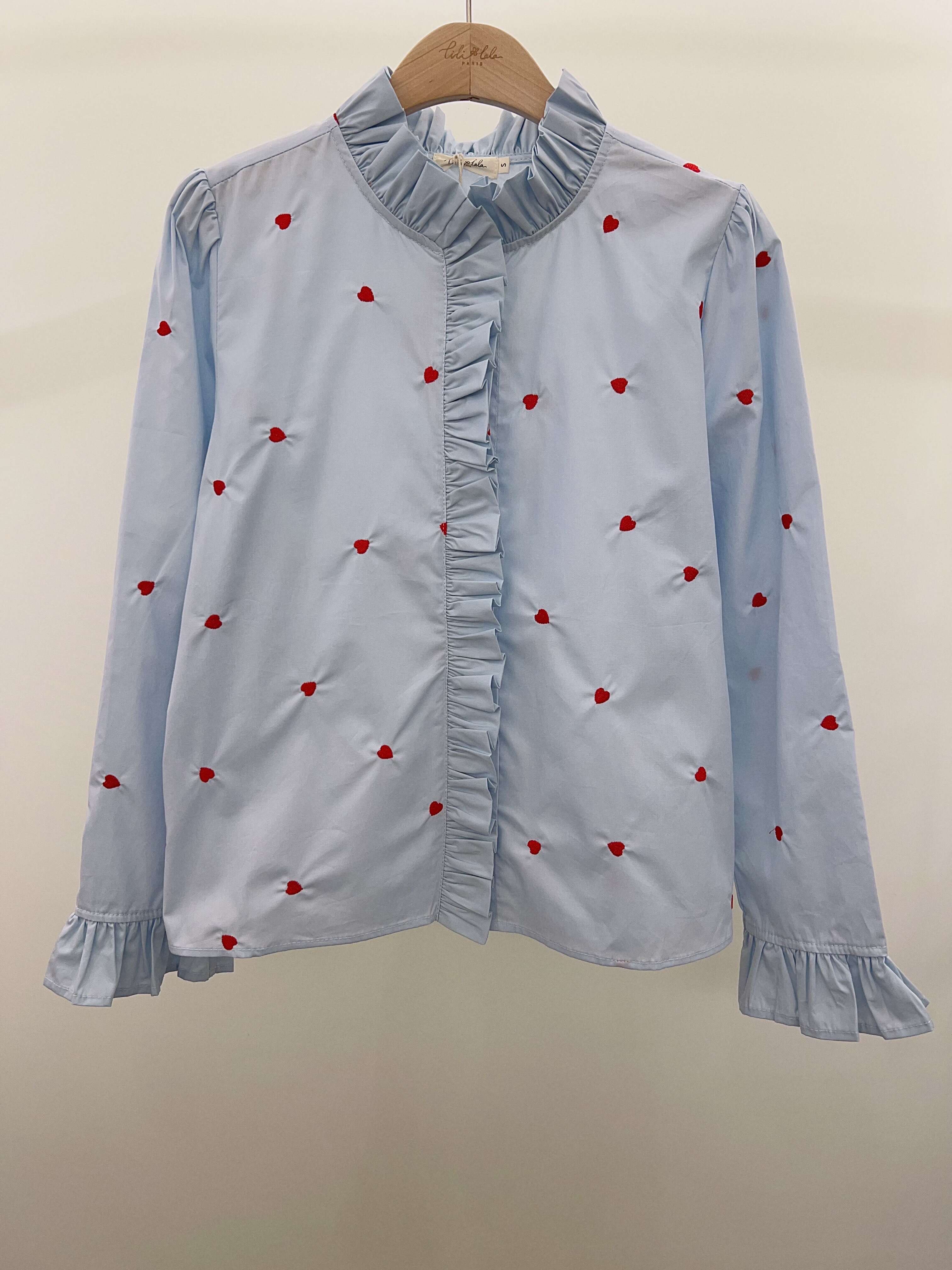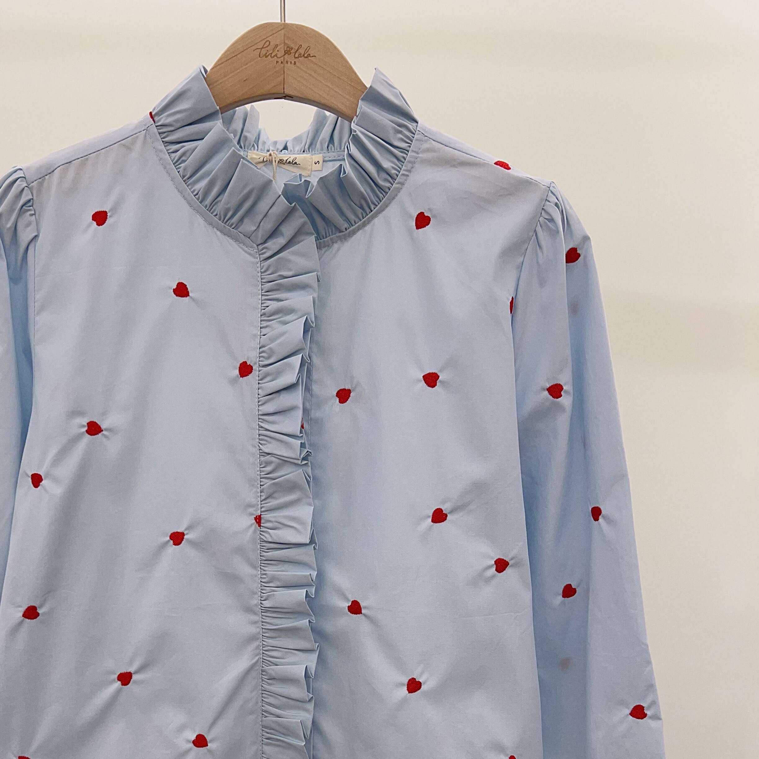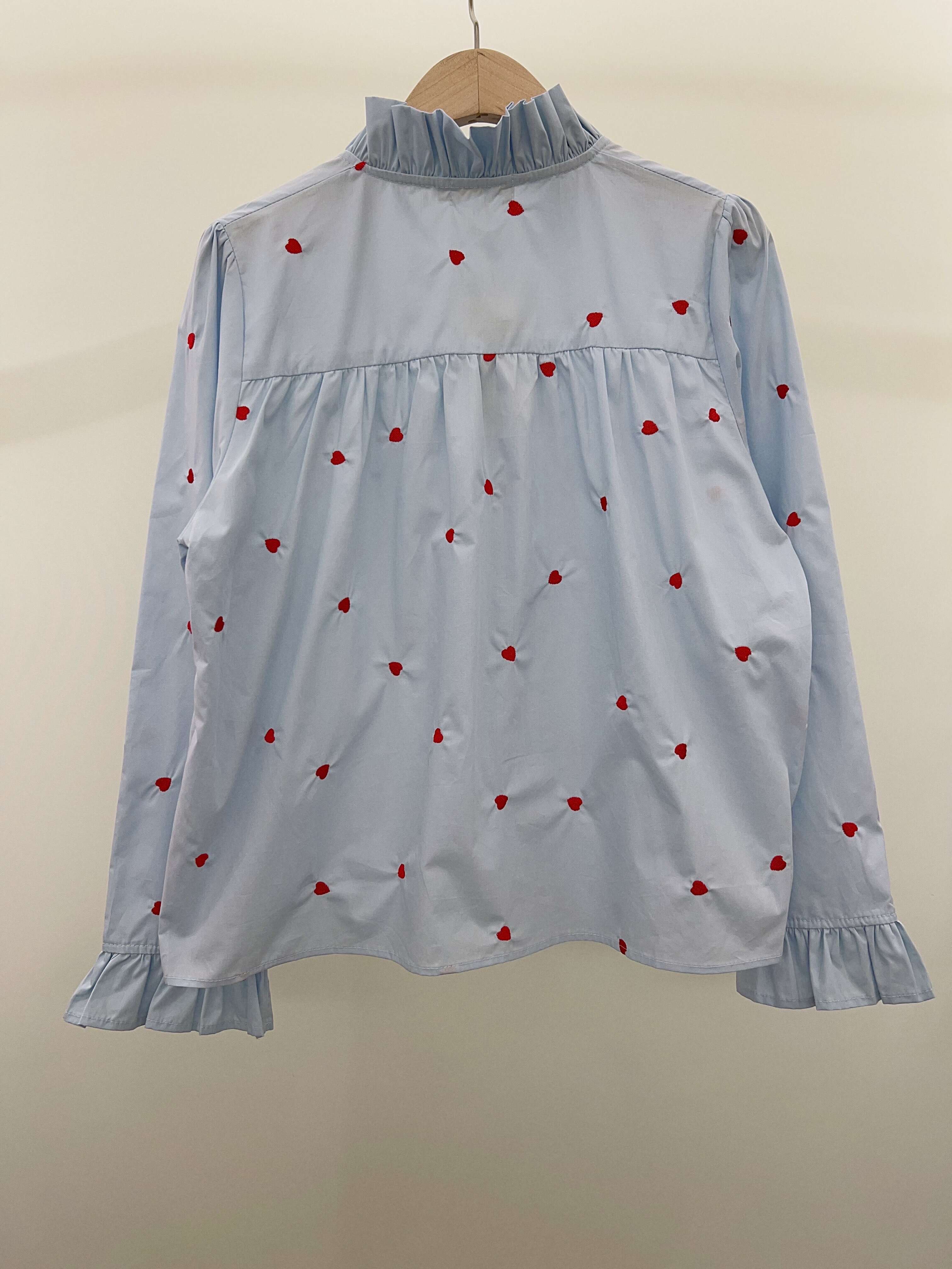 Koszula w błękitnym kolorze z romantycznymi, czerwonymi zdobieniami, delikatna falbanka przy dekolcie, klasyczny fason i najwyższa jakość materiału.