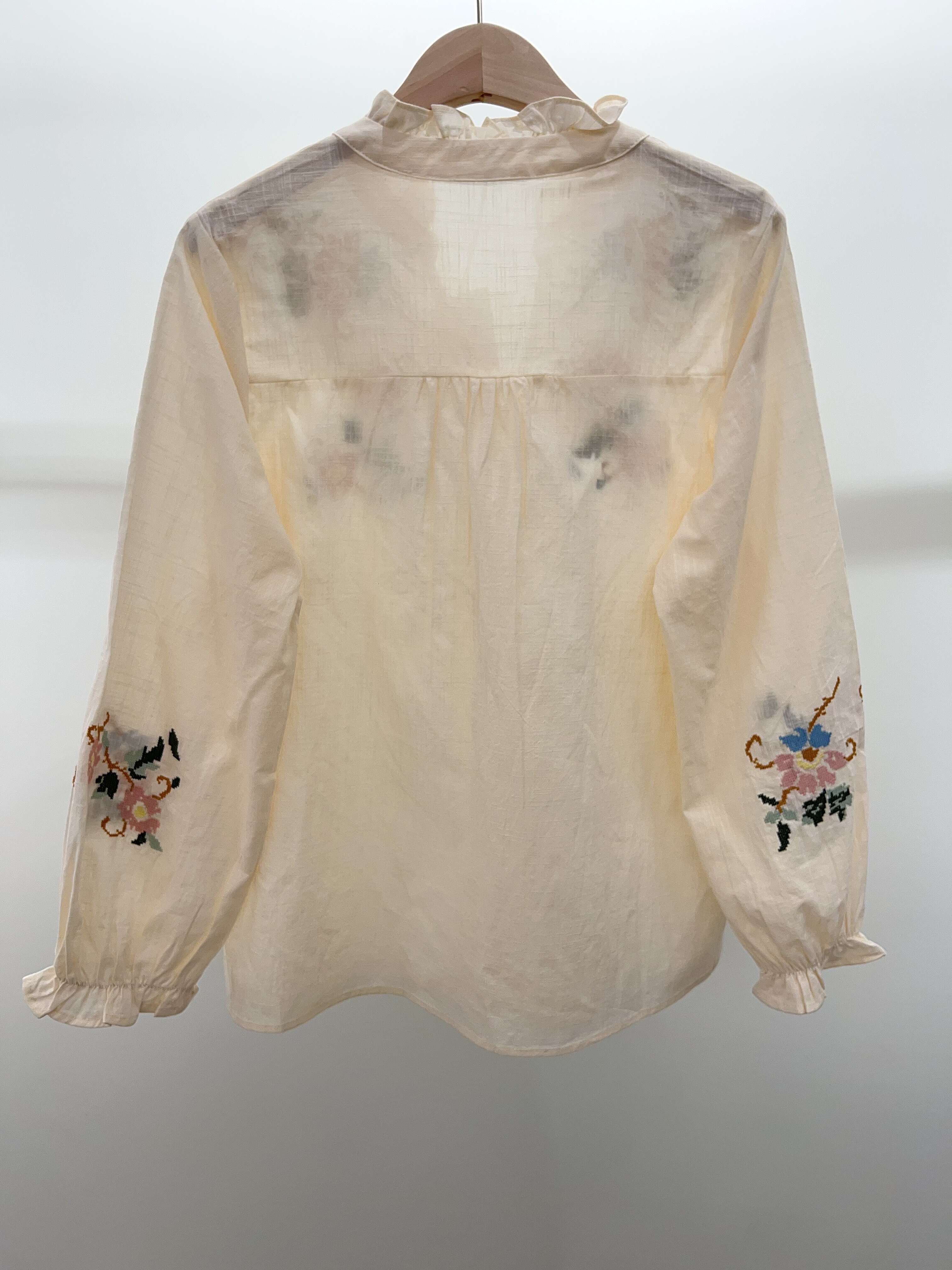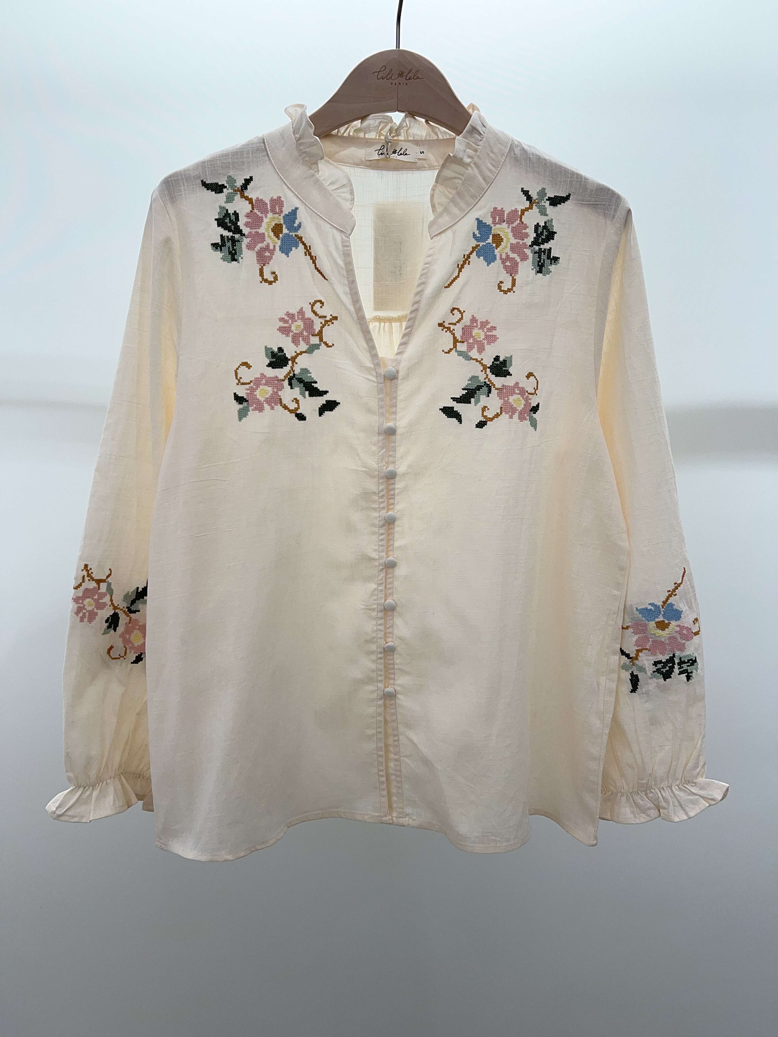 Subtelna koszula w odcieniu beżu z delikatnym, kwiatowym haftem i romantyczną stójką. Miękki, przewiewny materiał gwarantuje komfort i wyjątkowy styl na każdą okazję.