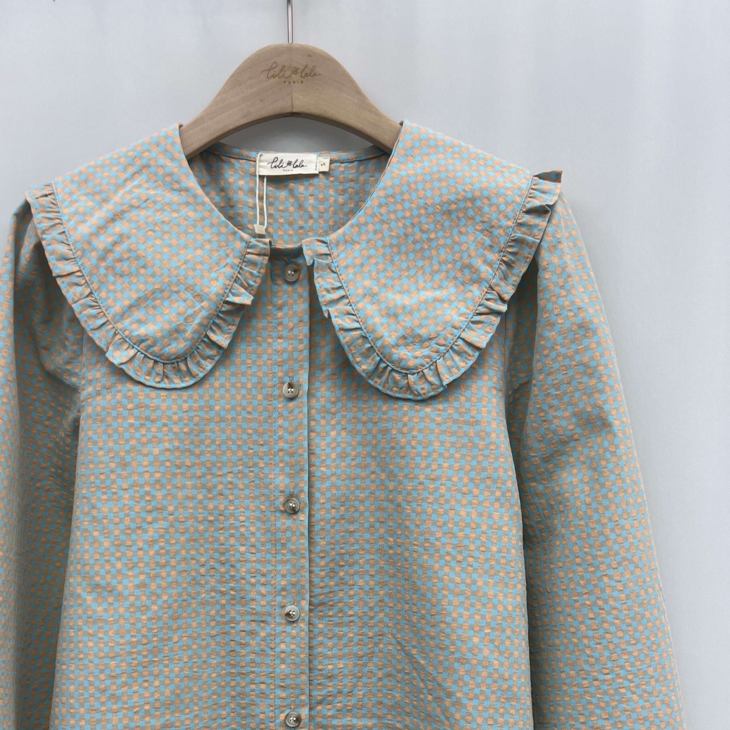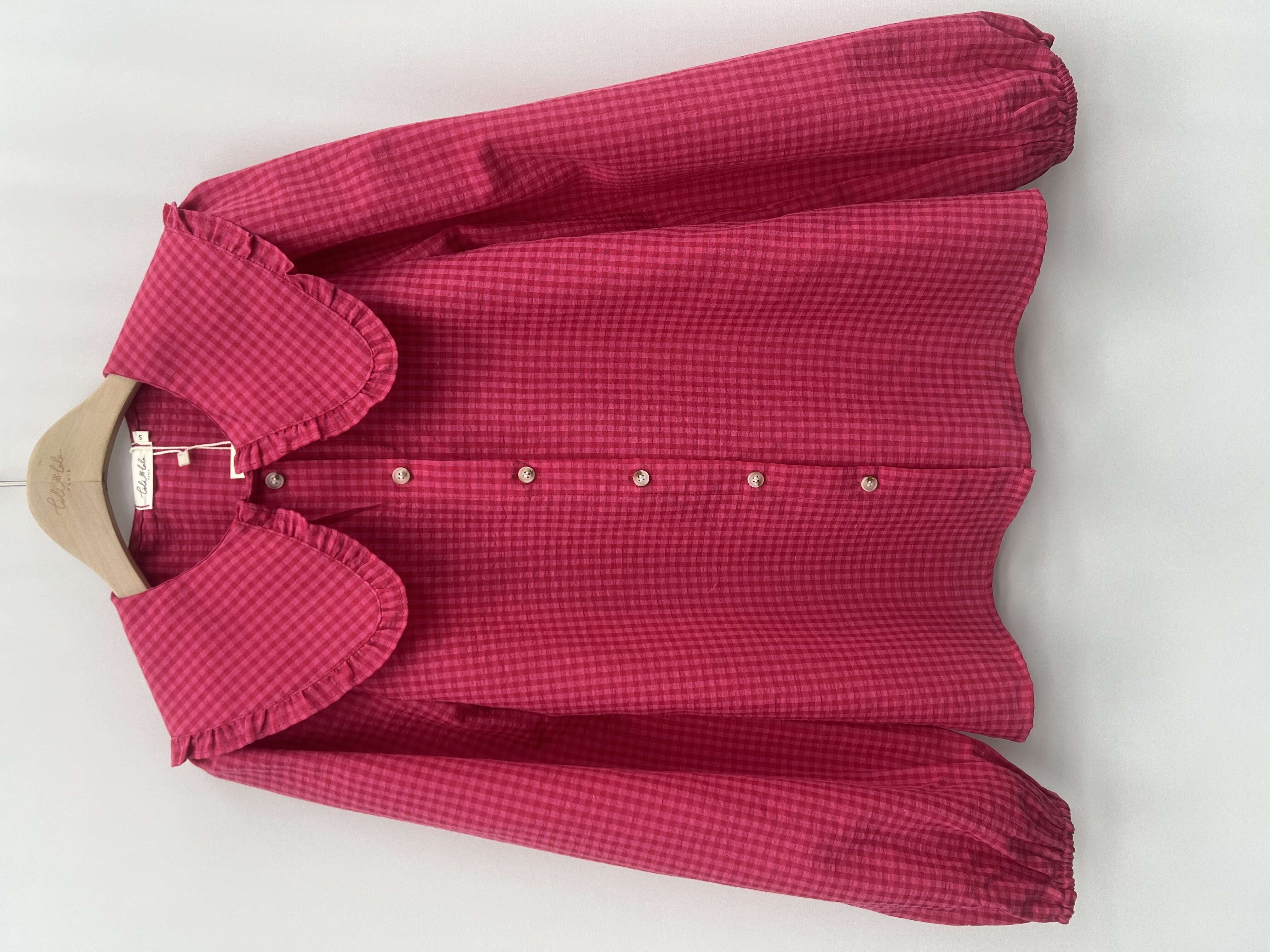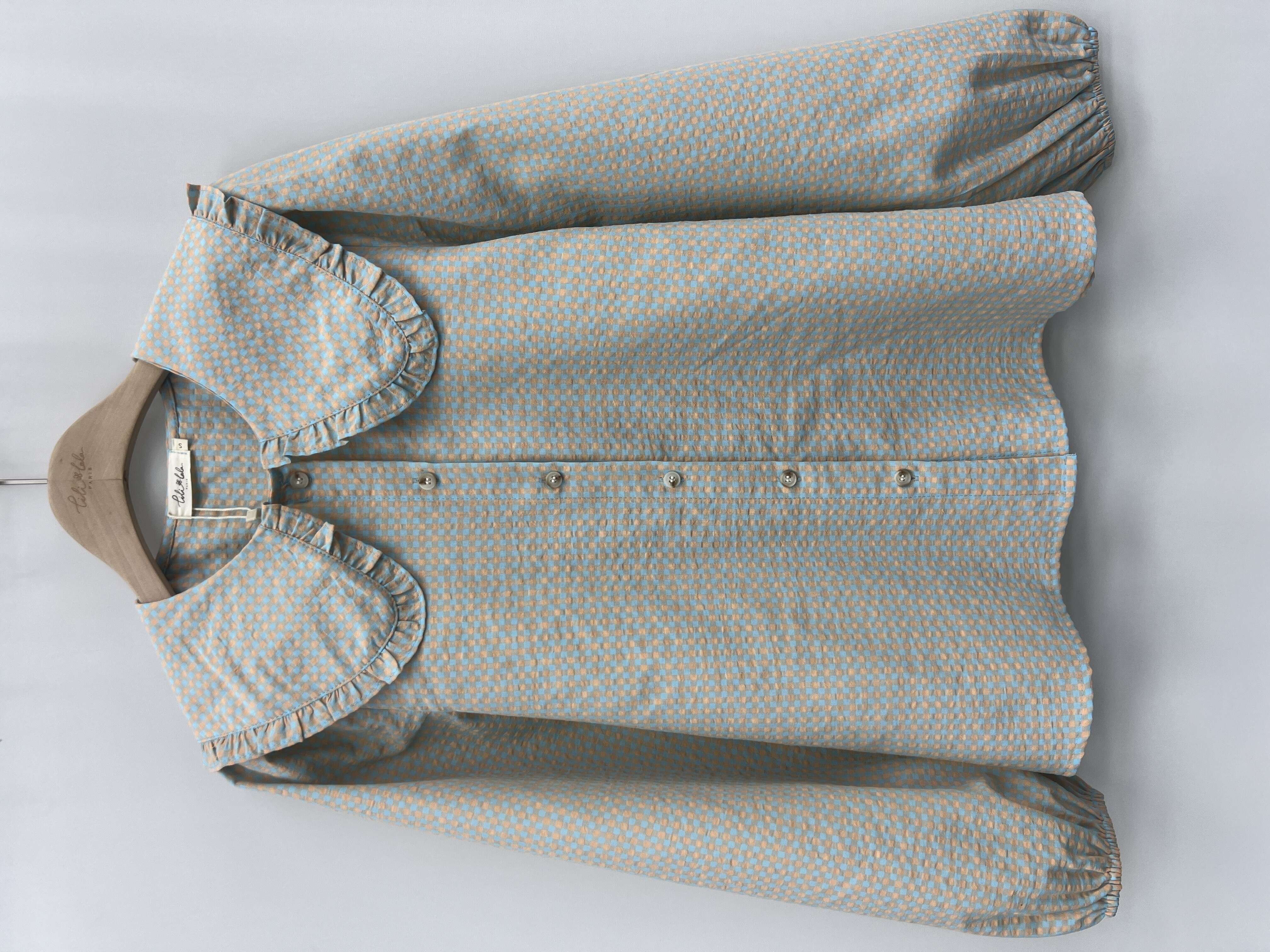Modna koszula o prostym kroju z efektownym falbaniastym kołnierzem; wygodna i stylowa, wykonana z wysokiej jakości materiału.