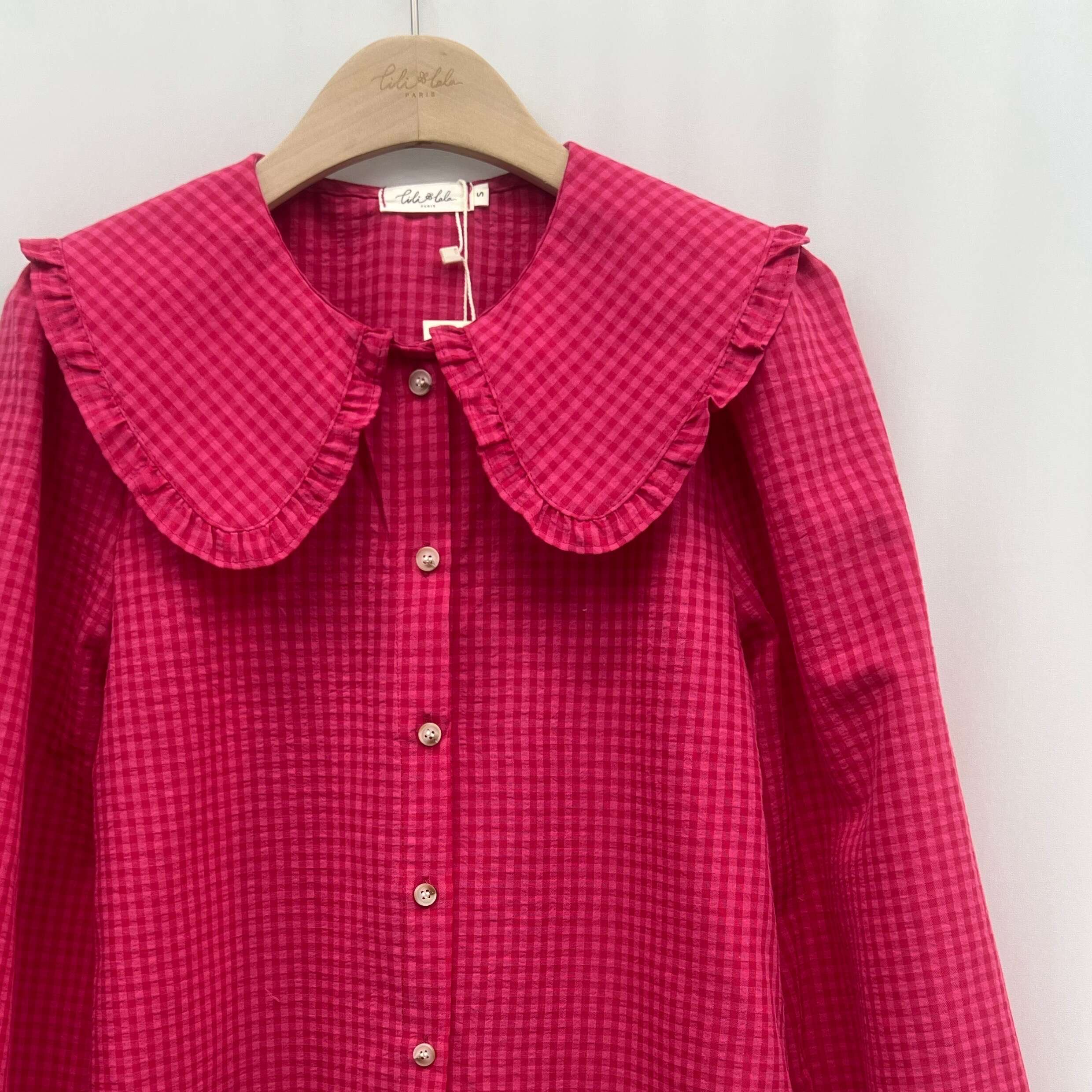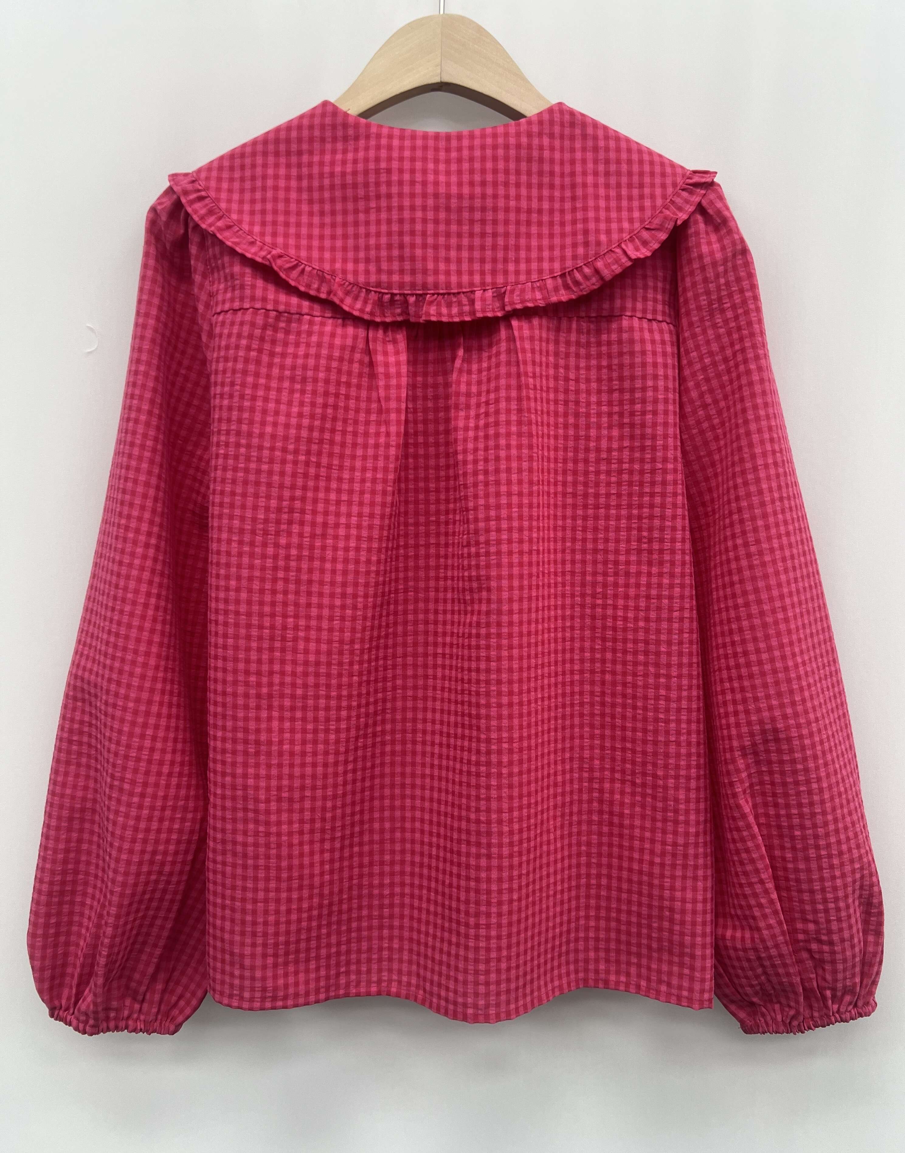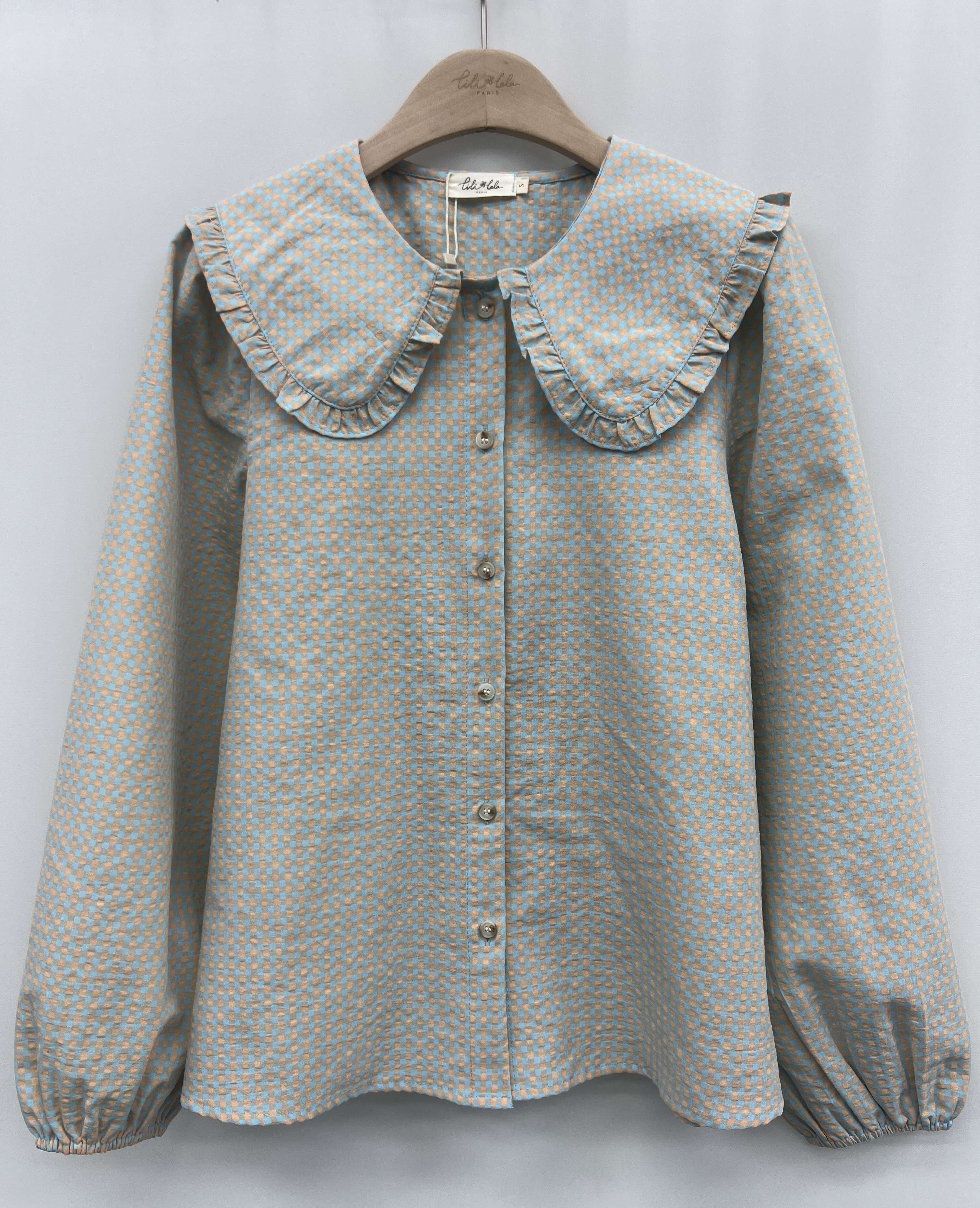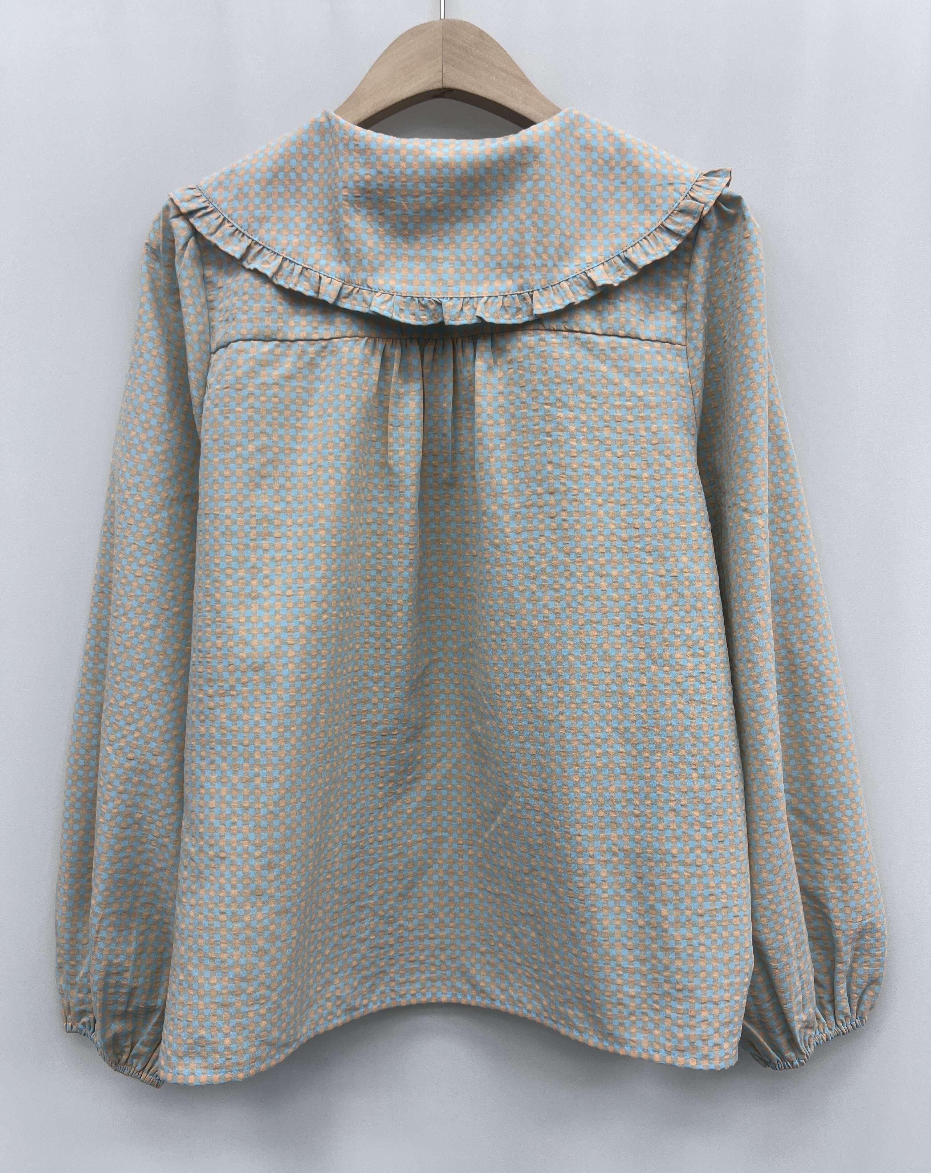 Modna koszula o prostym kroju z efektownym falbaniastym kołnierzem; wygodna i stylowa, wykonana z wysokiej jakości materiału.