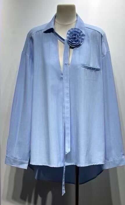 Nowoczesna koszula o swobodnym kroju z efektownym, materiałowym kwiatem przy dekolcie. Wygodny fason i wyjątkowe detale sprawiają, że to must-have na każdy sezon.