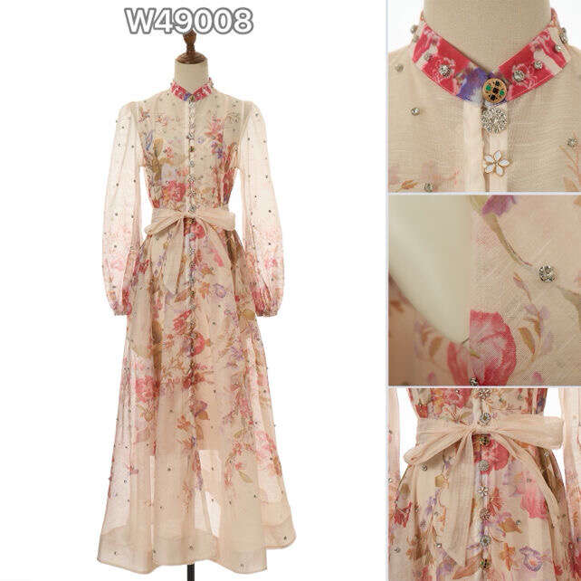 Zwiewna sukienka maxi w kolorze beżowym z florystycznym motywem, ozdobiona delikatnymi kryształkami i wiązaniem w talii.