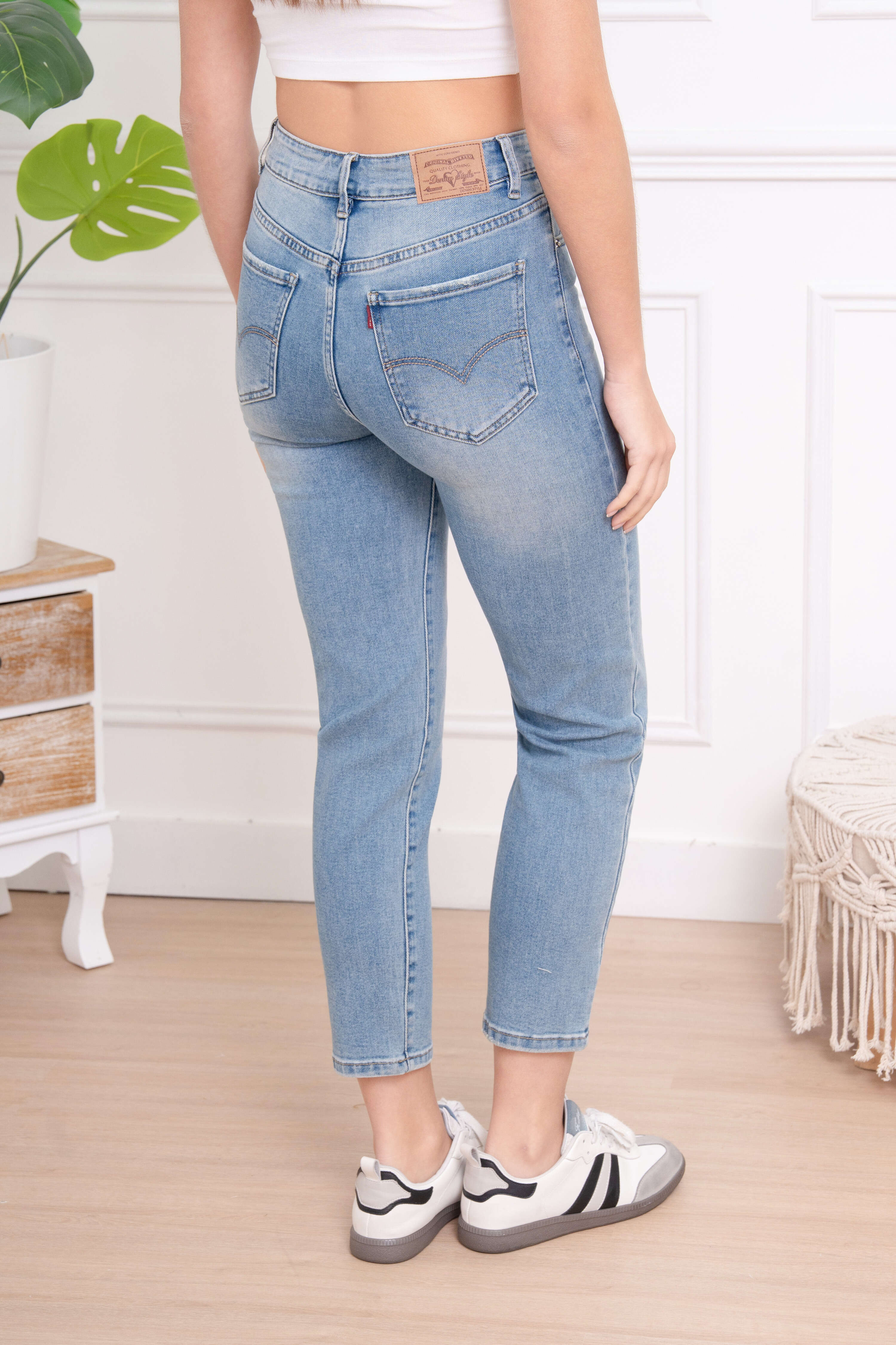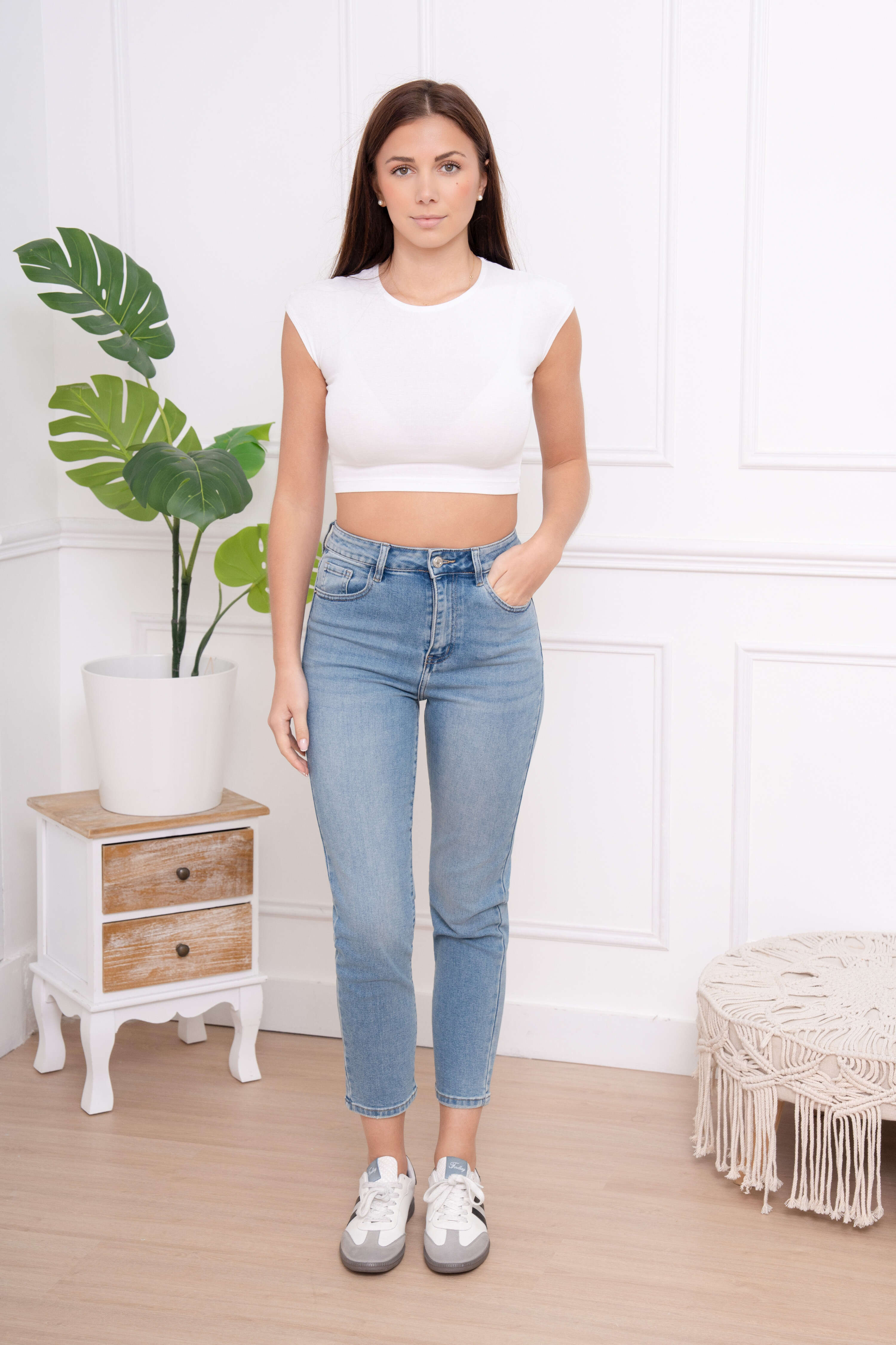 Klasyczny jeansowy fason z wysokim stanem podkreślający sylwetkę, wygodny materiał i ponadczasowy styl na każdą okazję.