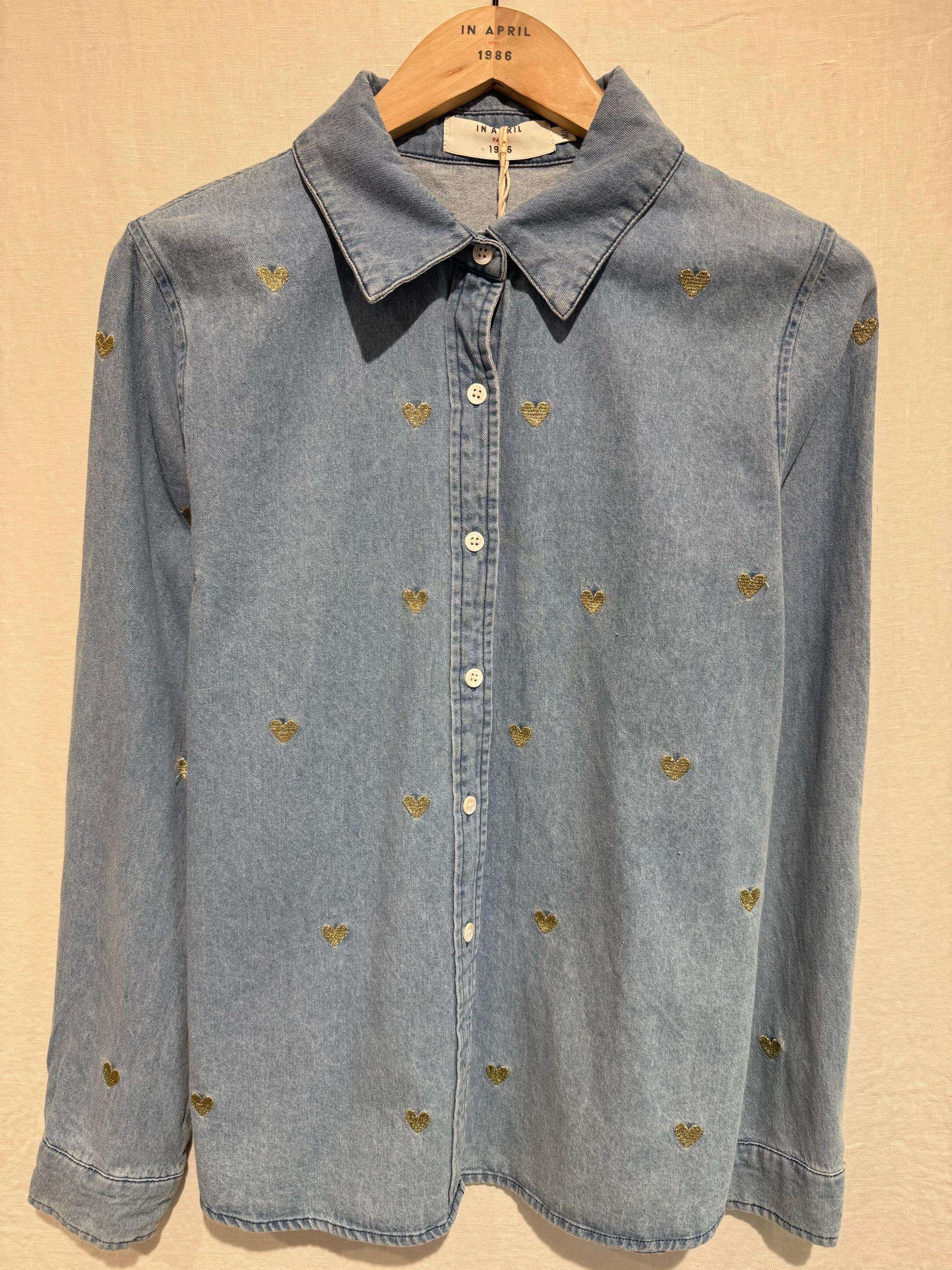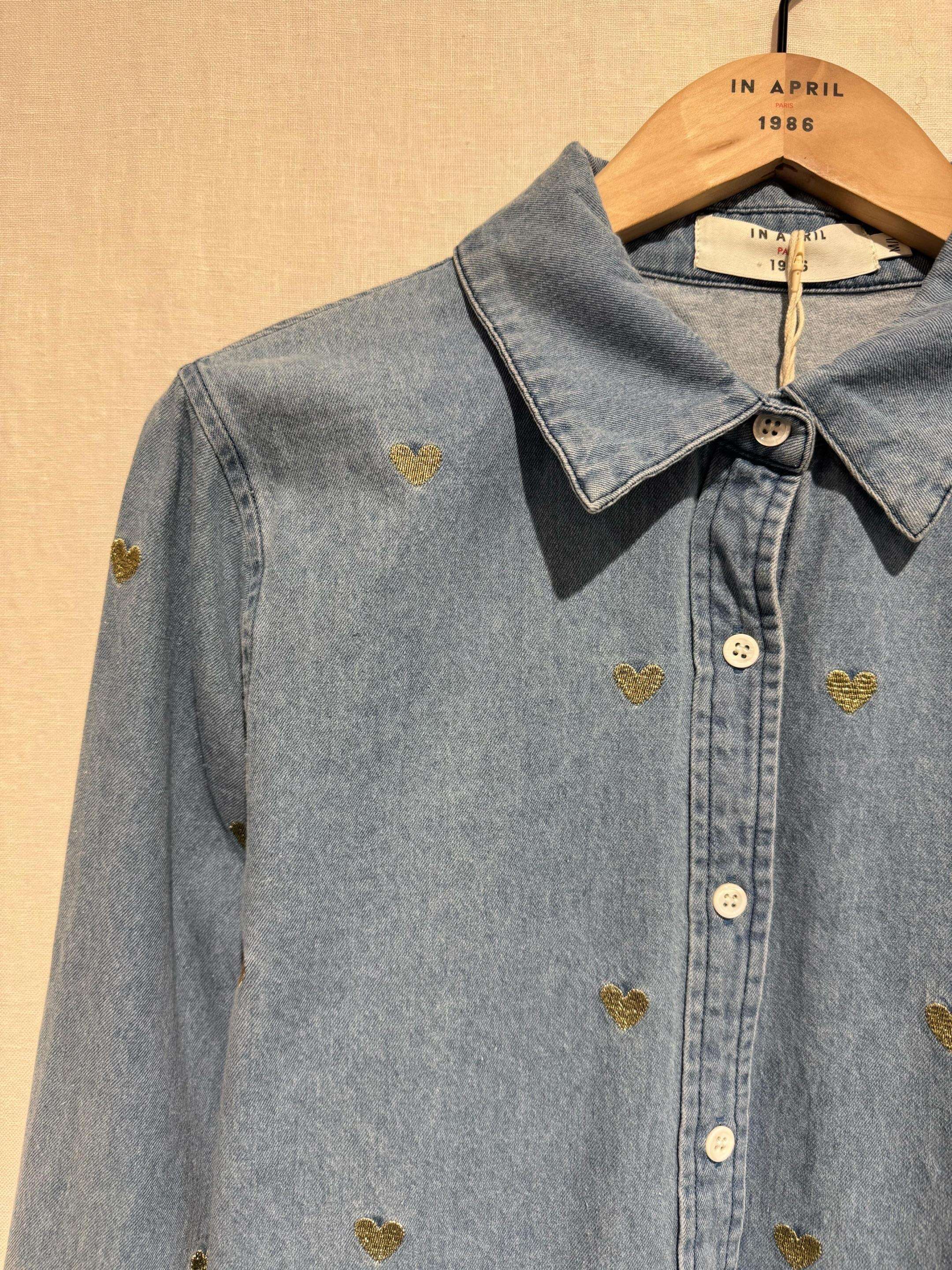 Jeansowa koszula z modnym krojem, ozdobiona uroczymi, złotymi serduszkami. Komfortowa, unikalna i stylowa propozycja na każdą okazję.