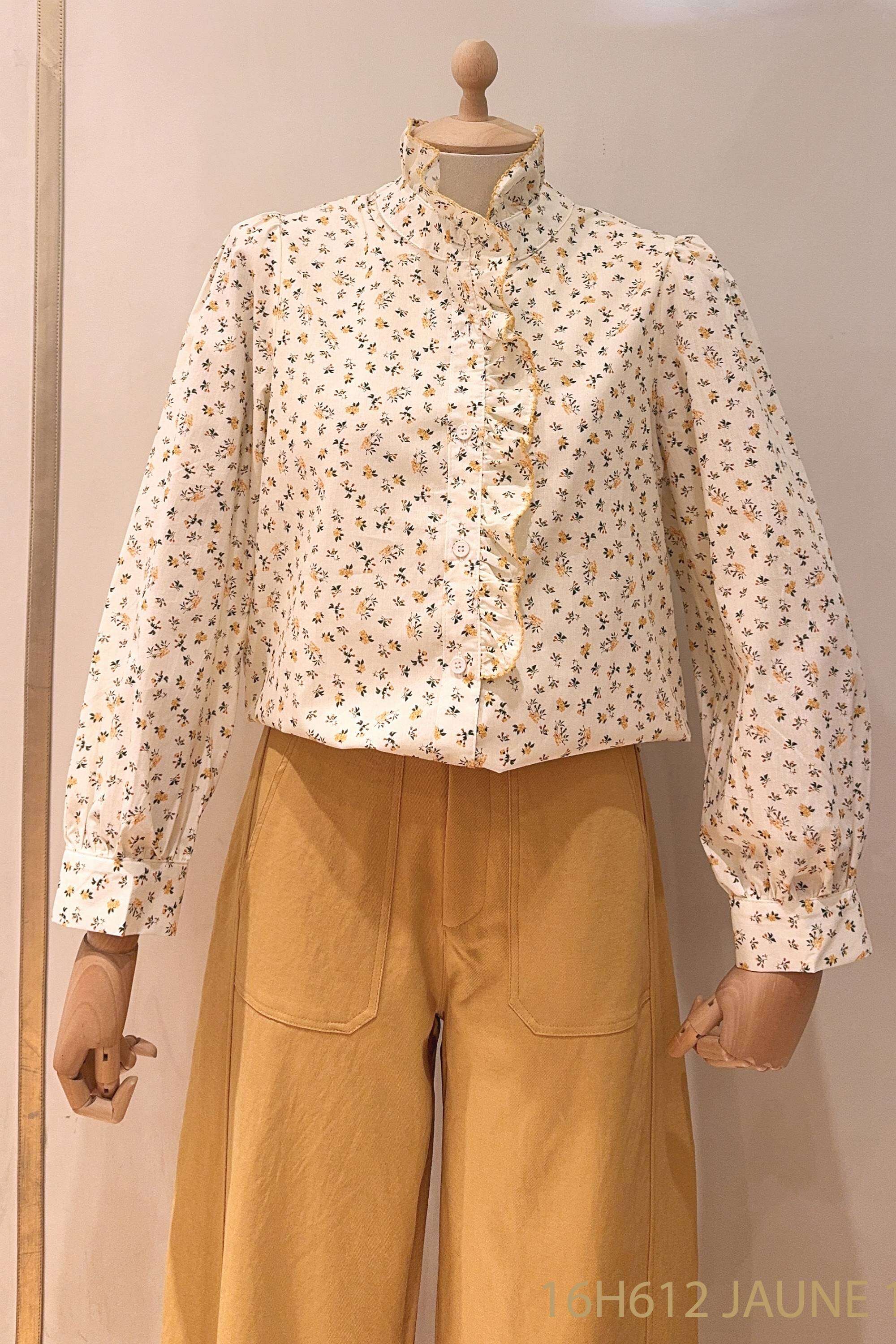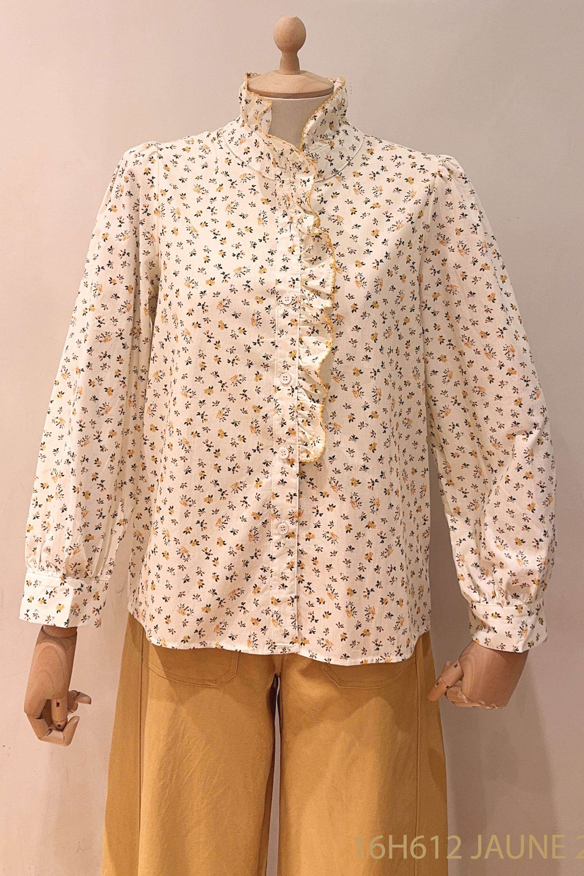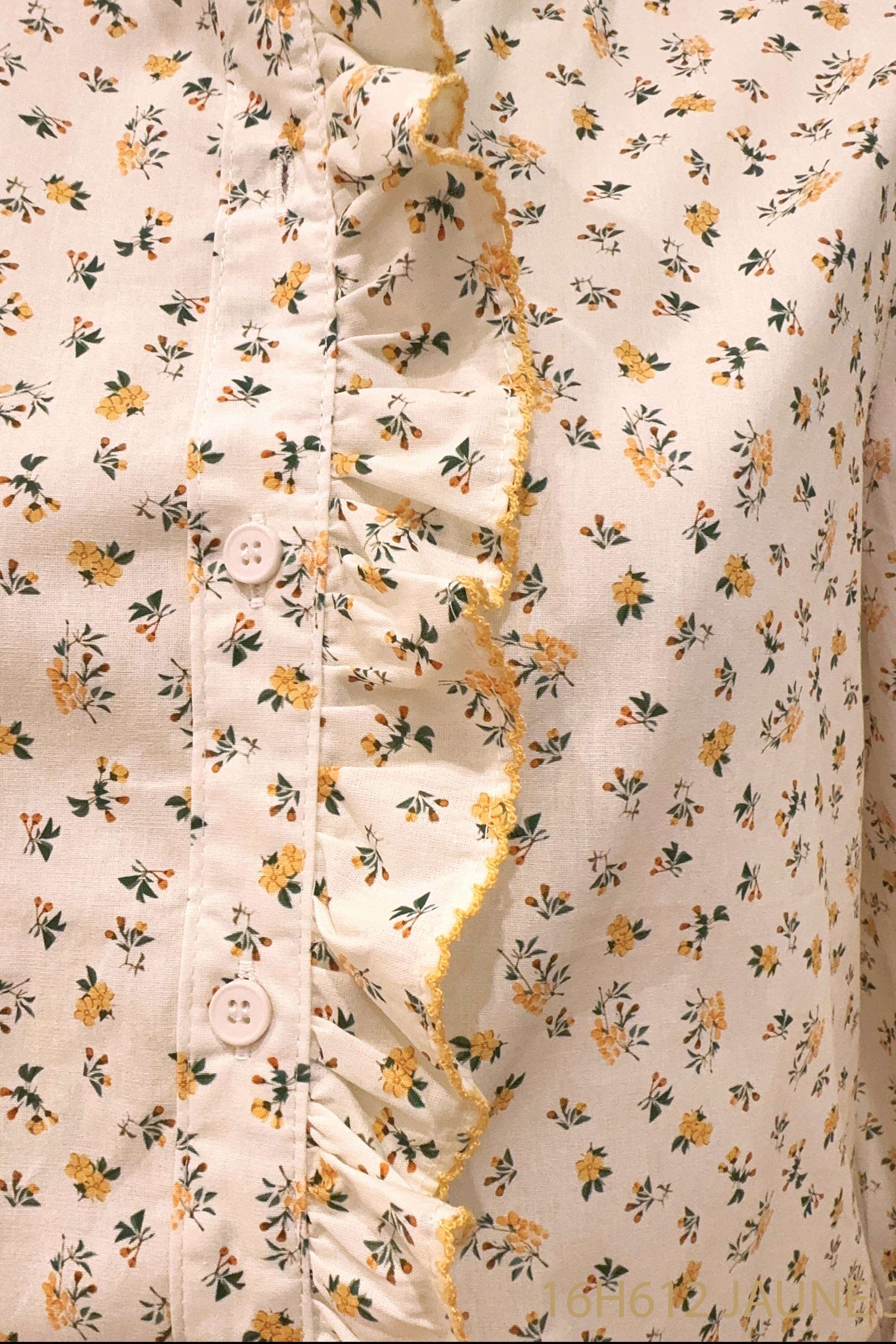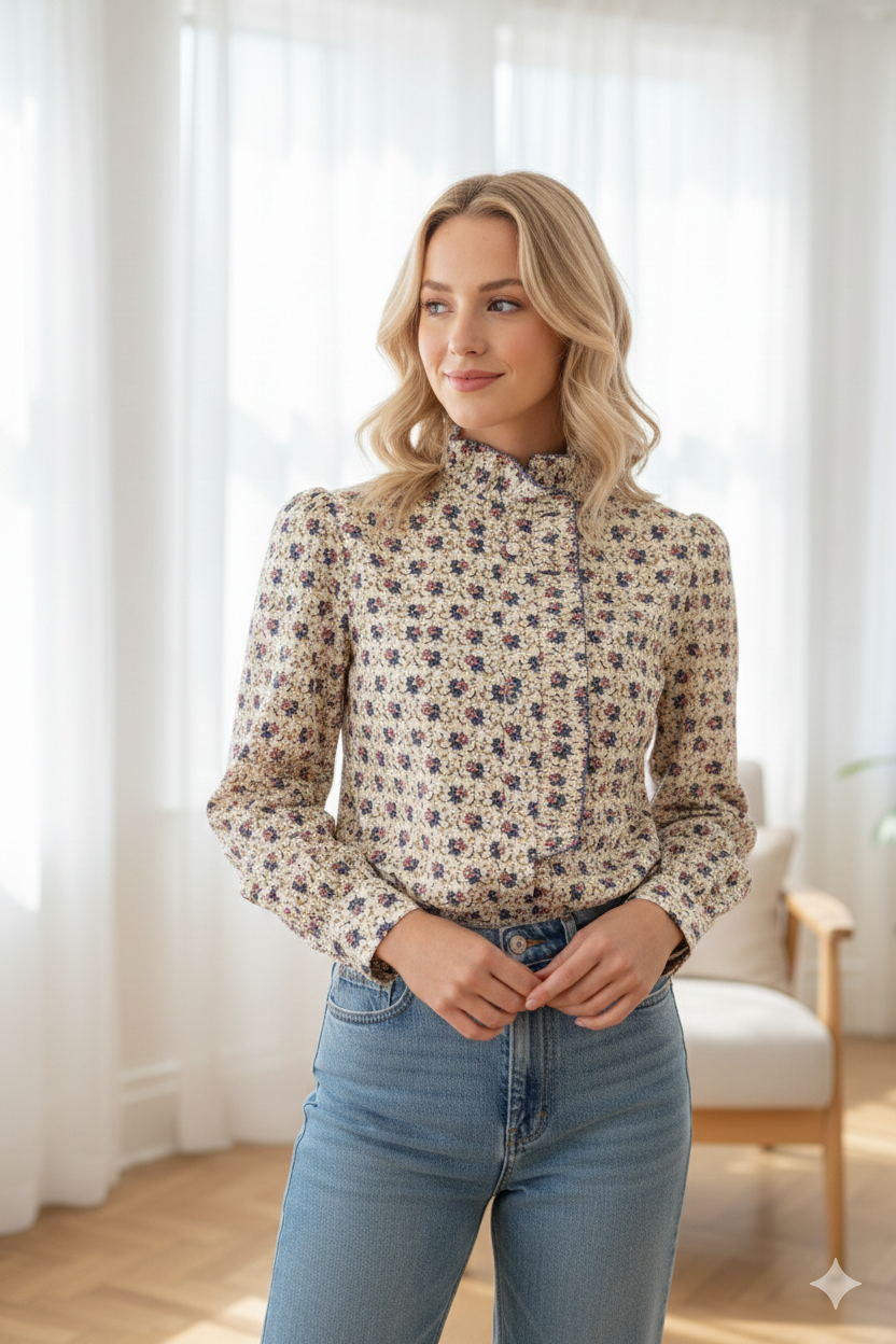 Koszula o romantycznym kroju z delikatną falbaną, wykonana z przewiewnego materiału, ozdobiona subtelnym kwiatowym wzorem.