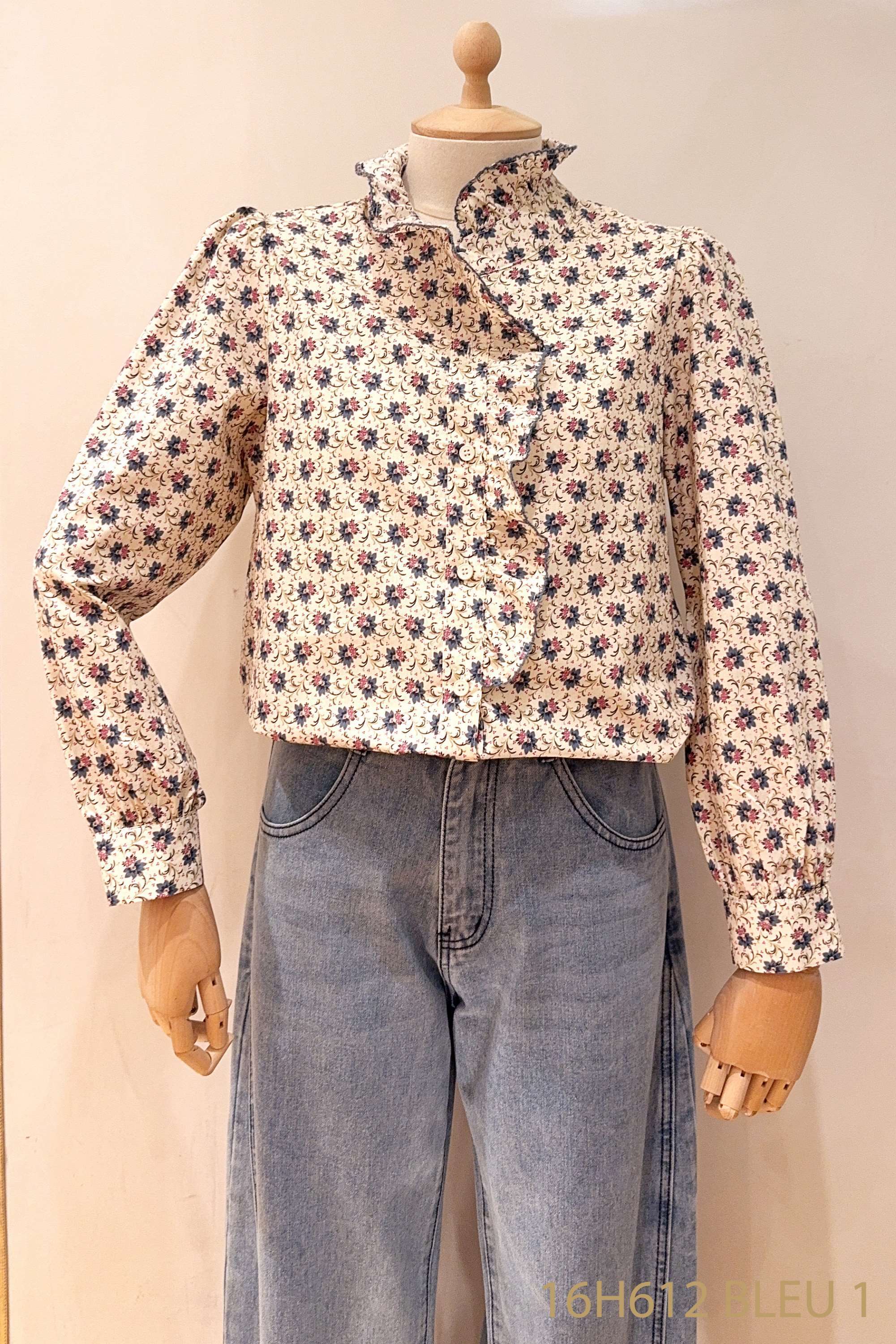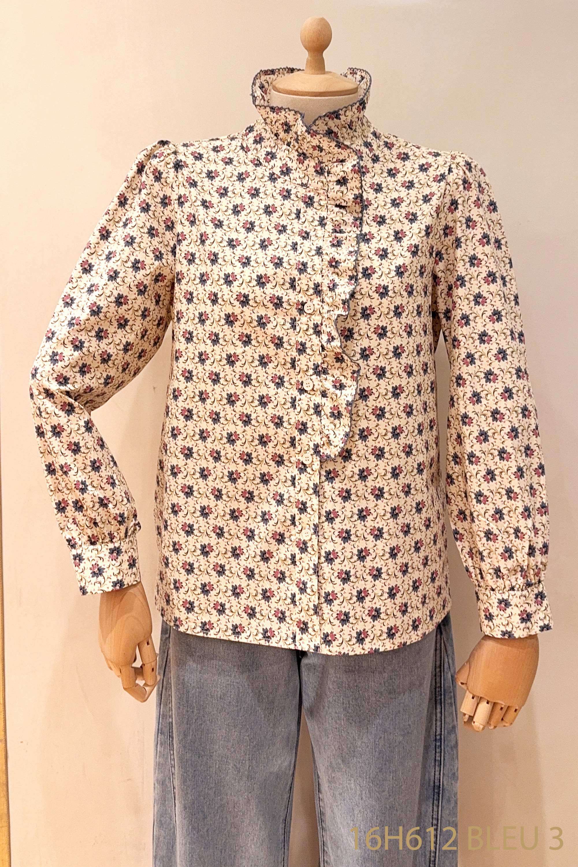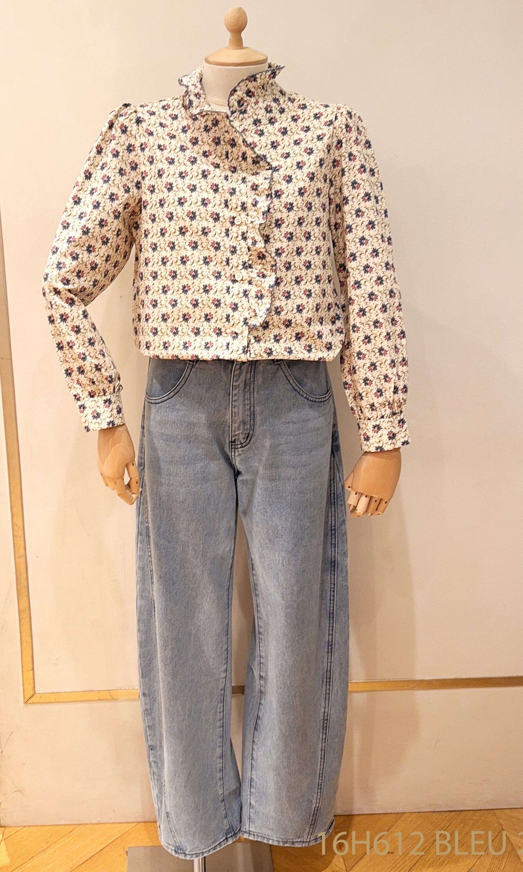 Koszula o romantycznym kroju z delikatną falbaną, wykonana z przewiewnego materiału, ozdobiona subtelnym kwiatowym wzorem.