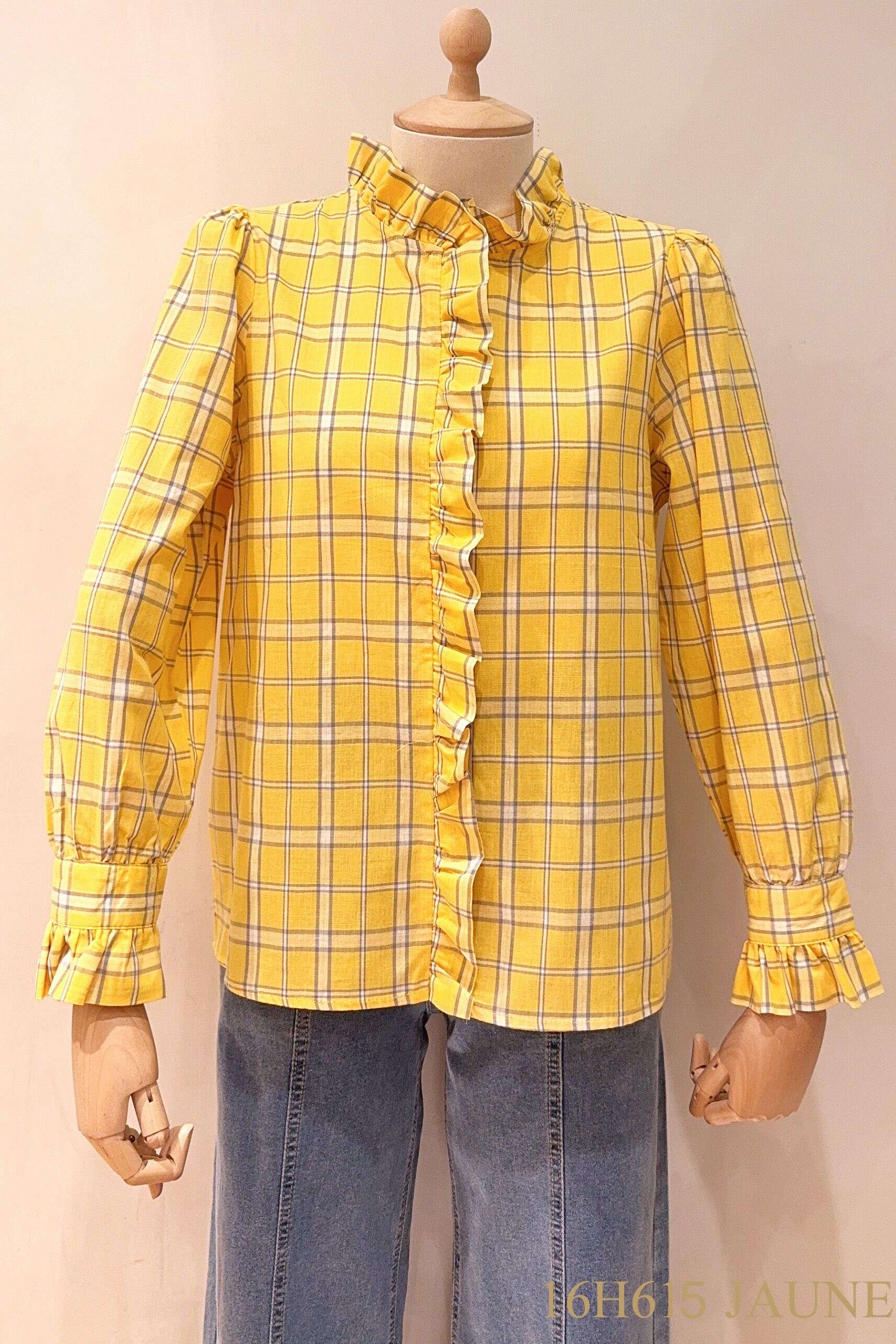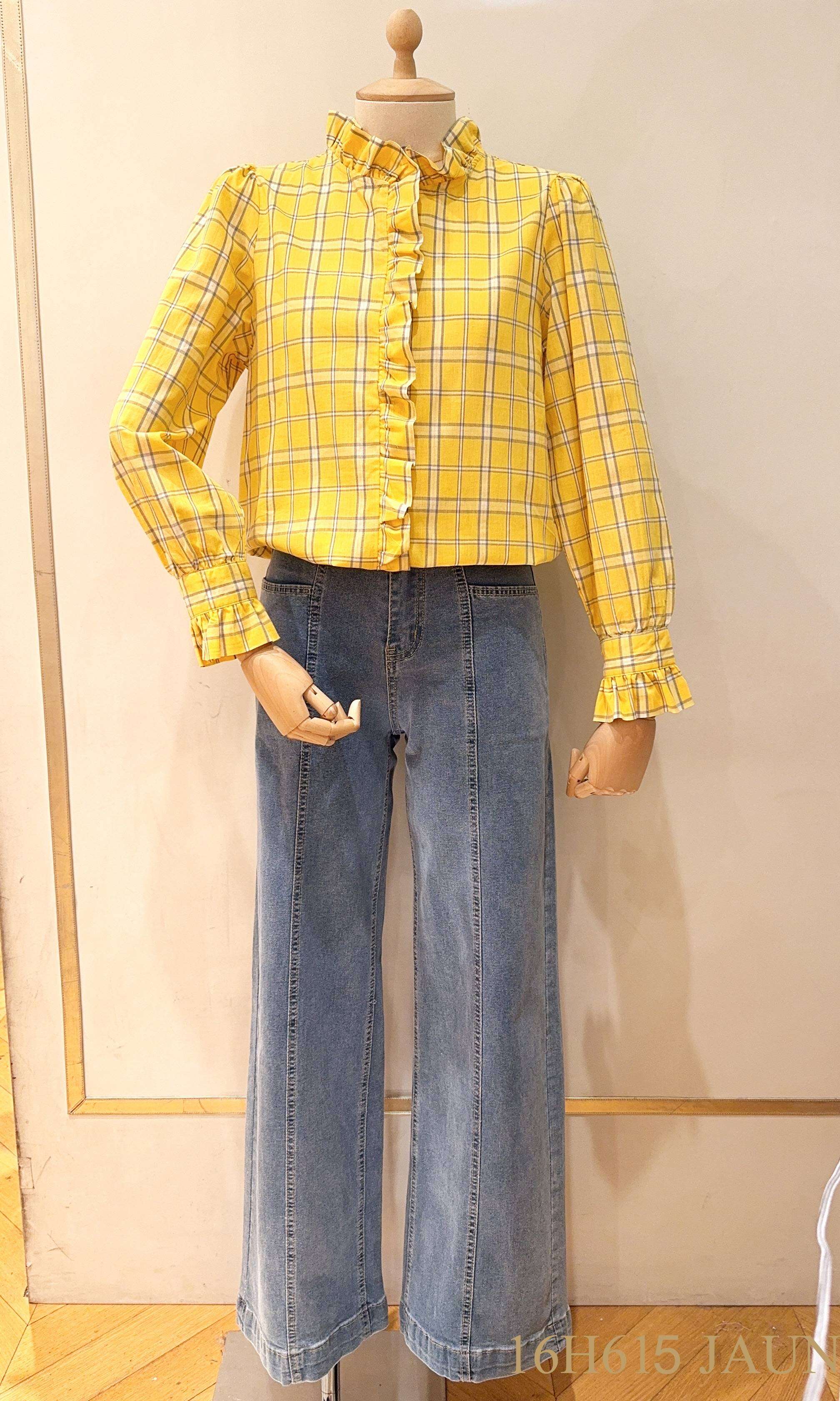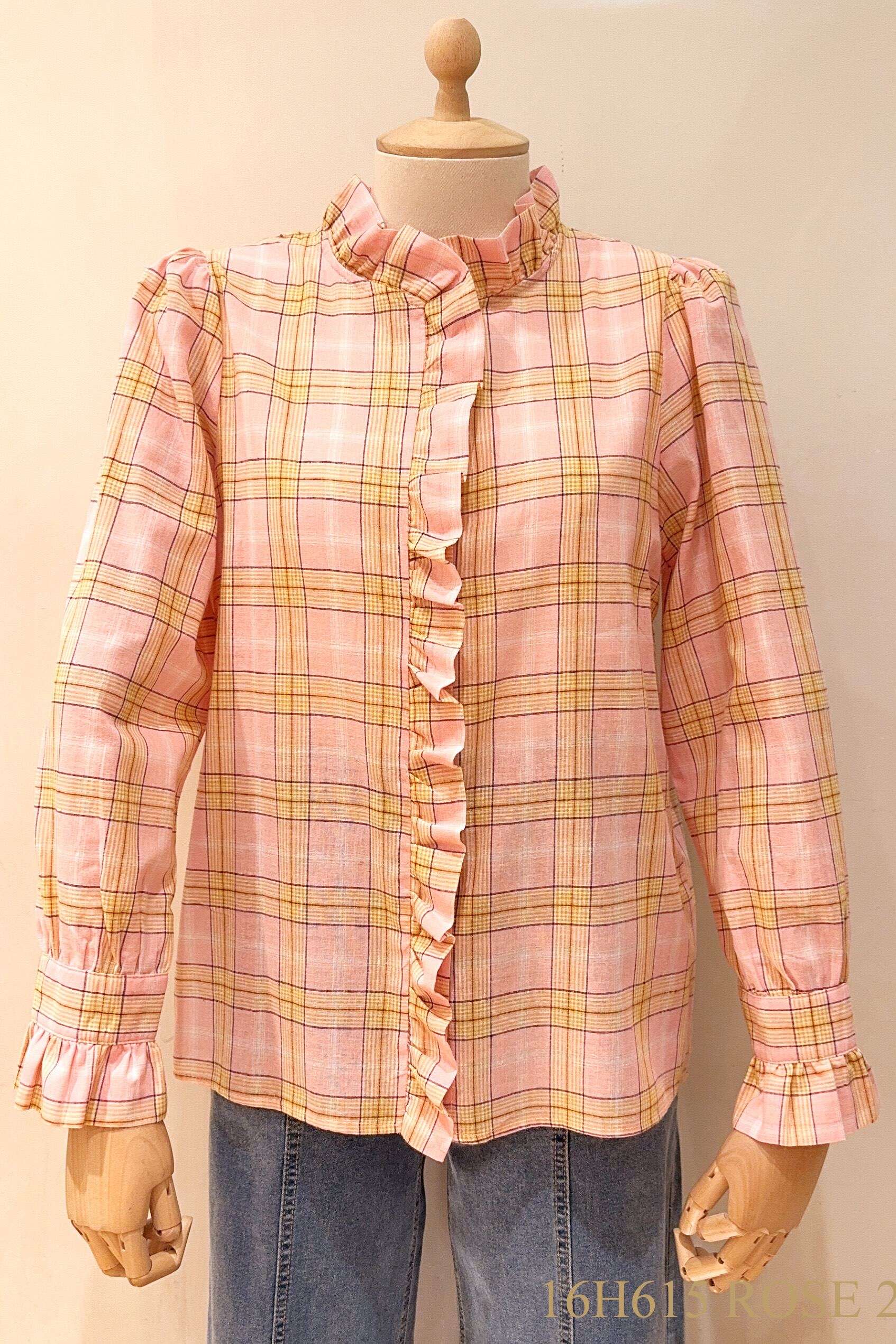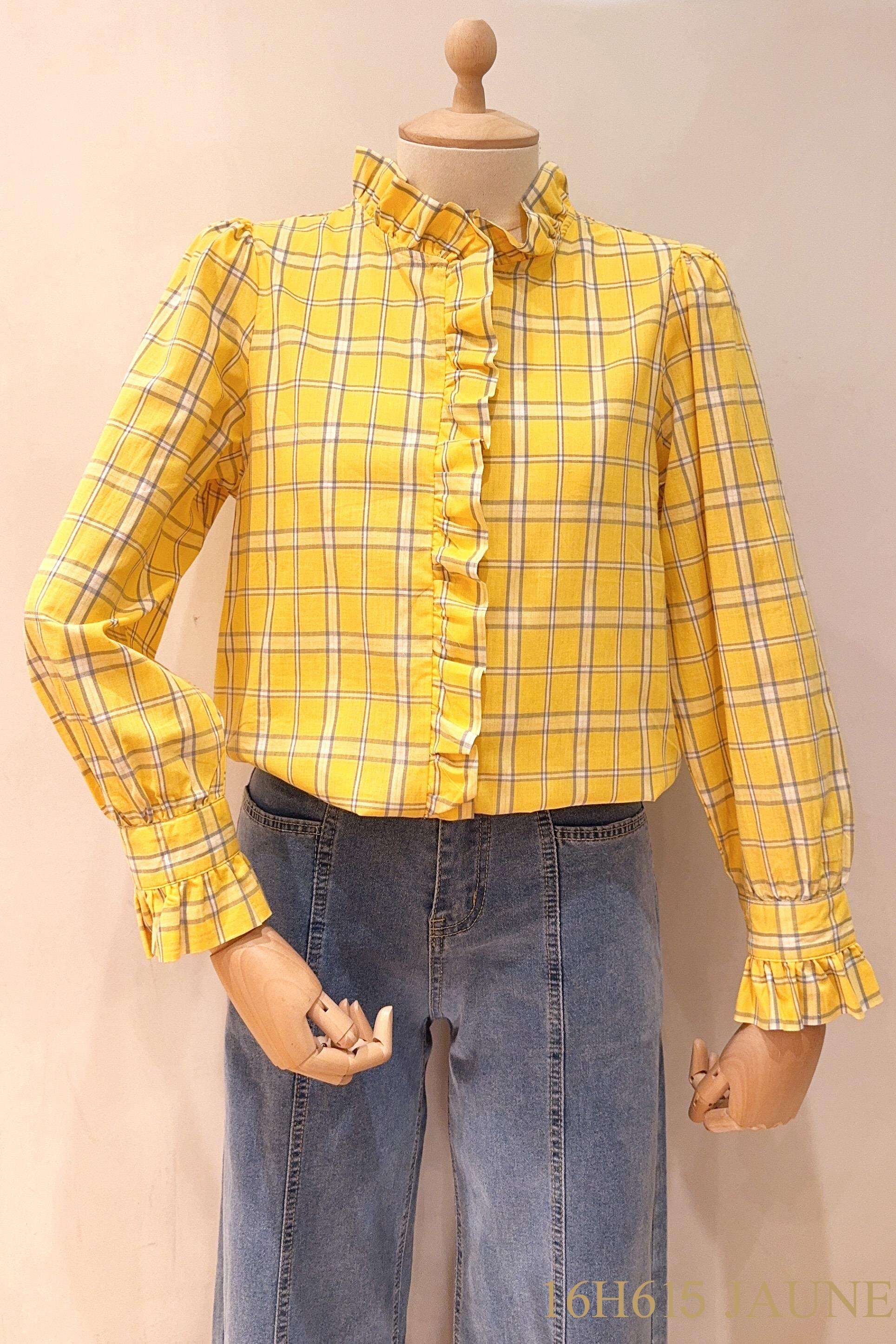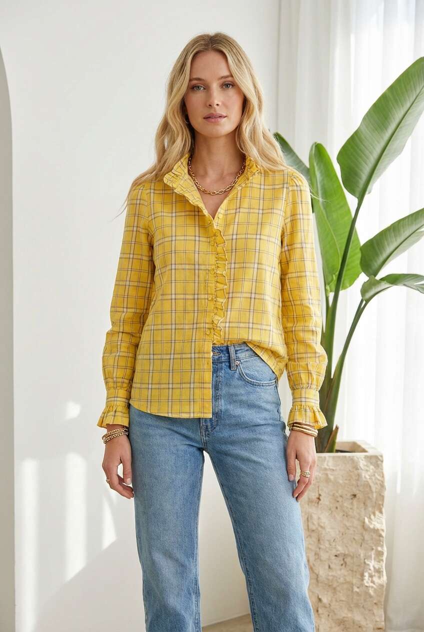 Modna koszula w kratę z subtelnymi falbankami – wygodny, lekko taliowany krój i wyjątkowy styl na co dzień.